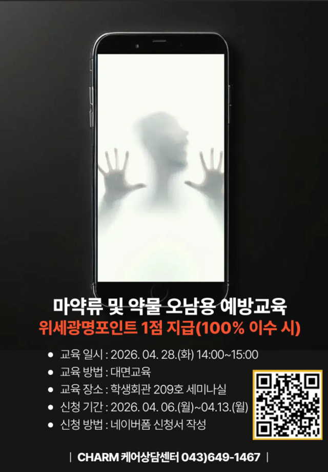 본문 시작 홈으로 학과생활 학과소개 교수소개 교과과정 학과생활 홈페이지가이드 사진게시판 공지사항 사진게시판 전공자료실 동아리 학과행사 사진게시판 페이스북 트위터 프린트 [CHARM케어상담센터] 2026학년도 1학기 "마약류 및 약물 오남용 예방교육" 실시 안내 아트앤산업디자인학과 39 2026-04-06 목록 이전[FABLAB] 3D펜을 나만의 키링 만들기 다음 [교양대학] 위세광명포인트 5점_ 2026학년도 1학기 “AI 활용능력 키우기” 수강생 모집 담당부서 : 산업디자인학과 담당자 : - 연락처 : 043-649-1436 최종수정일 : 2024-10-26 만족도조사 만족도 조사 이 페이지에서 제공하는 정보에 대하여 만족하시나요? 매우만족 만족 보통 불만족 매우불만족