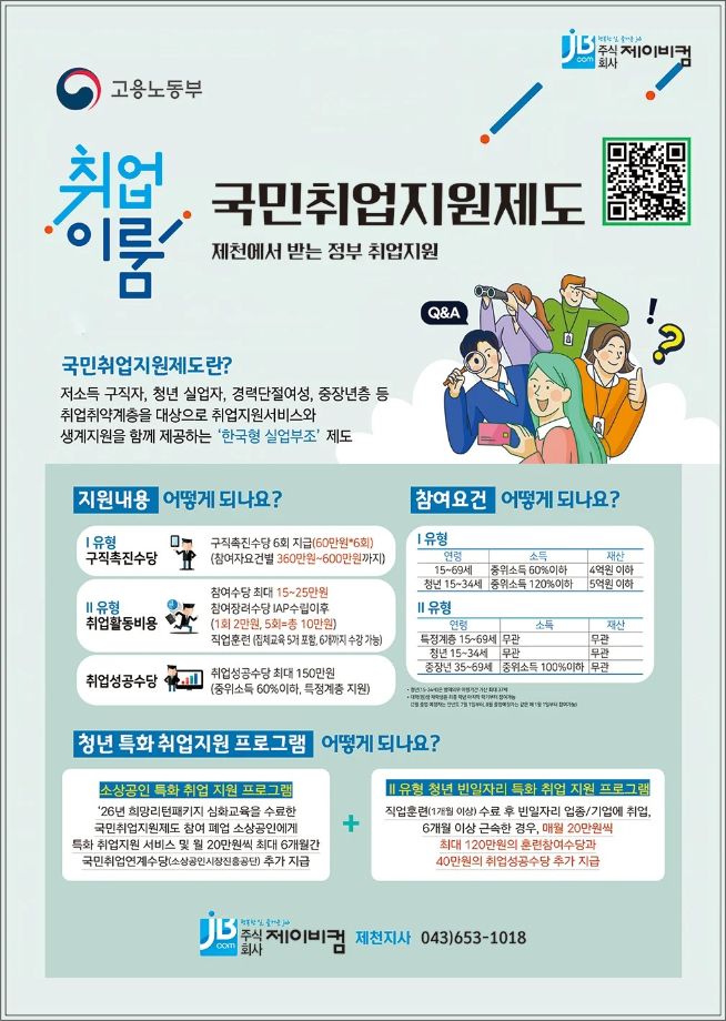 본문 시작 홈으로 학과생활 학과소개 교수소개 교과과정 학과생활 홈페이지가이드 사진게시판 공지사항 사진게시판 전공자료실 동아리 학과행사 사진게시판 페이스북 트위터 프린트 [취창업처] [2026대일플] 졸업(예정)자 대상 고용노동부 [국민취업지원제도] 사업 안내 아트앤산업디자인학과 57 2026-04-20 졸업(예정)자 대상 고용노동부 [국민취업지원제도] 사업 안내 1. 신청대상자 : 졸업(예정)자 2. 신청장소 : 대학일자리플러스센터 (학생회관 2층 202호) 3. 2026년부터는 구직촉진수당을 월 60만원으로 확대 지급 (구직촉진수당 6회 지급) 4. 국민취업지원제도 민간위탁기관 : 제이비컴 제천지사 043) 653-1018 목록 이전[기획실] 2026년 「긍정의+1」 다음 [CHARM케어상담센터 ] 2026학년도 1학기 알코올중독 예방교육 실시 담당부서 : 산업디자인학과 담당자 : - 연락처 : 043-649-1436 최종수정일 : 2024-10-26 만족도조사 만족도 조사 이 페이지에서 제공하는 정보에 대하여 만족하시나요? 매우만족 만족 보통 불만족 매우불만족