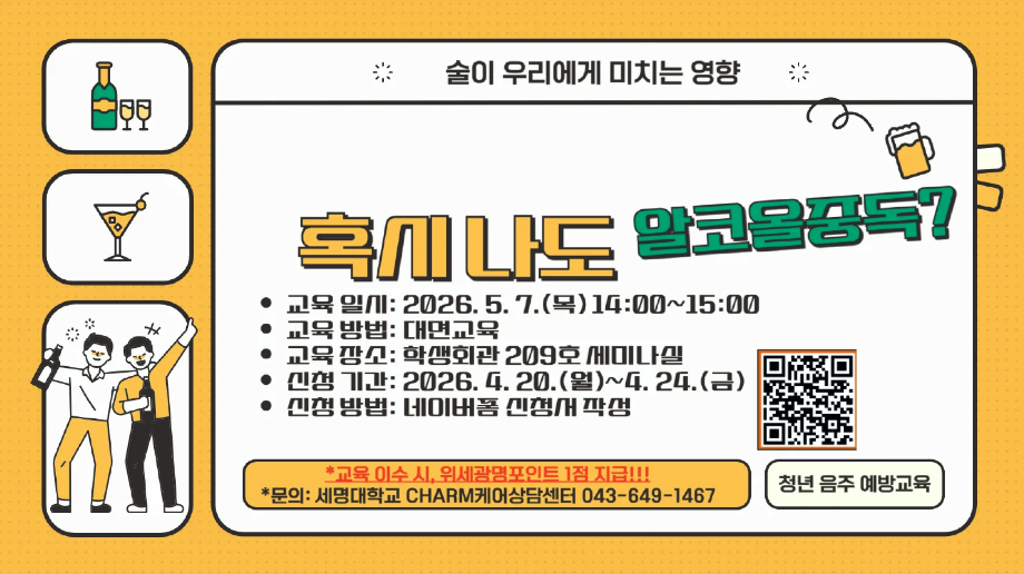 본문 시작 홈으로 학과생활 학과소개 교수소개 교과과정 학과생활 홈페이지가이드 사진게시판 공지사항 사진게시판 전공자료실 동아리 학과행사 사진게시판 페이스북 트위터 프린트 [CHARM케어상담센터 ] 2026학년도 1학기 알코올중독 예방교육 실시 아트앤산업디자인학과 60 2026-04-20 목록 이전[취창업처] [2026대일플] 졸업(예정)자 대상 고용노동부 [국민취업지원제도] 사업 안내 다음 [학술정보원] 개인정보 유출등 사고에 대응하는 절차 안내 담당부서 : 산업디자인학과 담당자 : - 연락처 : 043-649-1436 최종수정일 : 2024-10-26 만족도조사 만족도 조사 이 페이지에서 제공하는 정보에 대하여 만족하시나요? 매우만족 만족 보통 불만족 매우불만족