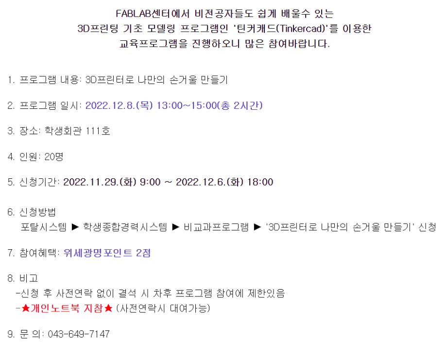 본문 시작 홈으로 학과생활 학과소개 교수소개 교과과정 학과생활 홈페이지가이드 사진게시판 공지사항 사진게시판 전공자료실 동아리 학과행사 사진게시판 페이스북 트위터 프린트 [FABLAB] 3D 프린터로 나만의 손거울 만들기 산업디자인학과 2867 2022-11-29 목록 이전[학술특강]성공하는 디자인 조건_Hitachi-LG DATA 디자인팀_우*호 팀장 다음 [FABLAB] 3D프린터를 활용한 지역-대학 협력형 평생교육 담당부서 : 산업디자인학과 담당자 : - 연락처 : 043-649-1436 최종수정일 : 2024-10-26 만족도조사 만족도 조사 이 페이지에서 제공하는 정보에 대하여 만족하시나요? 매우만족 만족 보통 불만족 매우불만족