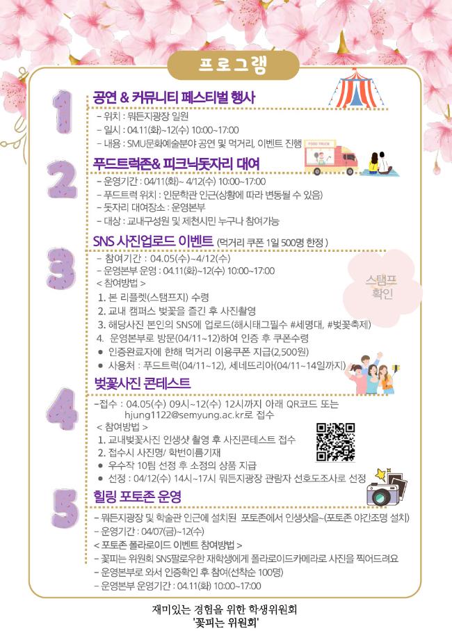 본문 시작 홈으로 학과생활 학과소개 교수소개 교과과정 학과생활 홈페이지가이드 사진게시판 공지사항 사진게시판 전공자료실 동아리 학과행사 사진게시판 페이스북 트위터 프린트 [세명대] 세명대학교 제2회 벚꽃축제(벚꽃세봄) 행사 산업디자인학과 2879 2023-04-04 목록 이전[세명대] 제천시 명물 세명대 벚꽃축제 다음 [FABLAB] 식목일 기념 3D프린터로 식목일 화분 만들기 담당부서 : 산업디자인학과 담당자 : - 연락처 : 043-649-1436 최종수정일 : 2024-10-26 만족도조사 만족도 조사 이 페이지에서 제공하는 정보에 대하여 만족하시나요? 매우만족 만족 보통 불만족 매우불만족