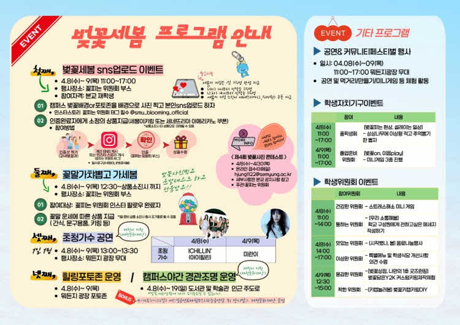 본문 시작 홈으로 학과생활 학과소개 교수소개 교과과정 학과생활 홈페이지가이드 사진게시판 공지사항 사진게시판 전공자료실 동아리 학과행사 사진게시판 페이스북 트위터 프린트 [벗꽃축제] 제 5회 세명대학교 벚꽃축제 '벚꽃세봄' 개최 아트앤산업디자인학과 52 2026-04-03 목록 이전[학생처] 우리 대학 '텃밭 가꾸기' 프로그램(분양) 안내 담당부서 : 산업디자인학과 담당자 : - 연락처 : 043-649-1436 최종수정일 : 2024-10-26 만족도조사 만족도 조사 이 페이지에서 제공하는 정보에 대하여 만족하시나요? 매우만족 만족 보통 불만족 매우불만족