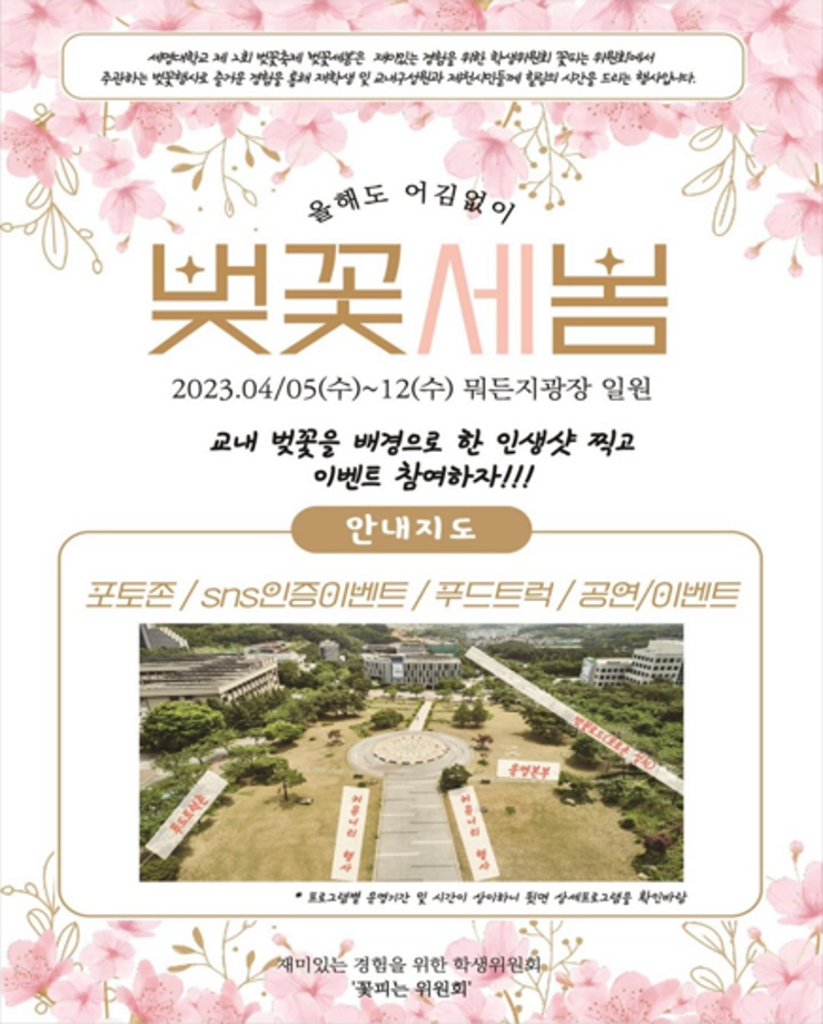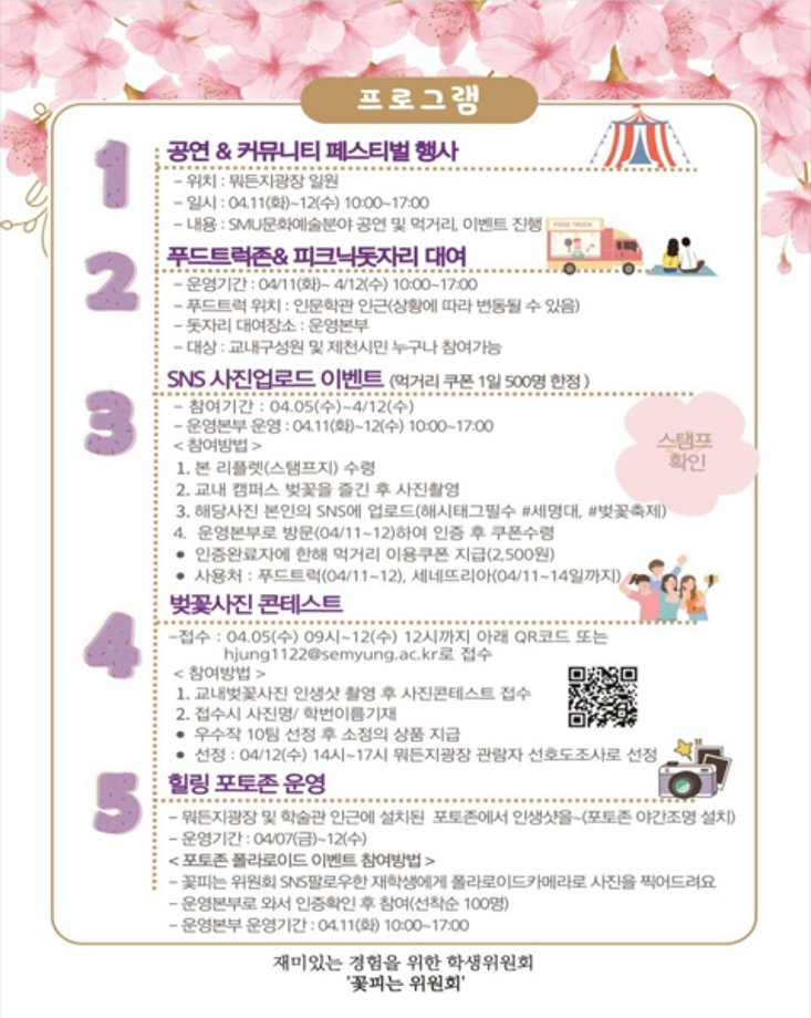 본문 시작 홈으로 커뮤니티 학과소개 교수소개 학과과정 커뮤니티 대학원 홈페이지가이드 포토갤러리 공지사항 채용정보 포토갤러리 Youtube 바로가기 Instargram 바로가기 Blog 바로가기 Facebook 바로가기 포토갤러리 페이스북 트위터 프린트 🌸 벚꽃세봄 🌸 뷰티케어학 2495 2023-04-04 일정 : 2023.04.05 (수) ~ 2023.04.12 (수) 장소 : 뭐든지 광장 일원 🌸 세명대학교가 제2회 벚꽃축제 “벚꽃세봄”은 재미있는 경험을 위한 학생위원회 ‘꽃피는 위원회’에서 주관하는 벚꽃 행사입니다! 재학생 및 교내 구성원과 제천시민 분들께 힐링을 드립니다 :) 🌸 벚꽃 사진 콘테스트, 포토존, 돗자리 대여, 즐거운 공연까지! 다양한 행사와 즐거움이 가득한 행사를 즐겨보세요😆 목록 다음 세명대학교 등록금 환불제 다음 🎊세명대학교 제 30회 청룡축전🎊