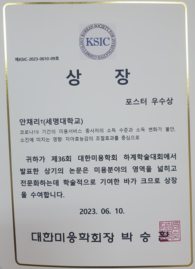 본문 시작 홈으로 커뮤니티 학과소개 교수소개 학과과정 커뮤니티 대학원 홈페이지가이드 포토갤러리 공지사항 채용정보 포토갤러리 Youtube 바로가기 Instargram 바로가기 Blog 바로가기 Facebook 바로가기 포토갤러리 페이스북 트위터 프린트 세명대 뷰티케어학과 안채리 교수, 제36회 대한미용학회 하계학술대회 포스터 우수상 수상 뷰티케어학 2990 2023-07-04 지난 6월 10일, 한국열린사이버대학교에서 대한미용학회(회장 박승환)가 주관하는 하계학술대회 및 전시회가 있었습니다. 이에 우리 학과 안채리 교수님이 '코로나19 기간의 미용서비스 종사자의 소득 수준과 소득 변화가 불안, 소진에 미치는 영향: 자아효능감의 조절효과를 중심으로'라는 제목으로 포스터를 발표하시어, 포스터 우수상을 수상하셨습니다😃👍 목록 이전♦피부 실습실 소개♦ 다음 세명고등학교 입시박람회