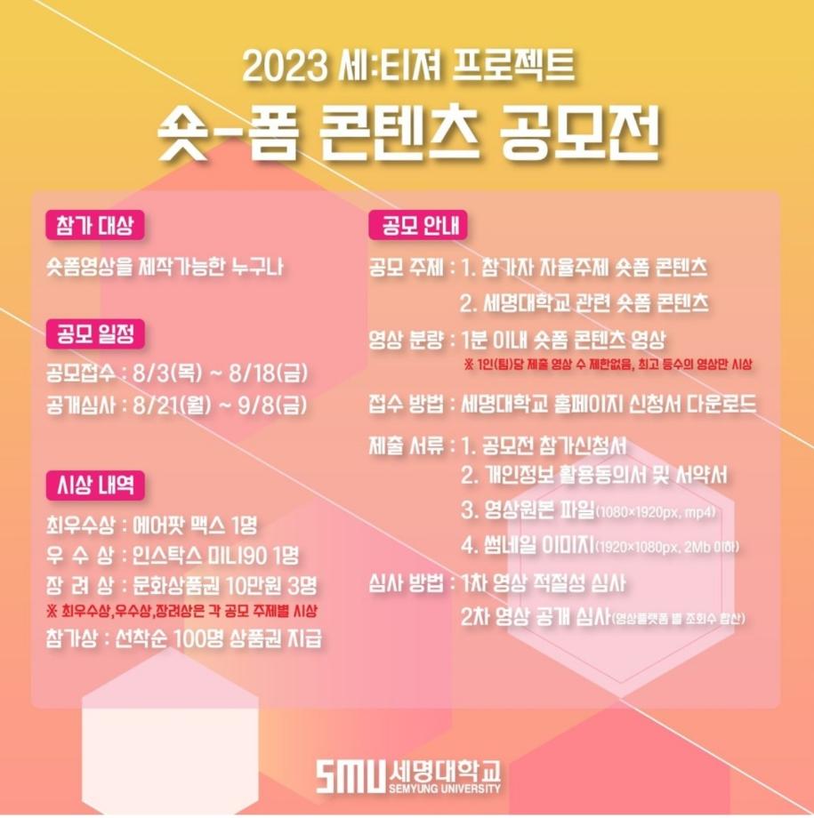 본문 시작 홈으로 커뮤니티 학과소개 교수소개 학과과정 커뮤니티 대학원 홈페이지가이드 포토갤러리 공지사항 채용정보 포토갤러리 Youtube 바로가기 Instargram 바로가기 Blog 바로가기 Facebook 바로가기 포토갤러리 페이스북 트위터 프린트 2023 세:티져 프로젝트 숏폼 콘텐츠 공모전 뷰티케어학 2651 2023-08-03 2023 세:티져 프로젝트 숏폼 콘텐츠 공모전 숏폼영상을 만들 수 있는 누구나 참여가능!! 세명대학교와 관련한 주제 또는 일상에서의 자율주제로 영상을 제작하여 공모전에 참여하고, 에어팟맥스, 인스탁스, 문화상품권 등 다양한 상품을 받아가 보세요~ 목록 다음 🌻2023년도 2학기 수강신청 안내 🌻 다음 청주 더한 뷰티 미용학원 입시설명회