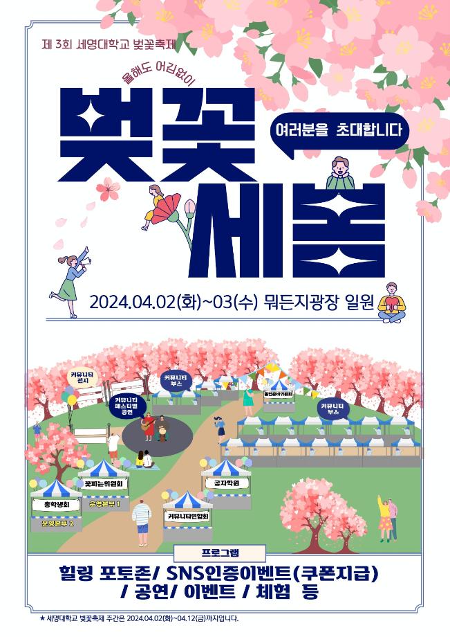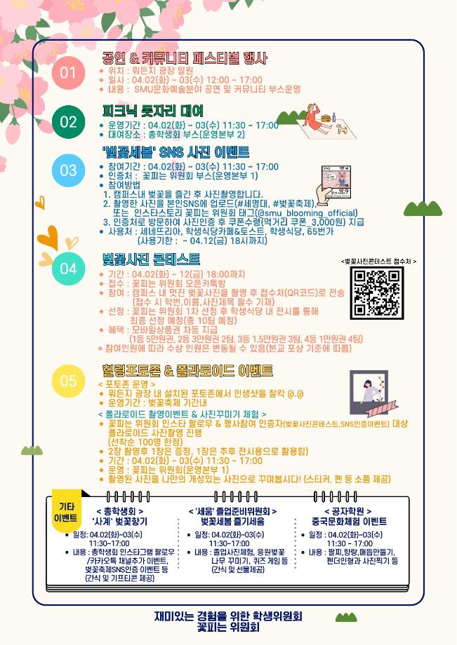 본문 시작 홈으로 커뮤니티 학과소개 교수소개 학과과정 커뮤니티 대학원 홈페이지가이드 포토갤러리 공지사항 채용정보 포토갤러리 Youtube 바로가기 Instargram 바로가기 Blog 바로가기 Facebook 바로가기 포토갤러리 페이스북 트위터 프린트 벚꽃세봄✨ 뷰티케어학 2023 2024-04-01 4월 2~3일, 봄을 맞아 새로운 행사가 열립니다! 여러 부스 활동들과 먹거리, 공연등이 펼쳐지니 많은 관심과 참여 부탁드립니다🩷 전시,부스 종류와 공연시간등을 잘 참고하셔서 즐기시길 바래요✨ 전시-10:00~17:00 부스-11:30~17:00 공연-14:00~16:00 📍뭐든지 광장 (위치는 지도 참고) 목록 이전커뮤니티 페스티벌✨ 다음 세명진로 festival 도전 특강: ‘레드오션에서 브랜드로 성공하는 마케팅’