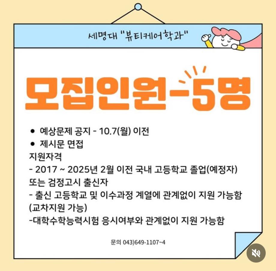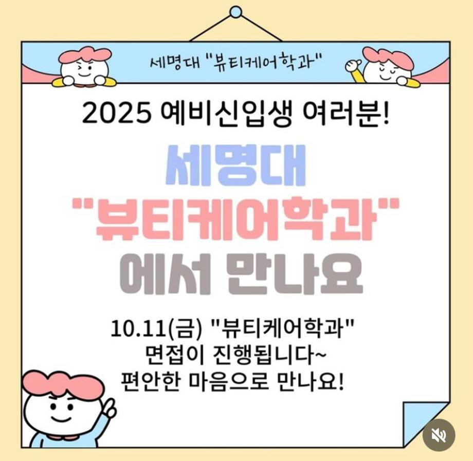 본문 시작 홈으로 커뮤니티 학과소개 교수소개 학과과정 커뮤니티 대학원 홈페이지가이드 포토갤러리 공지사항 채용정보 포토갤러리 Youtube 바로가기 Instargram 바로가기 Blog 바로가기 Facebook 바로가기 포토갤러리 페이스북 트위터 프린트 📣 2025 세명대학교 “뷰티케어학과” 면접우수자전형 면접 일정 📣 바이오코스메틱학과 1872 2024-10-02 📣 2025 세명대학교 “뷰티케어학과” 면접우수자전형 면접 일정 📣 면접우수자전형 면접은 10.11(금) 입니다!! 많은 관심과 지원 부탁드리겠습니다!! 2025 예비 세명인 여러분 “뷰티케어학과” 에서 만나요🫶🏻🫶🏻 목록 이전면접 우수자 전형 다음 헤어기초커트1