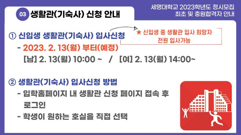 입학홈페이지 --> 생활관 신청 페이지 --> 로그인 --> 학생이 원하는 호실 직접 선택