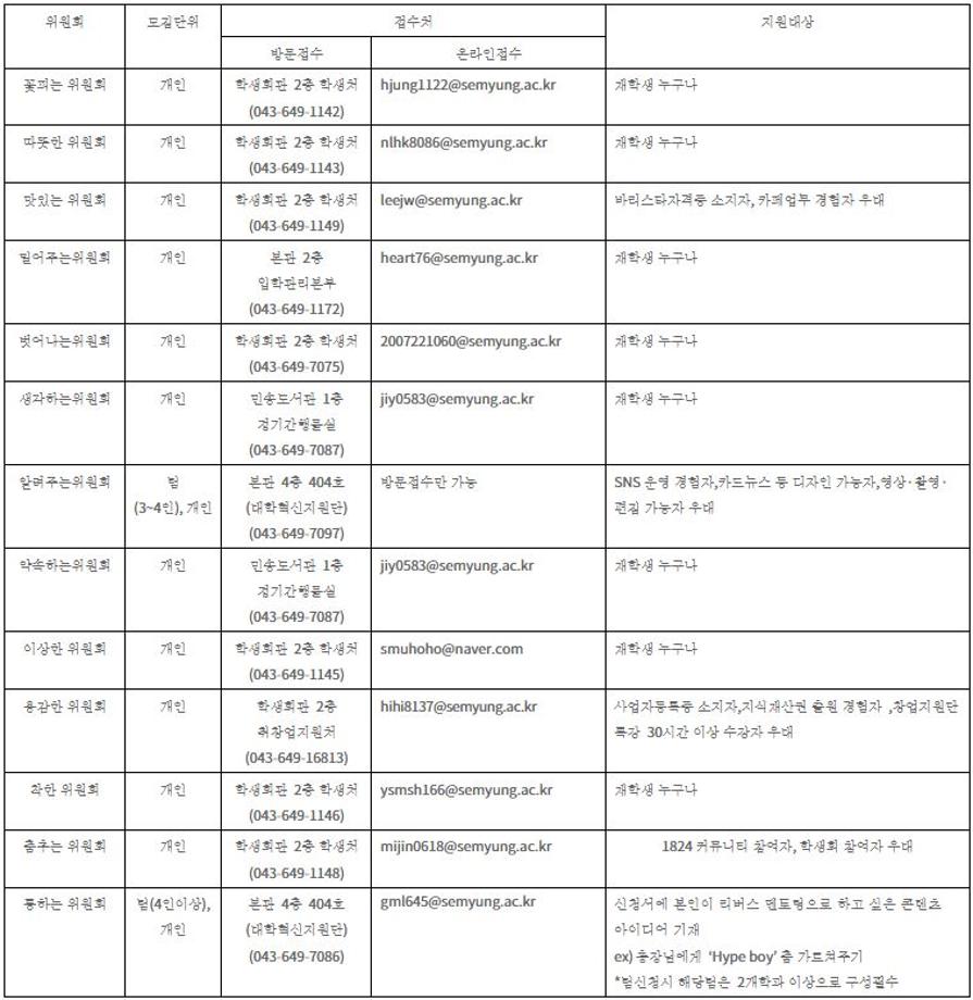 본문 시작 홈으로 커뮤니티 학과소개 입학정보 교수소개 학과과정 커뮤니티 공연예매 안내 홈페이지가이드 포토갤러리 공지사항 포토갤러리 작품DB 동아리 학사일정 학생회 포토갤러리 페이스북 트위터 프린트 2023학년도 학생위원회 신규위원 모집 연기예술학과 2680 2023-03-15 2023학년도 학생위원회 신규위원 모집 목록 이전2023학년도 세명대학교 디지털 홍보 서포터즈 다음 2023학년도 대학생 청소년교육지원사업 장학생 모집 안내 담당부서 : 연기예술학과 담당자 : - 연락처 : 043-649-1733 최종수정일 : 2024-10-26 만족도조사 만족도 조사 이 페이지에서 제공하는 정보에 대하여 만족하시나요? 매우만족 만족 보통 불만족 매우불만족