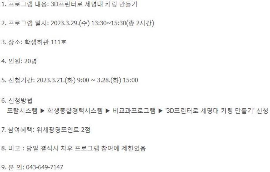 본문 시작 홈으로 커뮤니티 학과소개 입학정보 교수소개 학과과정 커뮤니티 공연예매 안내 홈페이지가이드 포토갤러리 공지사항 포토갤러리 작품DB 동아리 학사일정 학생회 포토갤러리 페이스북 트위터 프린트 3D 프린터로 세명대 키링 만들기 연기예술학과 2708 2023-03-20 3D 프린터로 세명대 키링 만들기 목록 이전2023학년도 1학기 FUN러닝프렌즈 다음 극단 각인각색 인큐베이팅 공연 - 3/4 (사분의 삼) 공연 성료 담당부서 : 연기예술학과 담당자 : - 연락처 : 043-649-1733 최종수정일 : 2024-10-26 만족도조사 만족도 조사 이 페이지에서 제공하는 정보에 대하여 만족하시나요? 매우만족 만족 보통 불만족 매우불만족