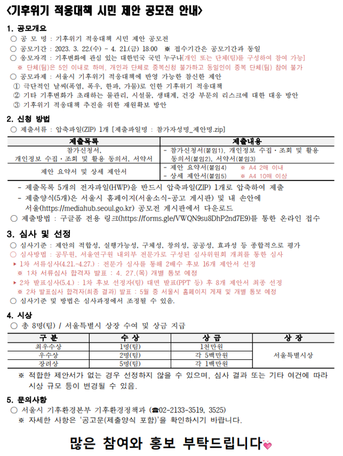 본문 시작 홈으로 커뮤니티 학과소개 입학정보 교수소개 학과과정 커뮤니티 공연예매 안내 홈페이지가이드 포토갤러리 공지사항 포토갤러리 작품DB 동아리 학사일정 학생회 포토갤러리 페이스북 트위터 프린트 「기후위기 적응대책 시민 제안 공모전」 안내 연기예술학과 2769 2023-04-13 「기후위기 적응대책 시민 제안 공모전」 안내 목록 이전2023학년도제8회 장애인식개선 UCC 공모전 시행 안내 다음 농촌신활력플러스사업 점프-업 액션그룹 양성 프로그램 도움닫기 과정 모집 담당부서 : 연기예술학과 담당자 : - 연락처 : 043-649-1733 최종수정일 : 2024-10-26 만족도조사 만족도 조사 이 페이지에서 제공하는 정보에 대하여 만족하시나요? 매우만족 만족 보통 불만족 매우불만족