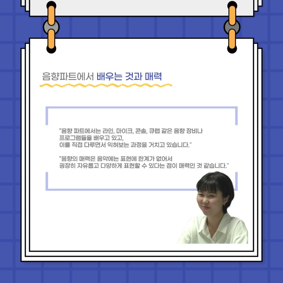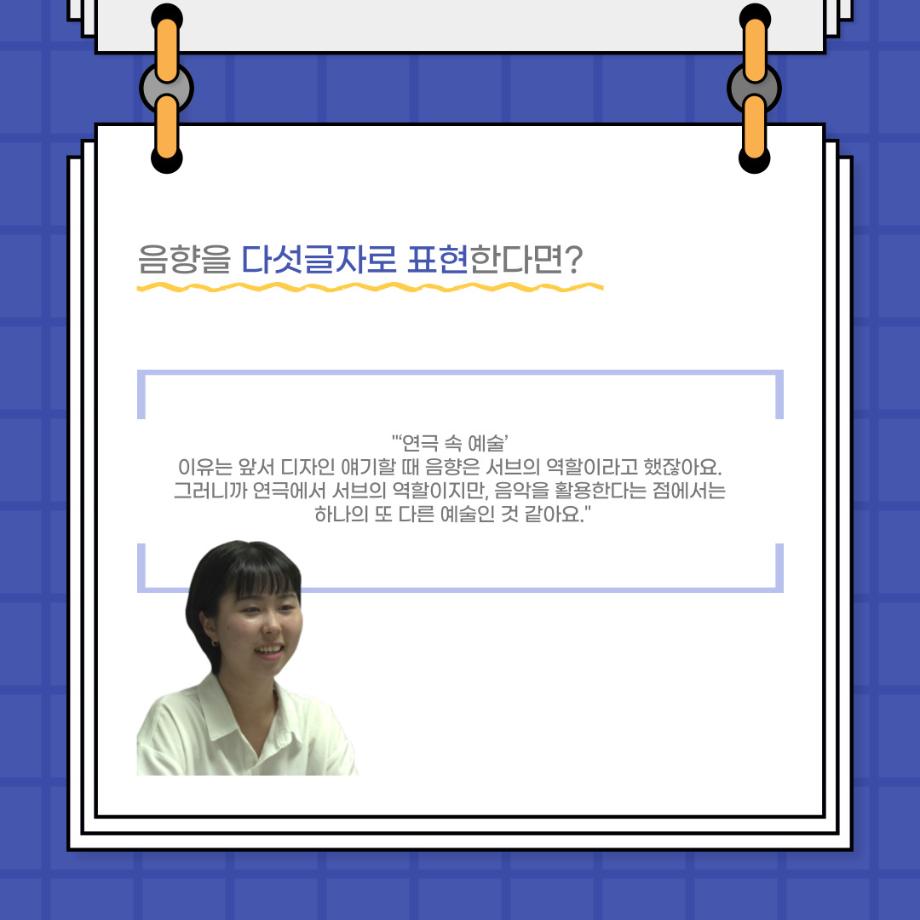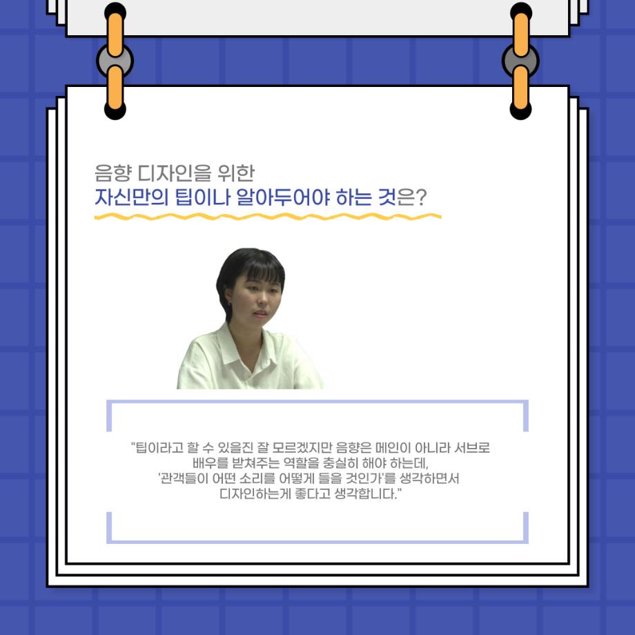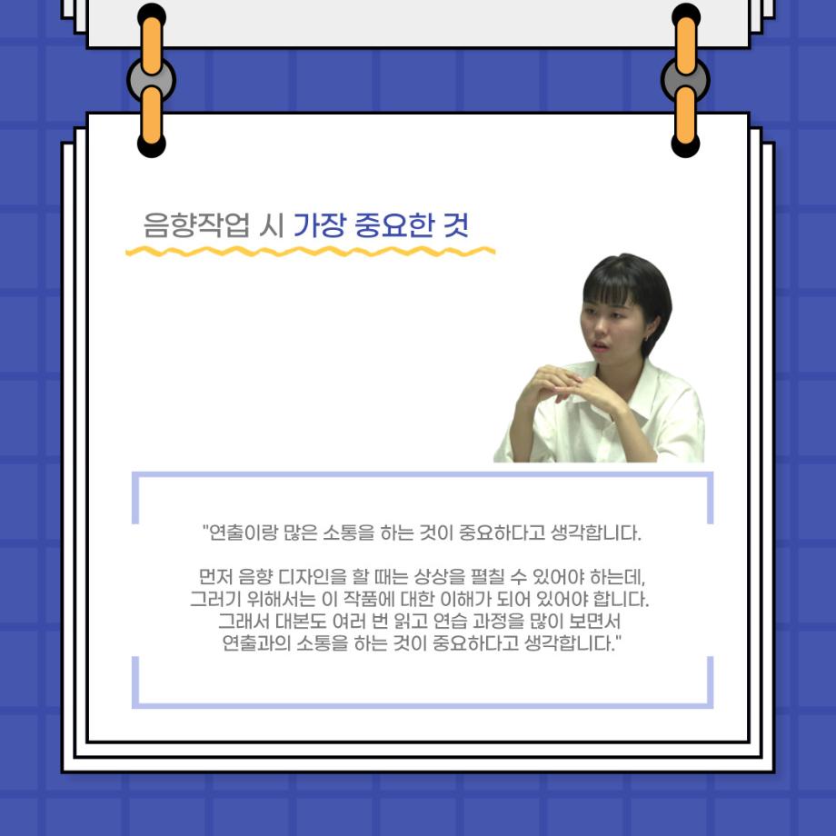 본문 시작 홈으로 커뮤니티 학과소개 입학정보 교수소개 학과과정 커뮤니티 공연예매 안내 홈페이지가이드 포토갤러리 공지사항 포토갤러리 작품DB 동아리 학사일정 학생회 포토갤러리 페이스북 트위터 프린트 사이와의 인터뷰 - 23년도 음향장 ‘최희진‘ 연기예술학과 3344 2023-07-24 안녕하십니까! 23년도 학회 ‘사이’입니다! 학회 ‘사이’의 다섯번째 인터뷰로 연기예술학과 23년도 음향장인 최희진 학생과 인터뷰하는 시간을 가졌습니다! 이번 인터뷰에서는 음향에 대한 매력과 음향 작업에서 가장 중요한 것, 음향 작업에서 알아두어야 하는 것 등에 대해 인터뷰하였습니 앞으로 있을 인터뷰 컨텐츠 ‘사인’도 많은 사랑 부탁드립니다. 목록 이전제 97회 세명대학교 연기예술학과 정기공연 하계 프로젝트 < 첼로와 케찹 > 다음 제 98회 세명대학교 연기예술학과 정기공연 하계 프로젝트 - < 하녀들 > 담당부서 : 연기예술학과 담당자 : - 연락처 : 043-649-1733 최종수정일 : 2024-10-26 만족도조사 만족도 조사 이 페이지에서 제공하는 정보에 대하여 만족하시나요? 매우만족 만족 보통 불만족 매우불만족