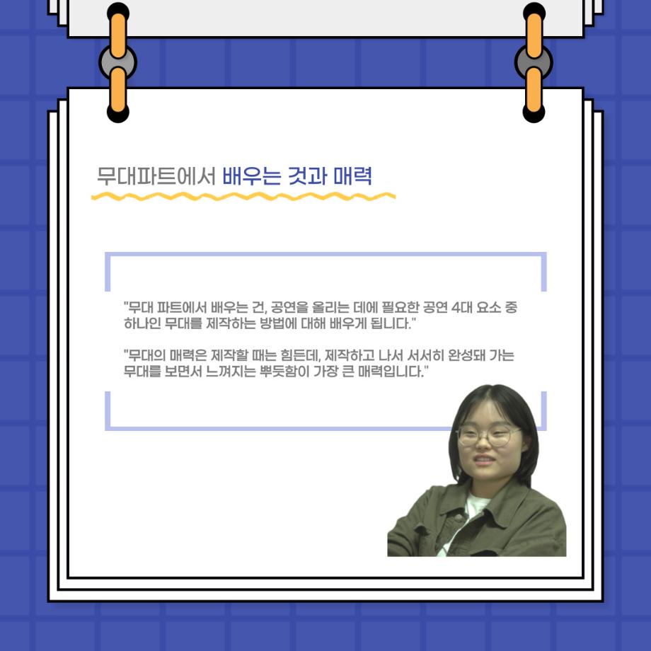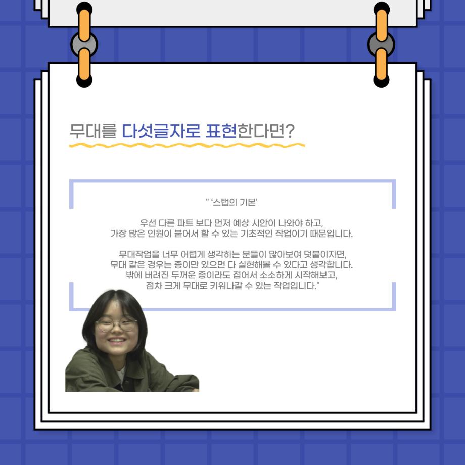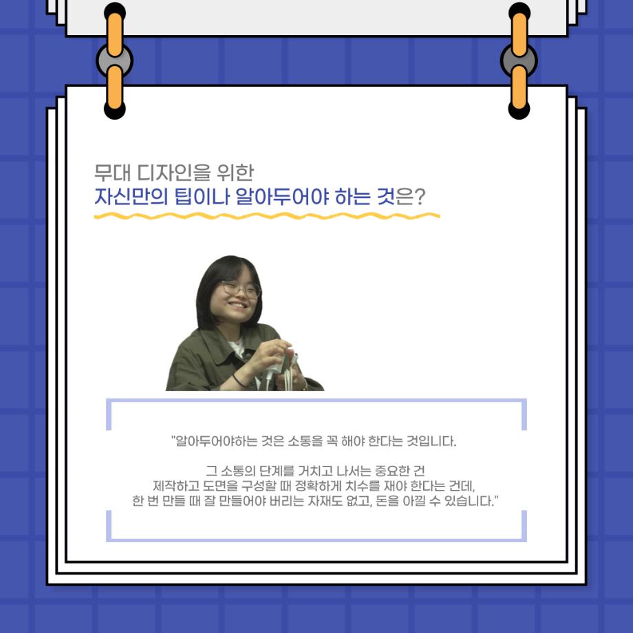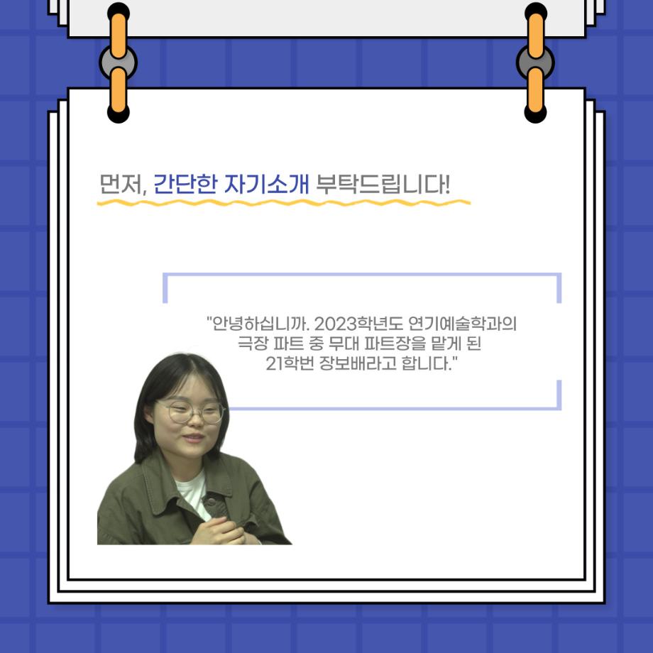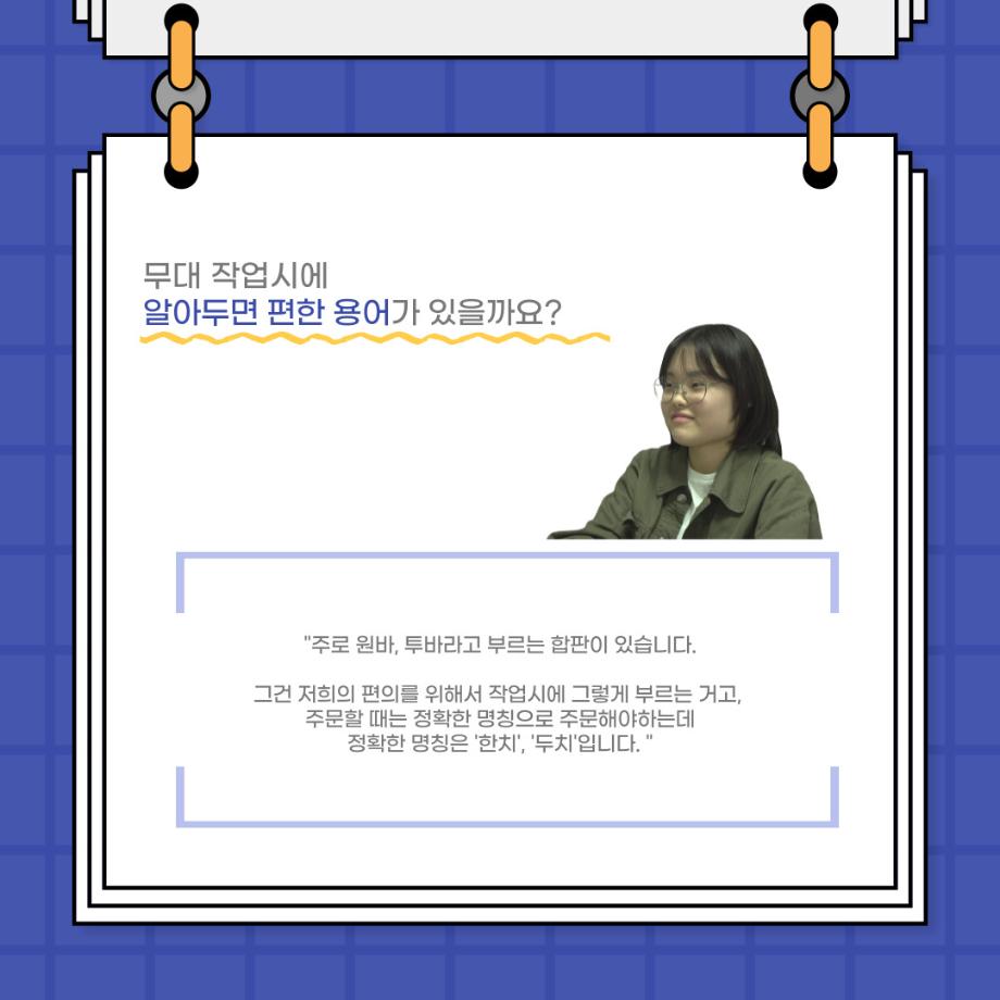 본문 시작 홈으로 커뮤니티 학과소개 입학정보 교수소개 학과과정 커뮤니티 공연예매 안내 홈페이지가이드 포토갤러리 공지사항 포토갤러리 작품DB 동아리 학사일정 학생회 포토갤러리 페이스북 트위터 프린트 사이와의 인터뷰 - 23년도 무대장 ‘장보배‘ 연기예술학과 3850 2023-08-21 안녕하십니까! 23년도 학회 ‘사이’입니다! 학회 ‘사이’의 일곱번째 인터뷰로 연기예술학과 23년도 무대장인 장보배 학생과 인터뷰하는 시간을 가졌습니다. 이번 인터뷰에서는 무대 파트의 매력과 무대 작업시 가장 중요한 것, 무대 작업에서 알아두어야 하는 것 등에 대해 인터뷰하였습니다. 다음 인터뷰 컨텐츠 ‘사인’도 많은 사랑 부탁드립니다. 목록 이전제 96회 세명대학교 연기예술학과 정기공연 하계 프로젝트 - < d0nut > 다음 제 97회 세명대학교 연기예술학과 정기공연 '하계 프로젝트' < 첼로와 케찹 > 담당부서 : 연기예술학과 담당자 : - 연락처 : 043-649-1733 최종수정일 : 2024-10-26 만족도조사 만족도 조사 이 페이지에서 제공하는 정보에 대하여 만족하시나요? 매우만족 만족 보통 불만족 매우불만족