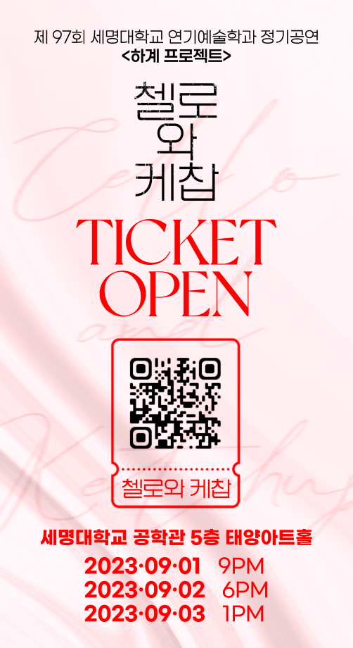 본문 시작 홈으로 커뮤니티 학과소개 입학정보 교수소개 학과과정 커뮤니티 공연예매 안내 홈페이지가이드 포토갤러리 공지사항 포토갤러리 작품DB 동아리 학사일정 학생회 포토갤러리 페이스북 트위터 프린트 제 97회 세명대학교 연기예술학과 정기공연 '하계 프로젝트' < 첼로와 케찹 > 연기예술학과 4051 2023-08-24 제 97회 세명대학교 연기예술학과 정기공연 '하계 프로젝트' < 첼로와 케찹 > 캐릭터 포스터 입니다. 𝑪𝒆𝒍𝒍𝒐 𝒂𝒏𝒅 𝑲𝒆𝒕𝒄𝒉𝒖𝒑 𝟐𝟎𝟐𝟑•𝟎𝟗•𝟎𝟏 𝟗𝐏𝐌 𝟐𝟎𝟐𝟑•𝟎𝟗•𝟎𝟐 𝟔𝐏𝐌 𝟐𝟎𝟐𝟑•𝟎𝟗•𝟎𝟑 𝟏𝐏𝐌 세명대학교 공학관 5층 태양아트홀 - 2023.08.19 - 2023.09.11 첫 번째 작품 | d0nut 두 번째 작품 | 첼로와 케찹 세 번째 작품 | 하녀들 여러분들의 많은 관심과 참여 부탁드립니다. 목록 이전사이와의 인터뷰 - 23년도 무대장 ‘장보배‘ 다음 제5회 세명진로 Festival 개최 안내 담당부서 : 연기예술학과 담당자 : - 연락처 : 043-649-1733 최종수정일 : 2024-10-26 만족도조사 만족도 조사 이 페이지에서 제공하는 정보에 대하여 만족하시나요? 매우만족 만족 보통 불만족 매우불만족
