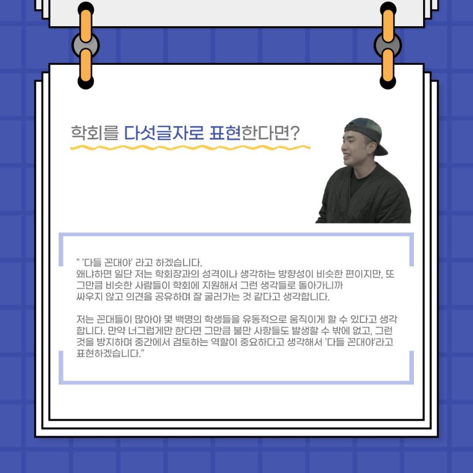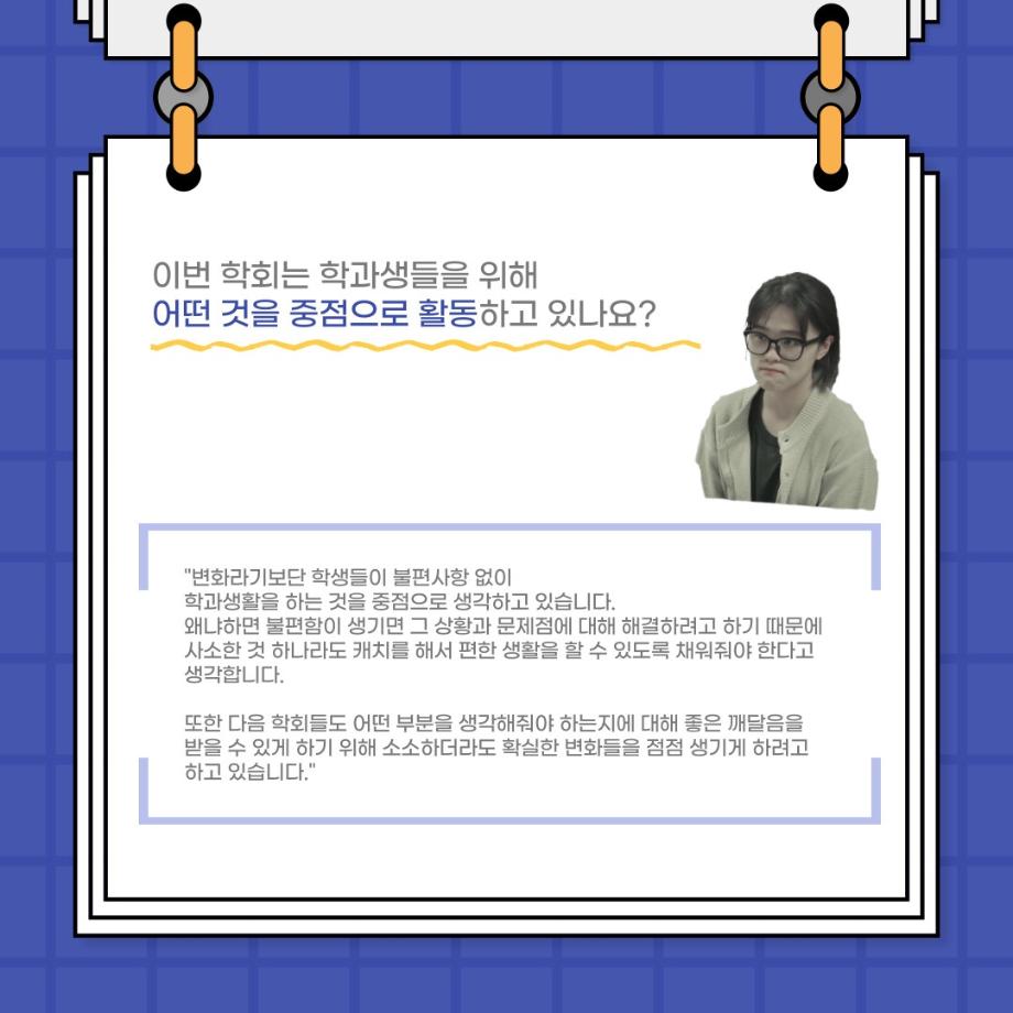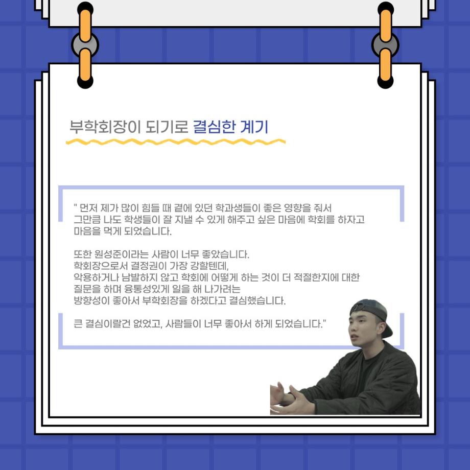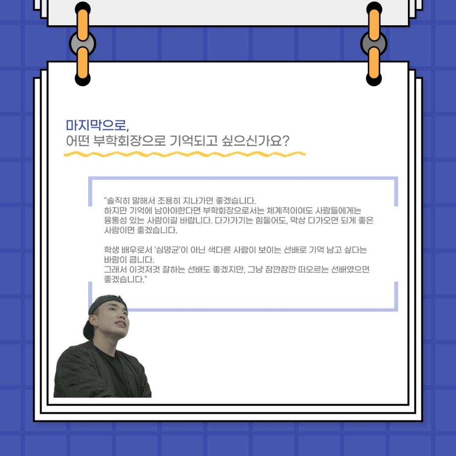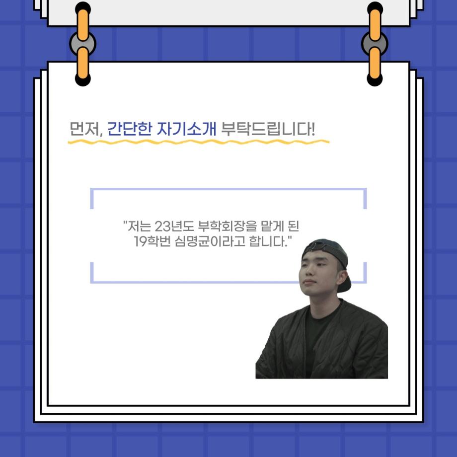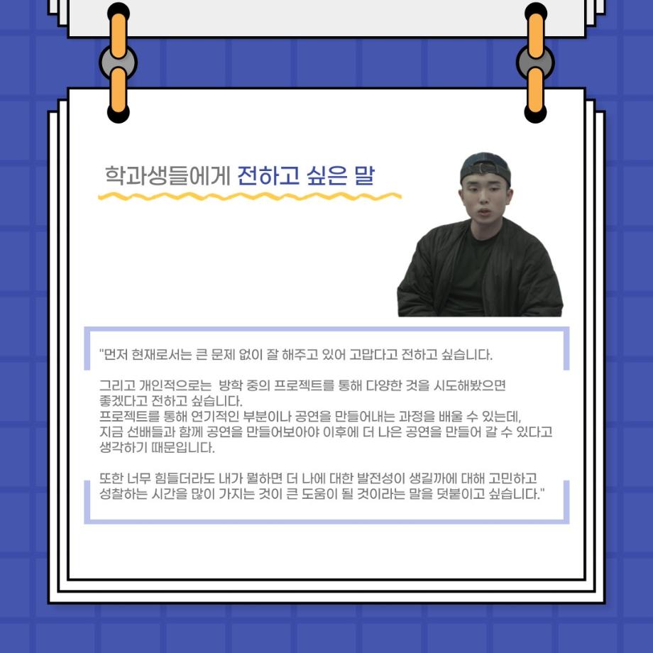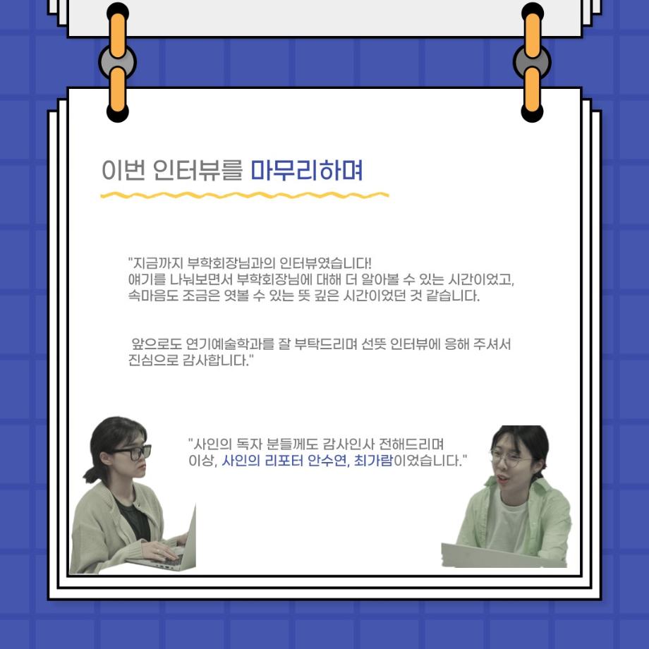 본문 시작 홈으로 커뮤니티 학과소개 입학정보 교수소개 학과과정 커뮤니티 공연예매 안내 홈페이지가이드 포토갤러리 공지사항 포토갤러리 작품DB 동아리 학사일정 학생회 포토갤러리 페이스북 트위터 프린트 사이와의 인터뷰 - 23년도 부학회장 ‘심명균’ 연기예술학과 3324 2023-06-07 안녕하십니까. 23년도 학회 ‘사이’입니다! 학회 ‘사이’의 두번째 인터뷰로 연기예술학과 23년도 부학회장인 심명균 부학회장과 인터뷰하는 시간을 가졌습니다. 학회를 맡은 소감과 부학회장이 되기로 결심한 계기, 학과생들에게 전하고 싶은 말 등 다양한 인터뷰를 진행하였습니다. 다음 인터뷰 컨텐츠 ‘사인’도 많은 사랑 부탁드립니다. 목록 다음 제 97회 세명대학교 연기예술학과 정기공연 '하계 프로젝트' < 첼로와 케찹 > 캐릭터 포스터 다음 사이와의 인터뷰 - 23년도 무대사수 ‘이종화’ 담당부서 : 연기예술학과 담당자 : - 연락처 : 043-649-1733 최종수정일 : 2024-10-26 만족도조사 만족도 조사 이 페이지에서 제공하는 정보에 대하여 만족하시나요? 매우만족 만족 보통 불만족 매우불만족