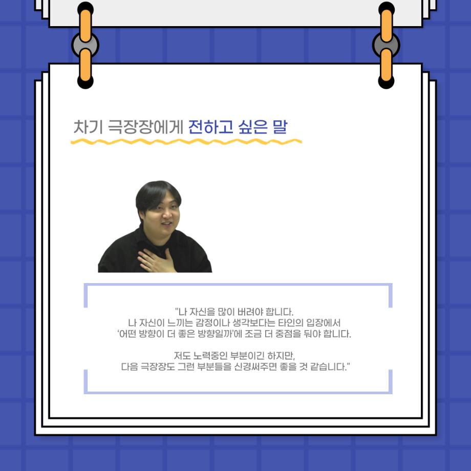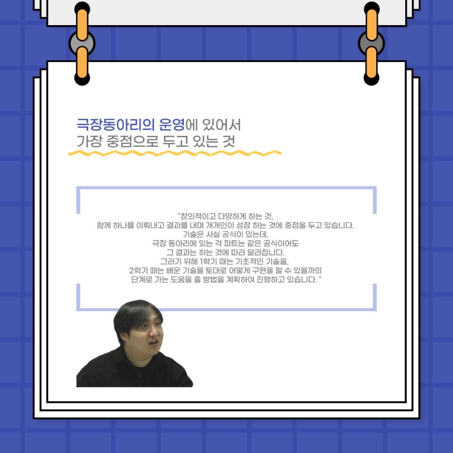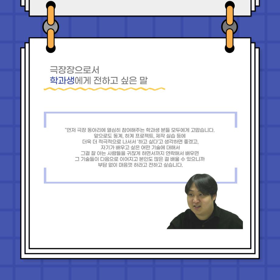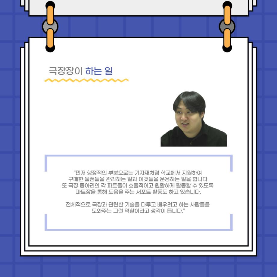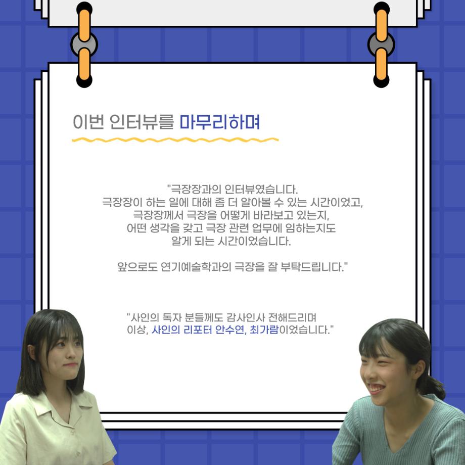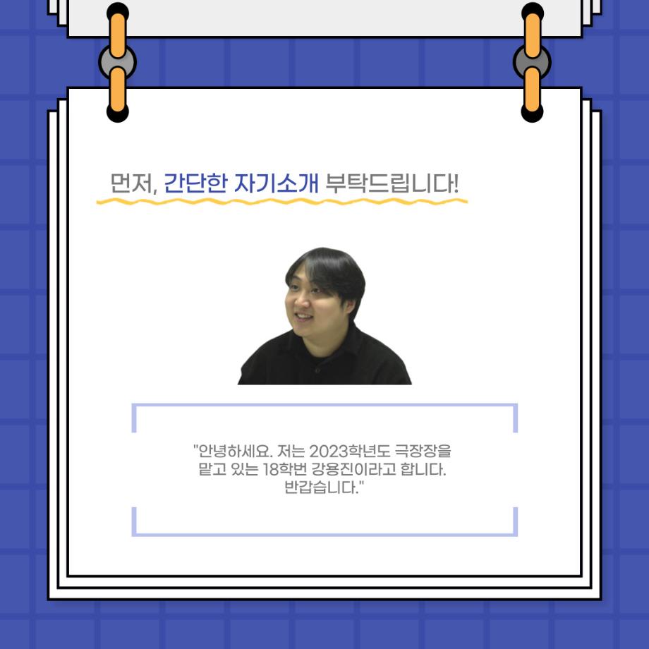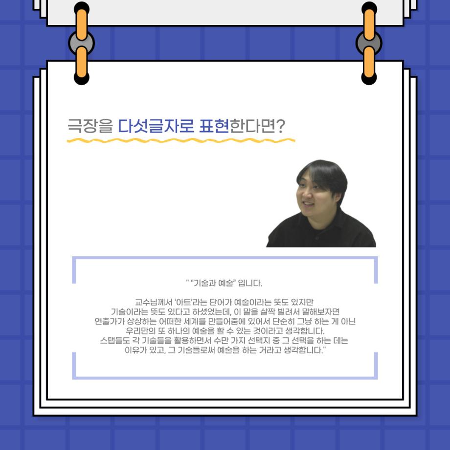 본문 시작 홈으로 커뮤니티 학과소개 입학정보 교수소개 학과과정 커뮤니티 공연예매 안내 홈페이지가이드 포토갤러리 공지사항 포토갤러리 작품DB 동아리 학사일정 학생회 포토갤러리 페이스북 트위터 프린트 사이와의 인터뷰 - 23년도 극장장 ‘강용진‘ 연기예술학과 3565 2023-11-22 안녕하십니까. 23년도 학회 ‘사이’입니다! 학회 ‘사이’의 열한번째 인터뷰로 연기예술학과 23년도 극장장인 강용진 학생과 인터뷰하는 시간을 가졌습니다. 이번 인터뷰에서는 극장장이 하는 일과 차기 극장장에게 한 마디, 극장 동아리 운영에 있어 중점적으로 생각하는 것 등에 대해 인터뷰하였습니다. 다음 인터뷰 컨텐츠 ‘사인’도 많은 사랑 부탁드립니다. 목록 이전제 16회 세명대학교 연기예술학과 졸업작품 <썬샤인의 전사들> 공연 성료 다음 제100회 세명대학교 연기예술학과 정기공연 2학년 <중급연기 관찰발표회> 스틸컷 담당부서 : 연기예술학과 담당자 : - 연락처 : 043-649-1733 최종수정일 : 2024-10-26 만족도조사 만족도 조사 이 페이지에서 제공하는 정보에 대하여 만족하시나요? 매우만족 만족 보통 불만족 매우불만족