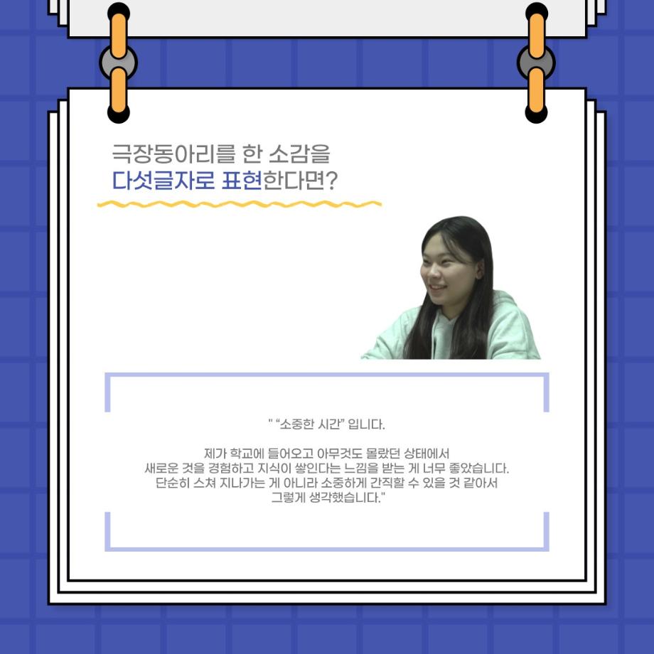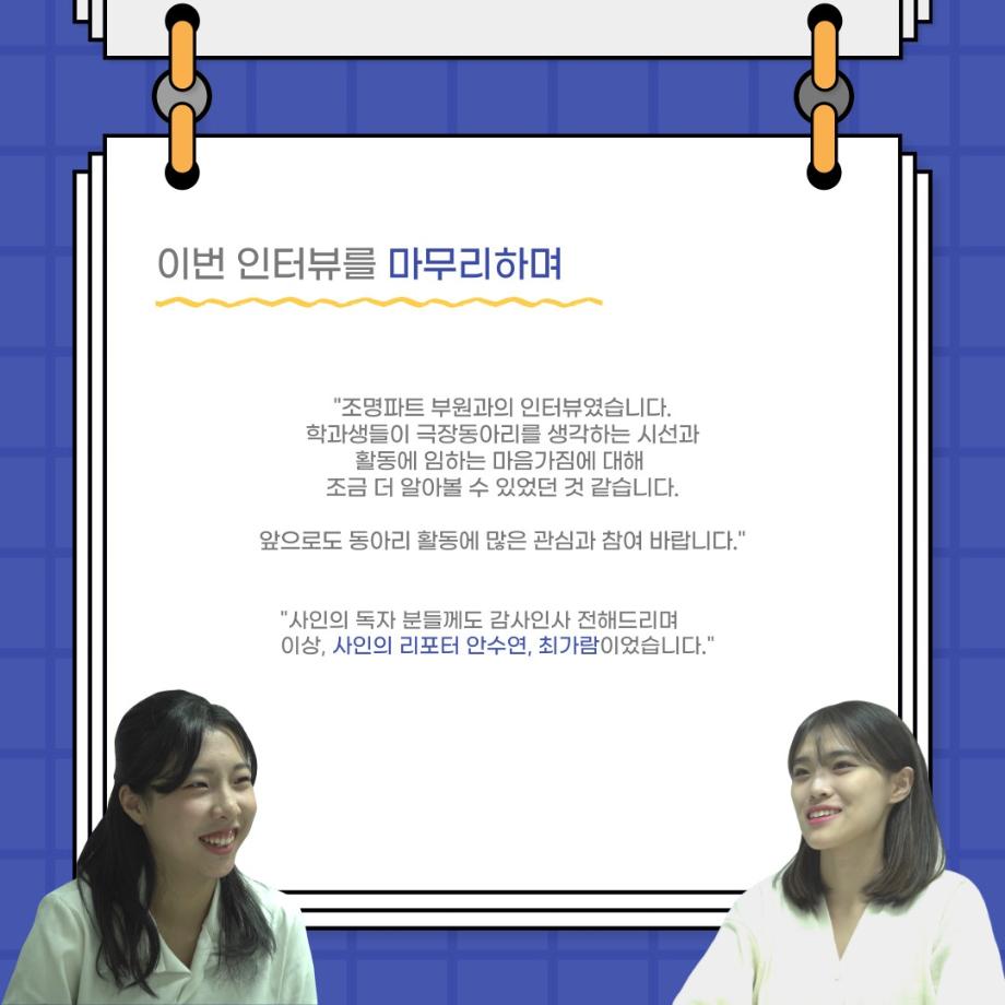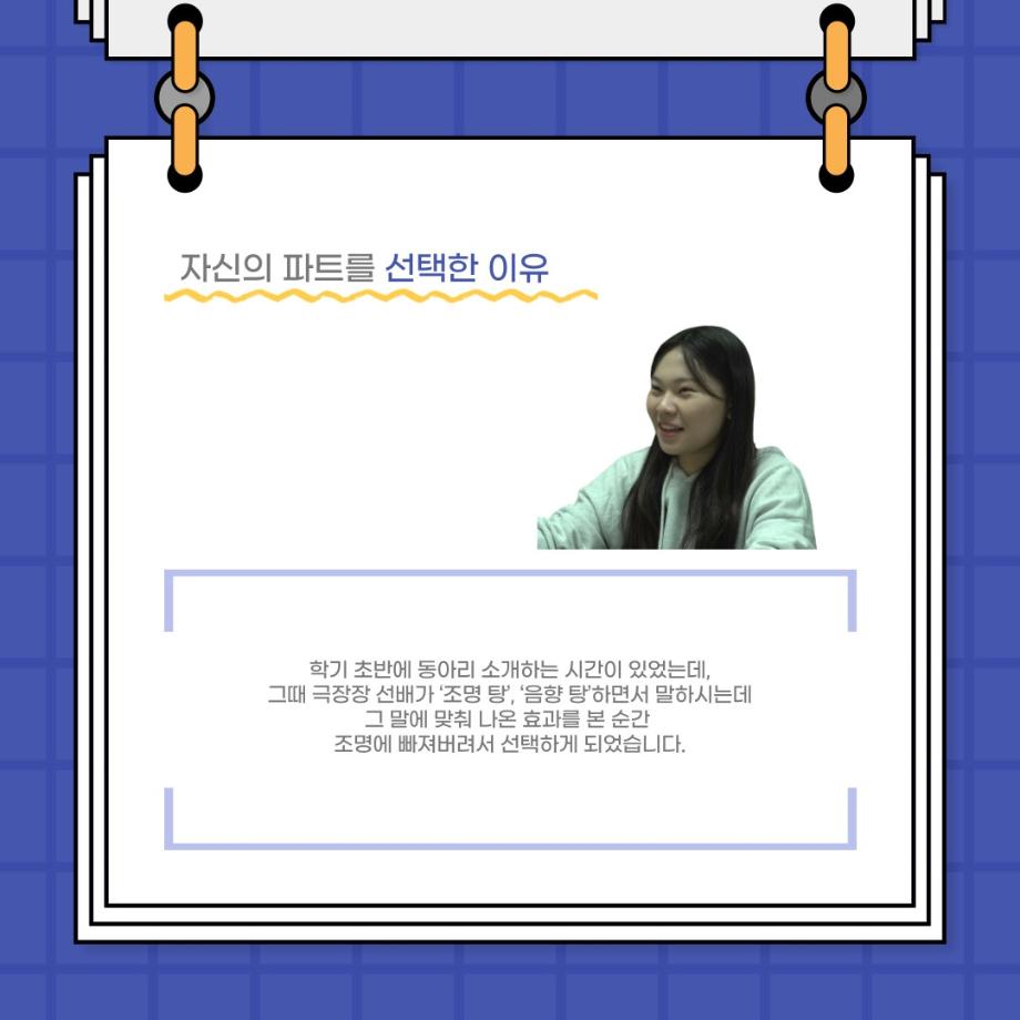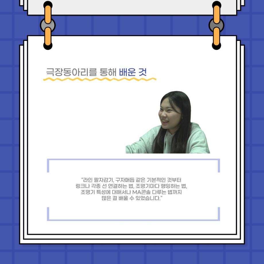본문 시작 홈으로 커뮤니티 학과소개 입학정보 교수소개 학과과정 커뮤니티 공연예매 안내 홈페이지가이드 포토갤러리 공지사항 포토갤러리 작품DB 동아리 학사일정 학생회 포토갤러리 페이스북 트위터 프린트 사이와의 인터뷰 - 23년도 극장동아리 조명 파트 부원 ‘김다애' 연기예술학과 3849 2023-11-24 사이와의 인터뷰 - 23년도 극장동아리 조명 파트 부원 ‘김다애' 안녕하십니까. 23년도 학회 ‘사이’입니다. 학회 ‘사이’의 열두번째 인터뷰로 연기예술학과 23년도 극장동아리 조명 파트 부원인 김다애 학생과 인터뷰하는 시간을 가졌습니다. 이번 인터뷰에서는 조명파트를 선택한 이유, 극장동아리를 통해 배운 것, 동아리를 하면서 기억에 남는 활동이나 일화 등에 대해 인터뷰하였습니다. 목록 이전제100회 세명대학교 연기예술학과 정기공연 2학년 <중급연기 관찰발표회> 스틸컷 다음 교내 개인형 이동장치전동킥보드 등 이용 안전수칙 안내 담당부서 : 연기예술학과 담당자 : - 연락처 : 043-649-1733 최종수정일 : 2024-10-26 만족도조사 만족도 조사 이 페이지에서 제공하는 정보에 대하여 만족하시나요? 매우만족 만족 보통 불만족 매우불만족