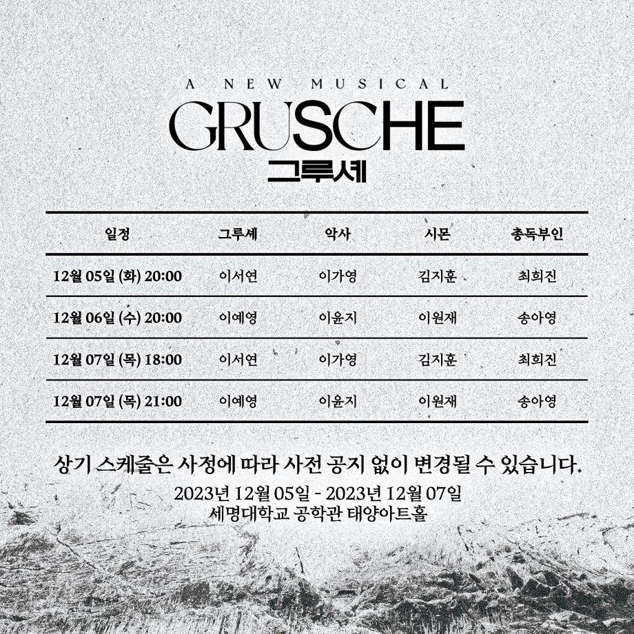 본문 시작 홈으로 커뮤니티 학과소개 입학정보 교수소개 학과과정 커뮤니티 공연예매 안내 홈페이지가이드 포토갤러리 공지사항 포토갤러리 작품DB 동아리 학사일정 학생회 포토갤러리 페이스북 트위터 프린트 제 101회 세명대학교 연기예술학과 뮤지컬제작실습 <Grusche> 포스터 & 예매링크 & 캐스트 연기예술학과 2949 2023-11-30 선으로 향한 유혹은 얼마나 끔찍한가 𝐀 𝐍𝐄𝐖 𝐌𝐔𝐒𝐈𝐂𝐀𝐋 <𝐆𝐫𝐮𝐬𝐜𝐡𝐞> - 인스타그램 @musical_grusche www.instagram.com/musical_grusche - 세명대학교 연기예술학과 뮤지컬제작실습 뮤지컬 <그루셰> 2023. 12. 05 20:00 2023. 12. 06 20:00 2023. 12. 07 18:00 / 21:00 세명대학교 공학관 태양아트홀 목록 이전[재학생필독]2024학년도 1학기 국가장학금 및 국가근로장학금 1차 신청 안내 다음 제100회 세명대학교 연기예술학과 정기공연 2학년 <중급연기 관찰발표회> 포스터 담당부서 : 연기예술학과 담당자 : - 연락처 : 043-649-1733 최종수정일 : 2024-10-26 만족도조사 만족도 조사 이 페이지에서 제공하는 정보에 대하여 만족하시나요? 매우만족 만족 보통 불만족 매우불만족