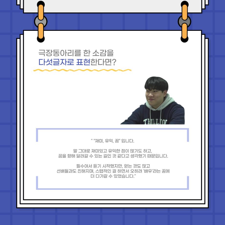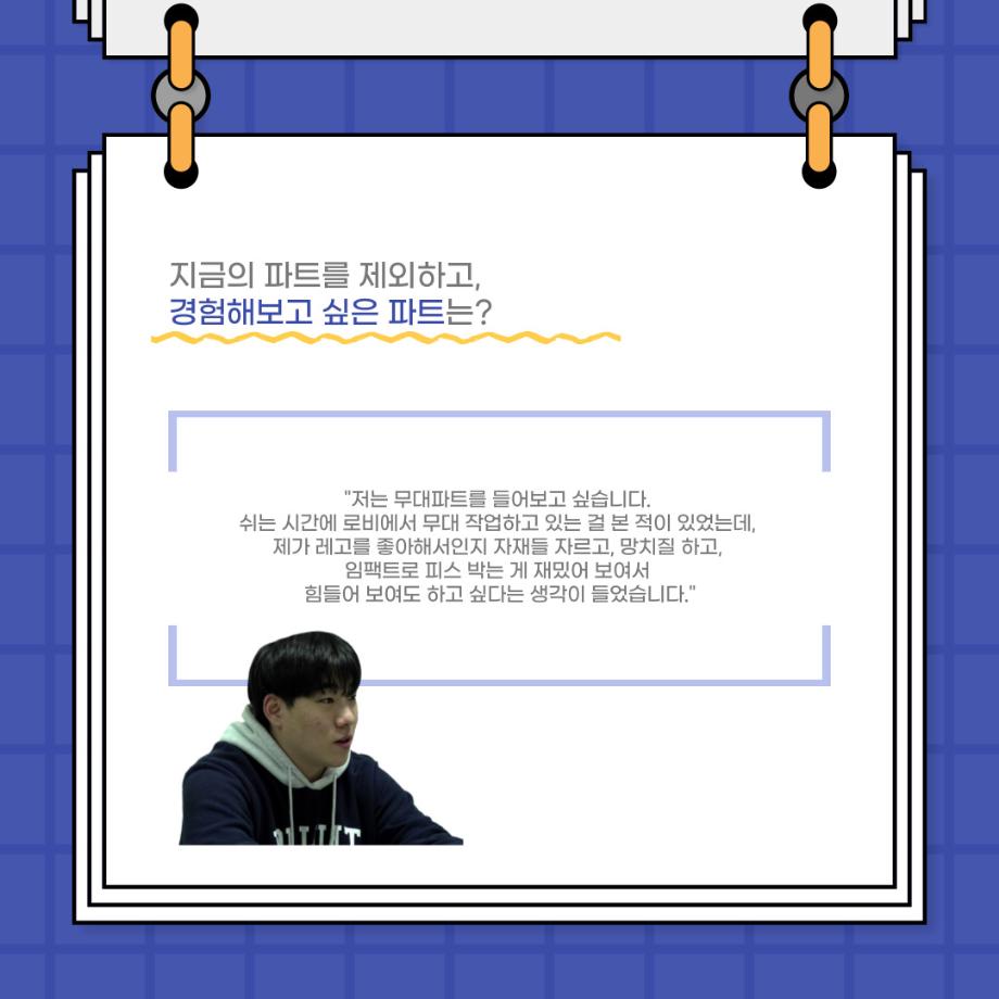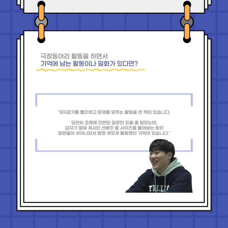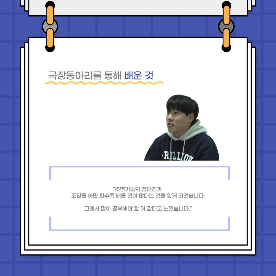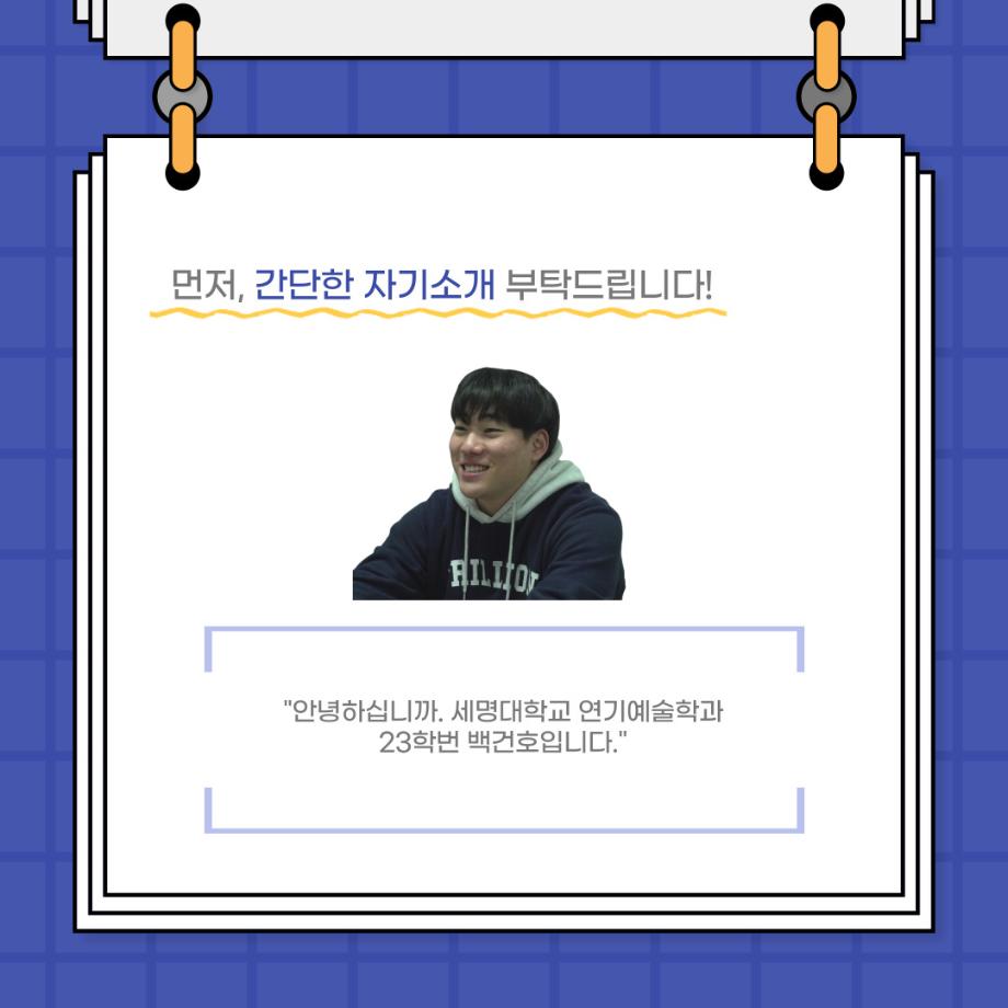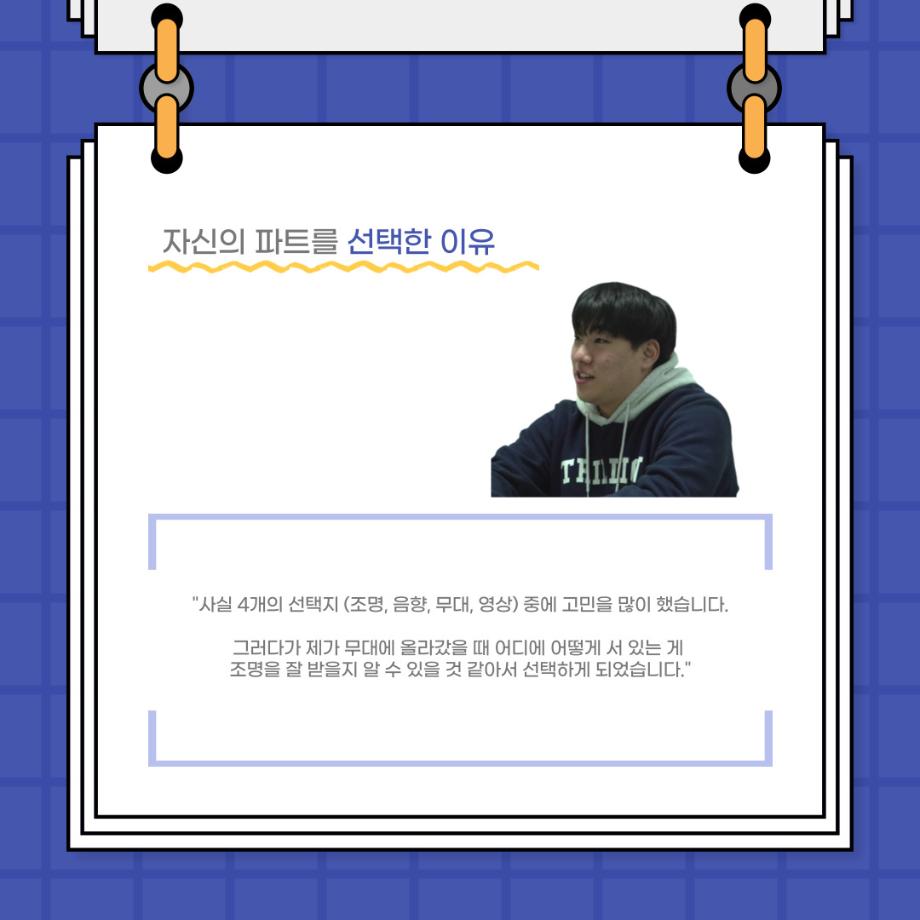 본문 시작 홈으로 커뮤니티 학과소개 입학정보 교수소개 학과과정 커뮤니티 공연예매 안내 홈페이지가이드 포토갤러리 공지사항 포토갤러리 작품DB 동아리 학사일정 학생회 포토갤러리 페이스북 트위터 프린트 사이와의 인터뷰 - 23년도 극장동아리 조명 파트 부원 ‘백건호‘ 연기예술학과 2978 2023-11-30 안녕하십니까. 23년도 학회 ‘사이’입니다. 학회 ‘사이’의 열세번째 인터뷰로 연기예술학과 23년도 극장동아리 조명 파트 부원인 백건호 학생과 인터뷰하는 시간을 가졌습니다. 이번 인터뷰에서는 조명파트를 선택한 이유, 극장동아리를 통해 배운 것, 동아리를 하면서 기억에 남는 활동이나 일화 등에 대해 인터뷰하였습니다. 다음 인터뷰 컨텐츠 ‘사인’도 많은 사랑 부탁드립니다. 목록 이전2023 연기예술학과 재학생을 위한 특강 다음 2023 연기예술학과 재학생을 위한 특강 - 음향감독 담당부서 : 연기예술학과 담당자 : - 연락처 : 043-649-1733 최종수정일 : 2024-10-26 만족도조사 만족도 조사 이 페이지에서 제공하는 정보에 대하여 만족하시나요? 매우만족 만족 보통 불만족 매우불만족