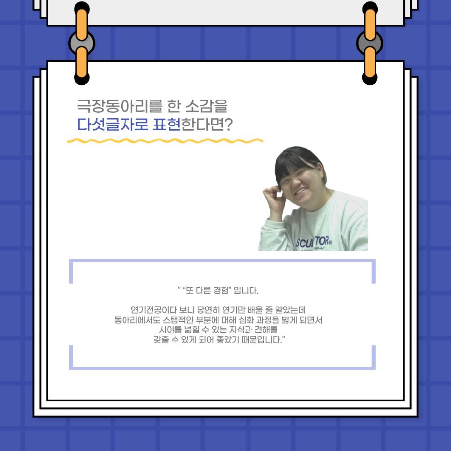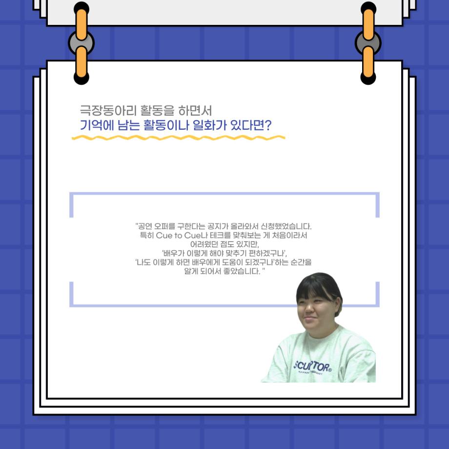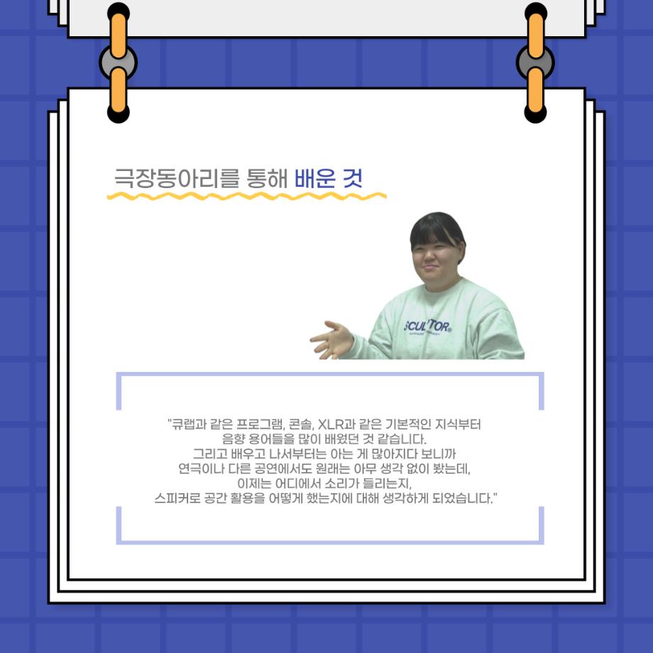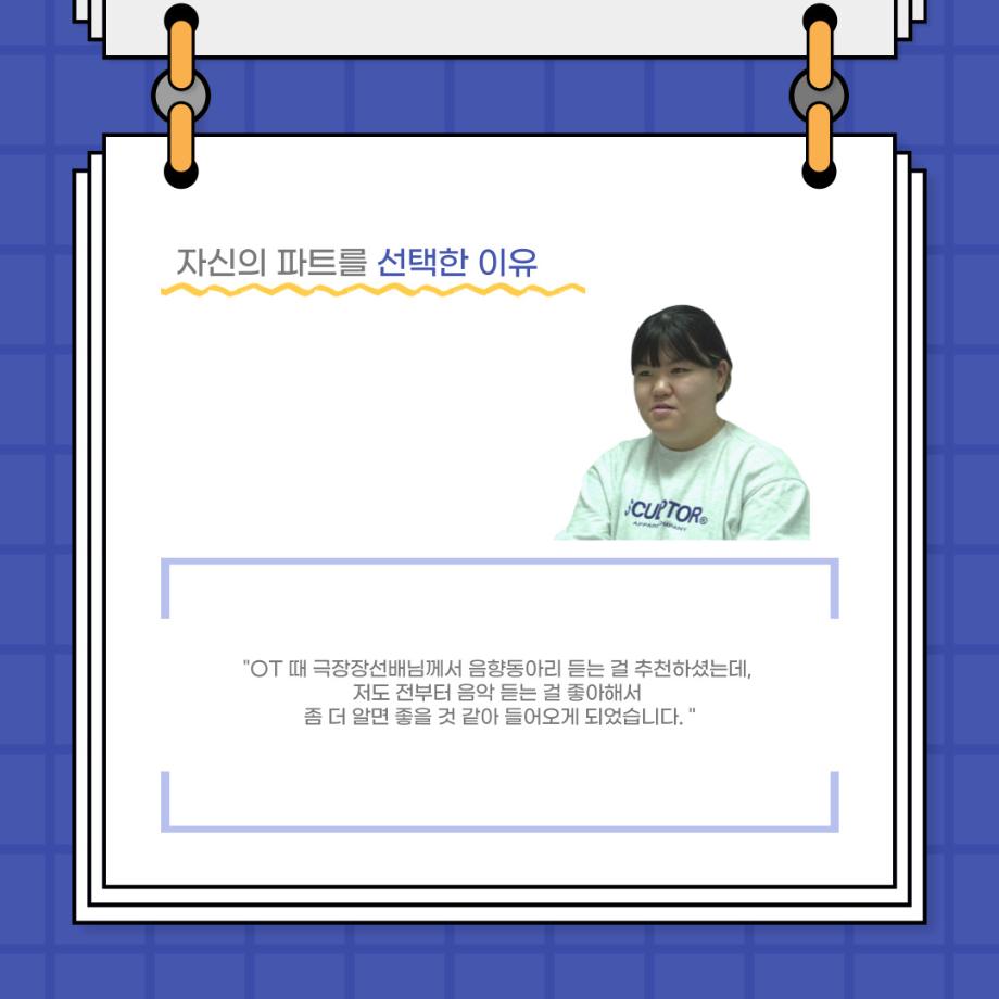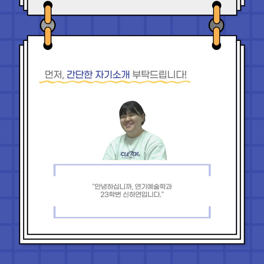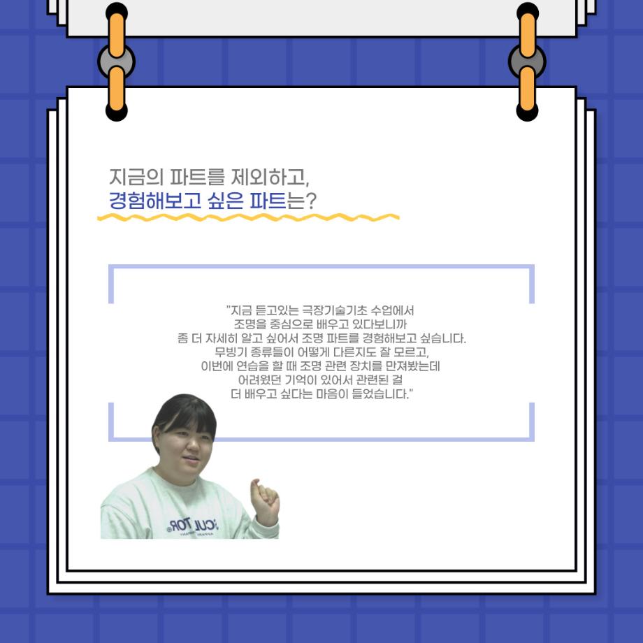 본문 시작 홈으로 커뮤니티 학과소개 입학정보 교수소개 학과과정 커뮤니티 공연예매 안내 홈페이지가이드 포토갤러리 공지사항 포토갤러리 작품DB 동아리 학사일정 학생회 포토갤러리 페이스북 트위터 프린트 사이와의 인터뷰 - 23년도 극장동아리 음향 파트 부원 ‘신하연' 연기예술학과 3214 2024-01-12 안녕하십니까. 23년도 학회 ‘사이’입니다. 학회 ‘사이’의 열네번째 인터뷰로 연기예술학과 23년도 극장동아리 음향 파트 부원인 신하연 학생과 인터뷰하는 시간을 가졌습니다. 이번 인터뷰에서는 음향파트를 선택한 이유, 극장동아리를 통해 배운 것, 동아리를 하면서 기억에 남는 활동이나 일화 등에 대해 인터뷰하였습니다. 다음 인터뷰 컨텐츠 ‘사인’도 많은 사랑 부탁드립니다. 목록 이전미래 인재를 위한 한방정밀의료 기초 교육 및 치료 체험 참가자 모집 다음 제102회 세명대학교 연기예술학과 정기공연 1학년 <에쮸드 발표회> 스틸컷 담당부서 : 연기예술학과 담당자 : - 연락처 : 043-649-1733 최종수정일 : 2024-10-26 만족도조사 만족도 조사 이 페이지에서 제공하는 정보에 대하여 만족하시나요? 매우만족 만족 보통 불만족 매우불만족