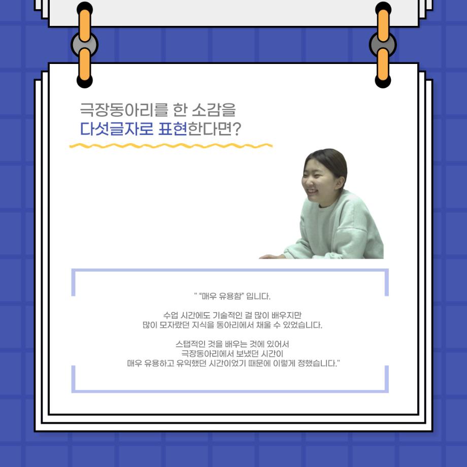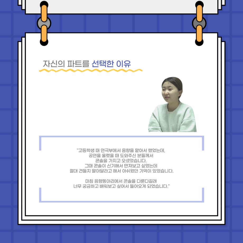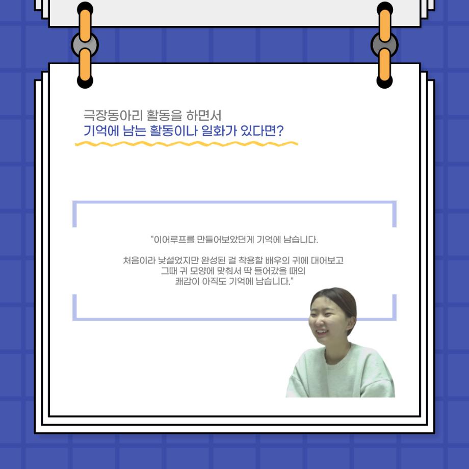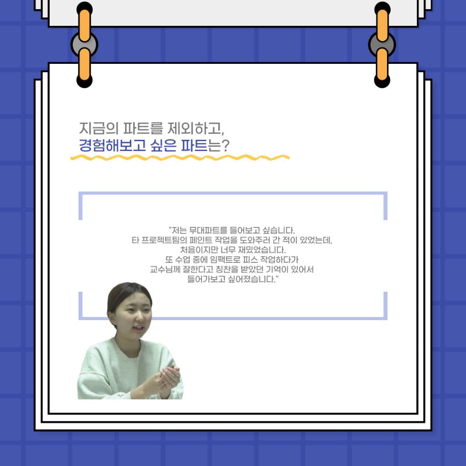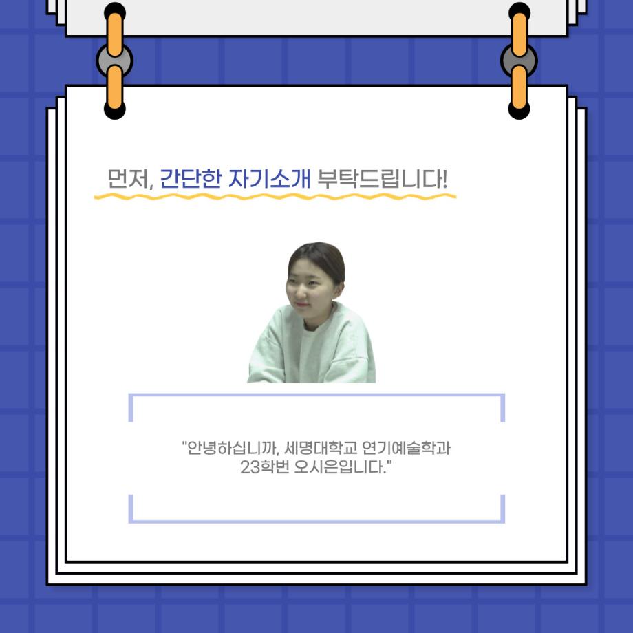 본문 시작 홈으로 커뮤니티 학과소개 입학정보 교수소개 학과과정 커뮤니티 공연예매 안내 홈페이지가이드 포토갤러리 공지사항 포토갤러리 작품DB 동아리 학사일정 학생회 포토갤러리 페이스북 트위터 프린트 사이와의 인터뷰 - 23년도 극장동아리 음향 파트 부원 ‘오시은‘ 연기예술학과 2859 2024-01-19 안녕하십니까. 23년도 학회 ‘사이’입니다. 학회 ‘사이’의 열다섯번째 인터뷰로 연기예술학과 23년도 극장동아리 음향 파트 부원인 오시은 학생과 인터뷰하는 시간을 가졌습니다. 이번 인터뷰에서는 음향파트를 선택한 이유, 극장동아리를 통해 배운 것, 동아리를 하면서 기억에 남는 활동이나 일화 등에 대해 인터뷰하였습니다. 다음 인터뷰 컨텐츠 ‘사인’도 많은 사랑 부탁드립니다. 목록 이전제102회 세명대학교 연기예술학과 정기공연 1학년 <에쮸드 발표회> 공연 성료 다음 찾아가는 충북 도립극단 설명회 담당부서 : 연기예술학과 담당자 : - 연락처 : 043-649-1733 최종수정일 : 2024-10-26 만족도조사 만족도 조사 이 페이지에서 제공하는 정보에 대하여 만족하시나요? 매우만족 만족 보통 불만족 매우불만족