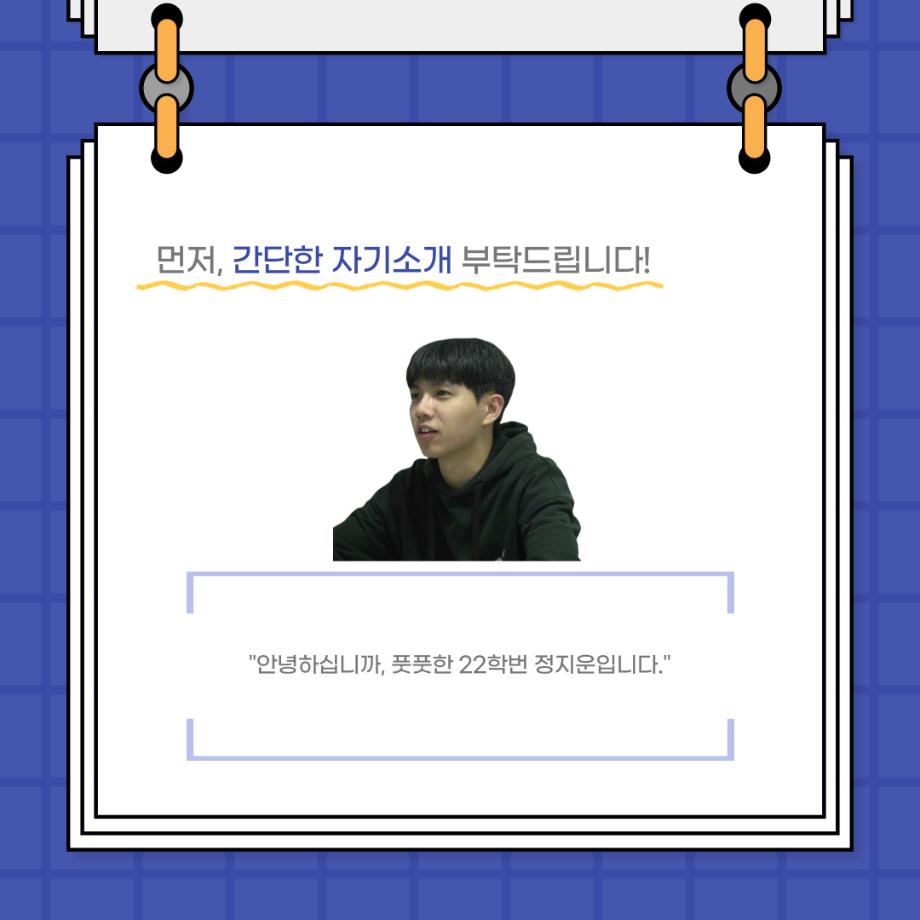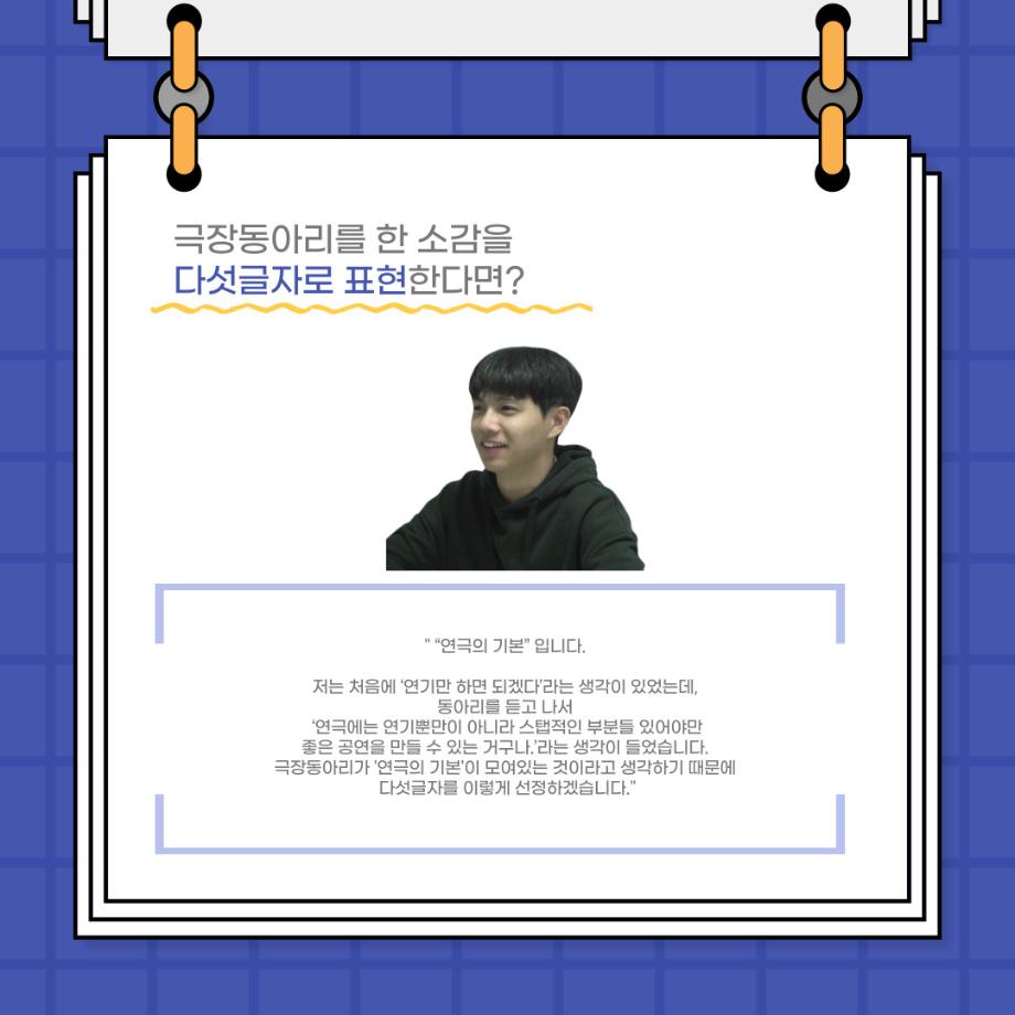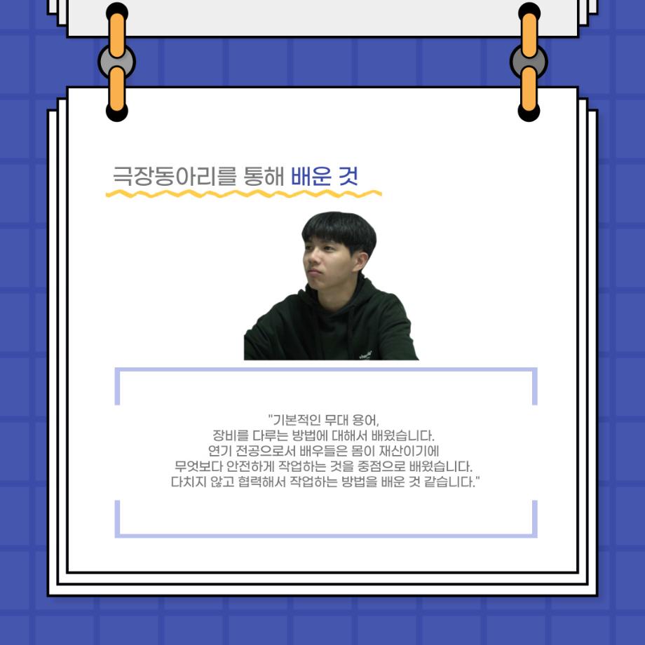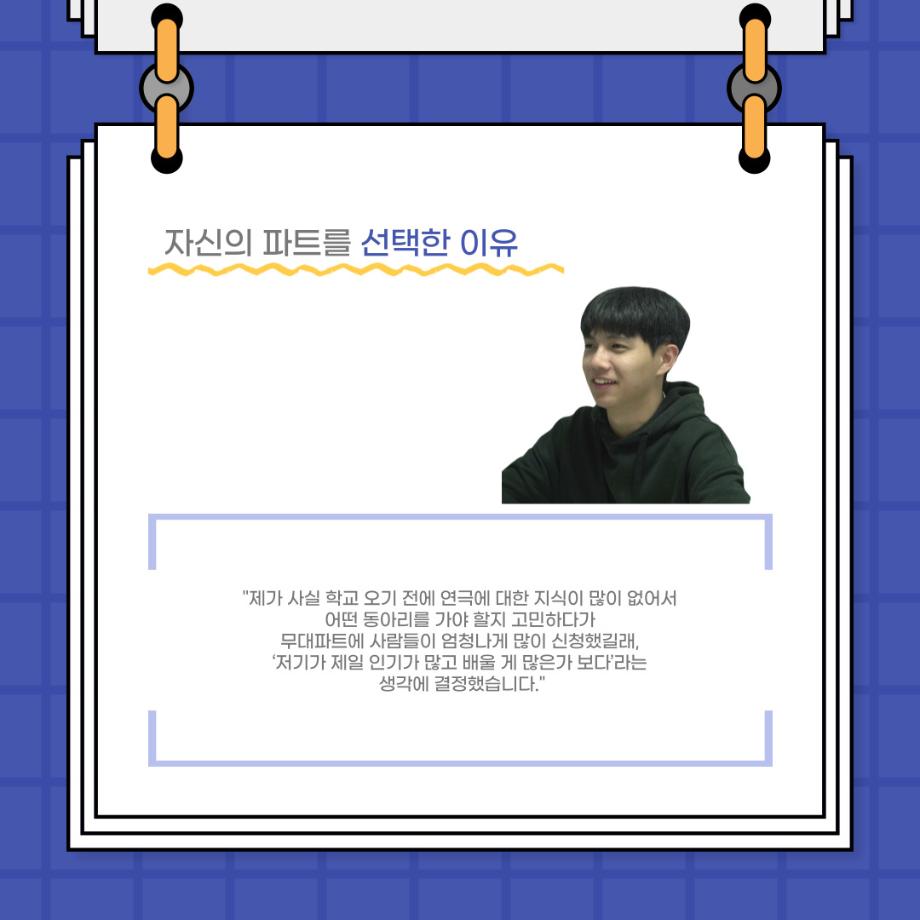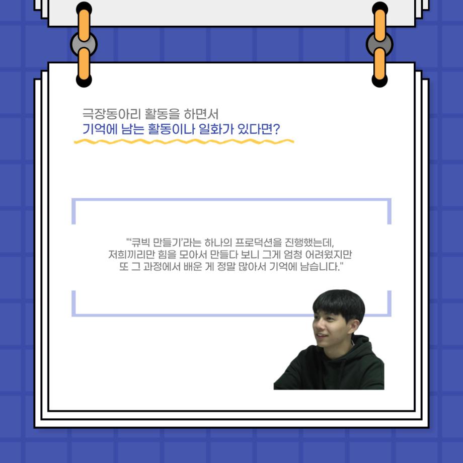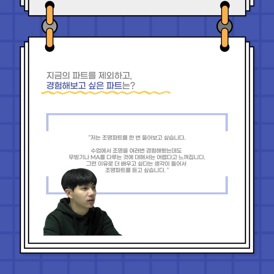 본문 시작 홈으로 커뮤니티 학과소개 입학정보 교수소개 학과과정 커뮤니티 공연예매 안내 홈페이지가이드 포토갤러리 공지사항 포토갤러리 작품DB 동아리 학사일정 학생회 포토갤러리 페이스북 트위터 프린트 사이와의 인터뷰 - 23년도 극장동아리 무대 파트 부원 ‘정지운‘ 연기예술학과 3027 2024-01-24 안녕하십니까. 23년도 학회 ‘사이’입니다. 학회 ‘사이’의 열여섯번째 인터뷰로 연기예술학과 23년도 극장동아리 무대 파트 부원인 정지운 학생과 인터뷰하는 시간을 가졌습니다. 이번 인터뷰에서는 무대파트를 선택한 이유, 극장동아리를 통해 배운 것, 동아리를 하면서 기억에 남는 활동이나 일화 등에 대해 인터뷰하였습니다. 다음 인터뷰 컨텐츠 ‘사인’도 많은 사랑 부탁드립니다. 목록 이전세명대학교 연기예술학과 종강총회 <커튼콜> 다음 사이와의 인터뷰 - 23년도 극장동아리 무대 파트 부원 ‘박상훈‘ 담당부서 : 연기예술학과 담당자 : - 연락처 : 043-649-1733 최종수정일 : 2024-10-26 만족도조사 만족도 조사 이 페이지에서 제공하는 정보에 대하여 만족하시나요? 매우만족 만족 보통 불만족 매우불만족