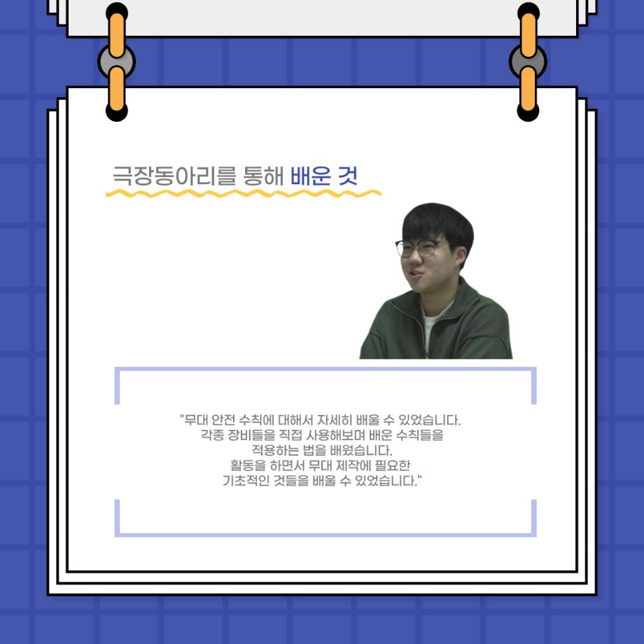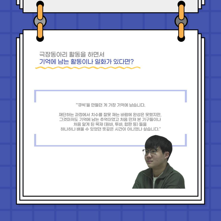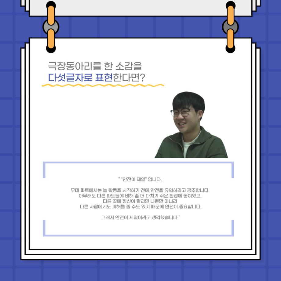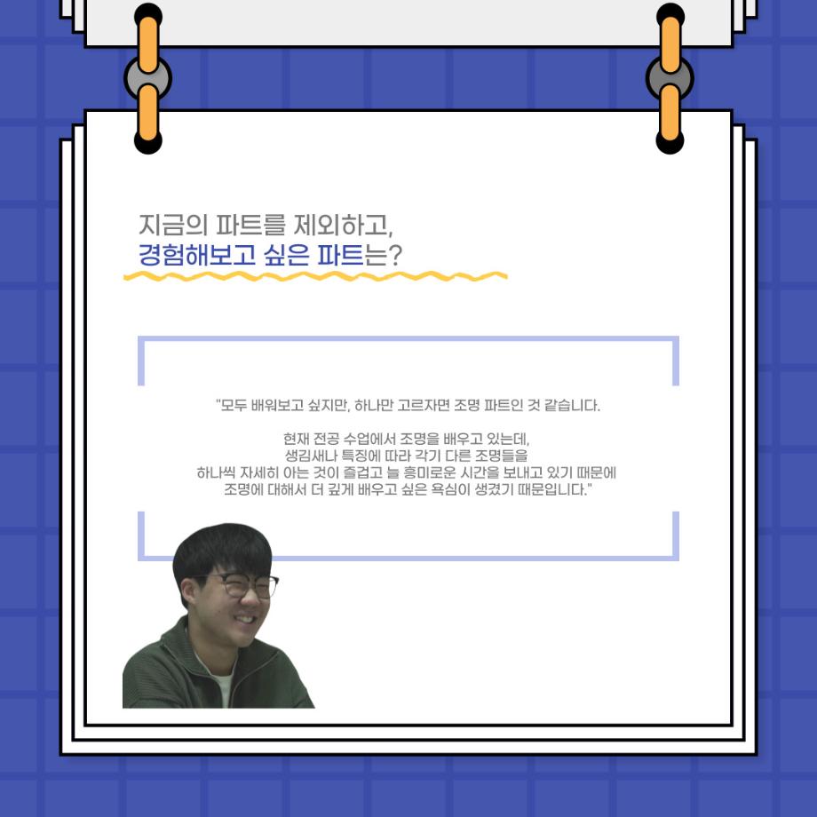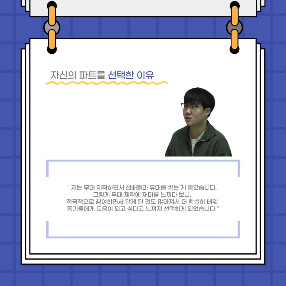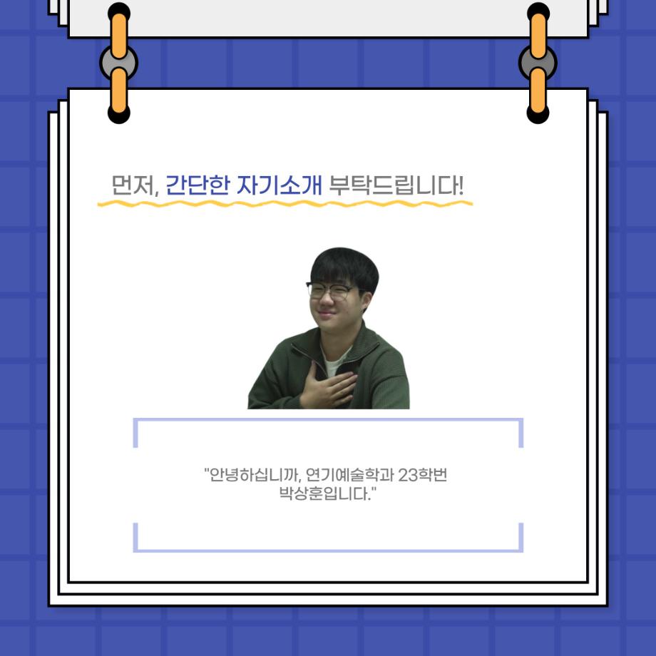 본문 시작 홈으로 커뮤니티 학과소개 입학정보 교수소개 학과과정 커뮤니티 공연예매 안내 홈페이지가이드 포토갤러리 공지사항 포토갤러리 작품DB 동아리 학사일정 학생회 포토갤러리 페이스북 트위터 프린트 사이와의 인터뷰 - 23년도 극장동아리 무대 파트 부원 ‘박상훈‘ 연기예술학과 3011 2024-01-25 안녕하십니까. 23년도 학회 ‘사이’입니다. 학회 ‘사이’의 열일곱번째 인터뷰로 연기예술학과 23년도 극장동아리 무대 파트 부원인 박상훈 학생과 인터뷰하는 시간을 가졌습니다. 이번 인터뷰에서는 무대파트를 선택한 이유, 극장동아리를 통해 배운 것, 동아리를 하면서 기억에 남는 활동이나 일화 등에 대해 인터뷰하였습니다. 다음 인터뷰 컨텐츠 ‘사인’도 많은 사랑 부탁드립니다. 목록 이전사이와의 인터뷰 - 23년도 극장동아리 무대 파트 부원 ‘정지운‘ 다음 사이와의 인터뷰 - 23년도 극장동아리 영상 파트 부원 ‘김준희‘ 담당부서 : 연기예술학과 담당자 : - 연락처 : 043-649-1733 최종수정일 : 2024-10-26 만족도조사 만족도 조사 이 페이지에서 제공하는 정보에 대하여 만족하시나요? 매우만족 만족 보통 불만족 매우불만족