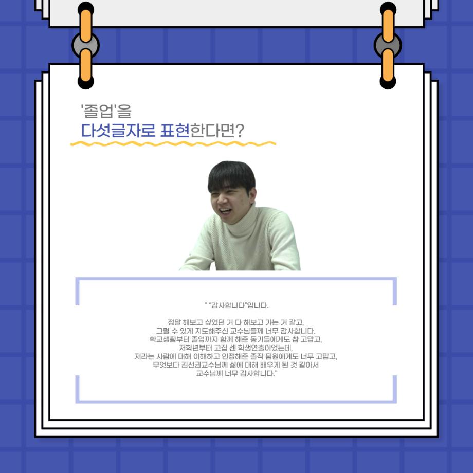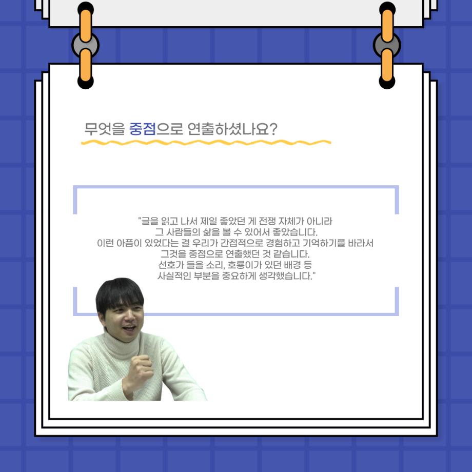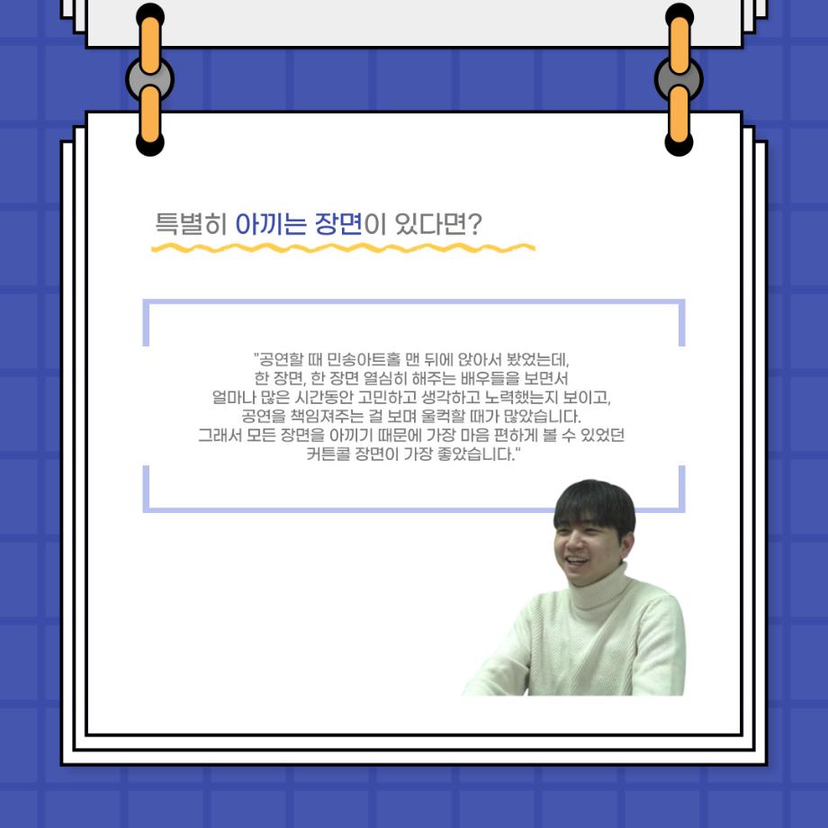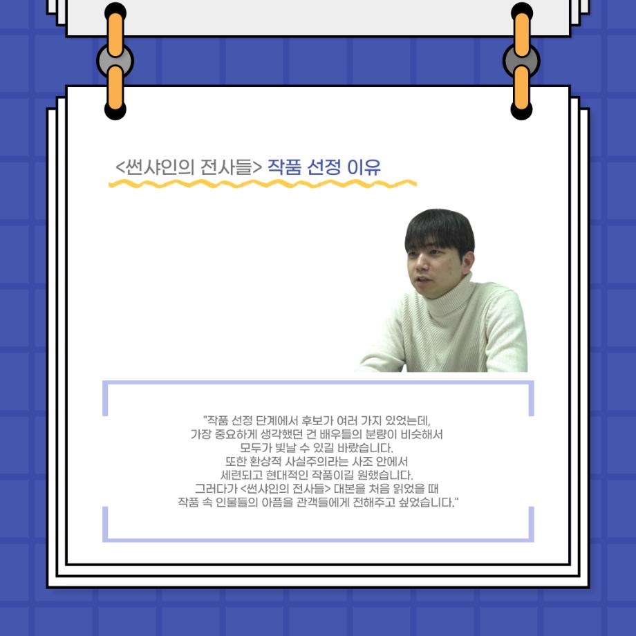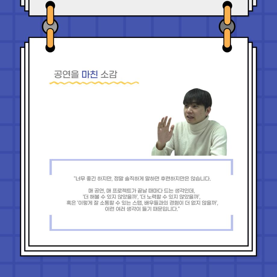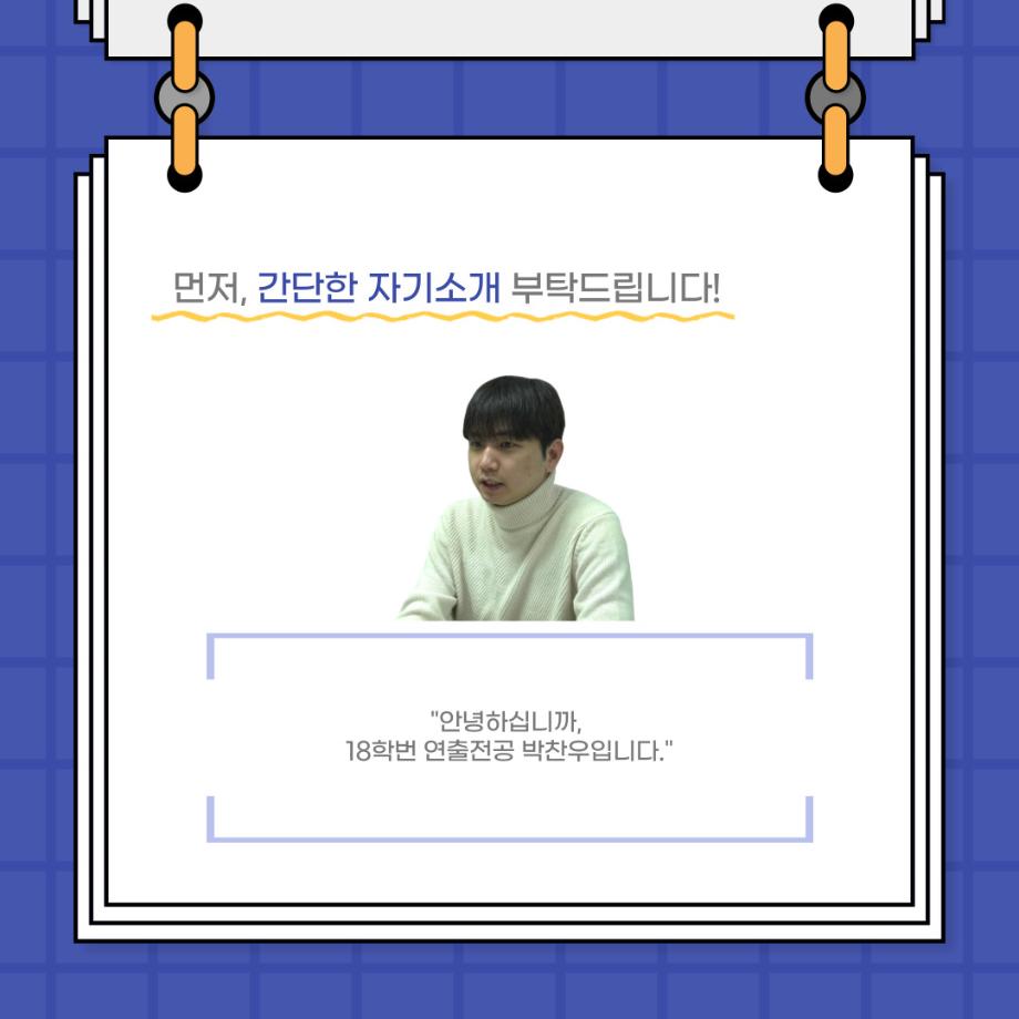 본문 시작 홈으로 커뮤니티 학과소개 입학정보 교수소개 학과과정 커뮤니티 공연예매 안내 홈페이지가이드 포토갤러리 공지사항 포토갤러리 작품DB 동아리 학사일정 학생회 포토갤러리 페이스북 트위터 프린트 사이와의 인터뷰 - 23년도 졸업작품 학생연출 ‘박찬우‘ 연기예술학과 3141 2024-02-05 안녕하십니까. 23년도 학회 ‘사이’입니다. 학회 ‘사이’의 스무번째 인터뷰로 연기예술학과 23년도 졸업작품 <썬샤인의 전사들>의 학생연출인 박찬우 학생과 인터뷰하는 시간을 가졌습니다. 이번 인터뷰에서는 졸업작품 <썬샤인의 전사들>을 선정한 이유, 아끼는 장면, 공연을 마친 소감 등에 대해 인터뷰하였습니다. 다음 인터뷰 컨텐츠 ‘사인’도 많은 사랑 부탁드립니다. 목록 이전사이와의 인터뷰 - 23년도 극장동아리 영상 파트 부원 ‘정태경‘ 다음 사이와의 인터뷰 - 23년도 졸업작품 한승우役 ‘김덕종‘ 담당부서 : 연기예술학과 담당자 : - 연락처 : 043-649-1733 최종수정일 : 2024-10-26 만족도조사 만족도 조사 이 페이지에서 제공하는 정보에 대하여 만족하시나요? 매우만족 만족 보통 불만족 매우불만족