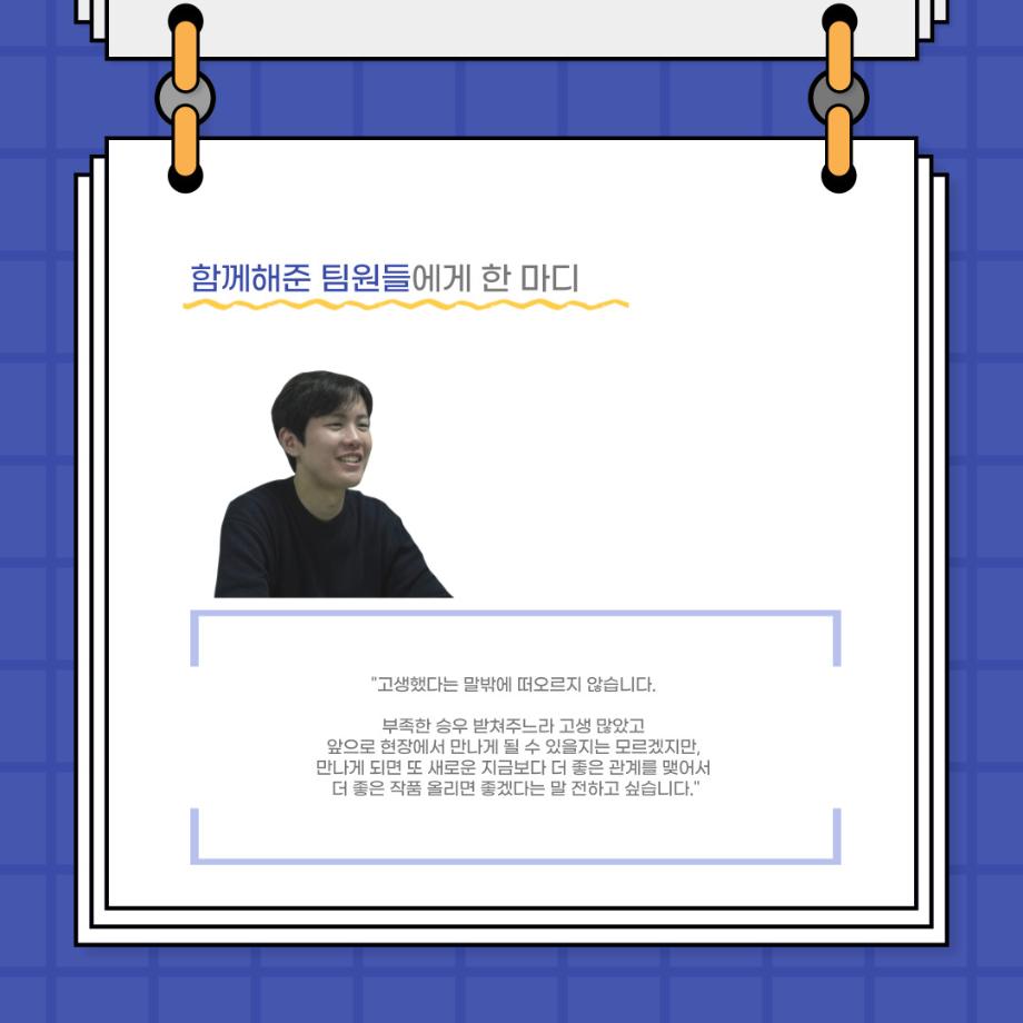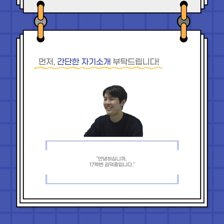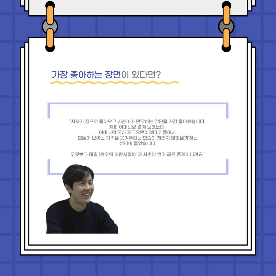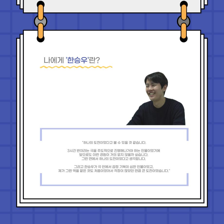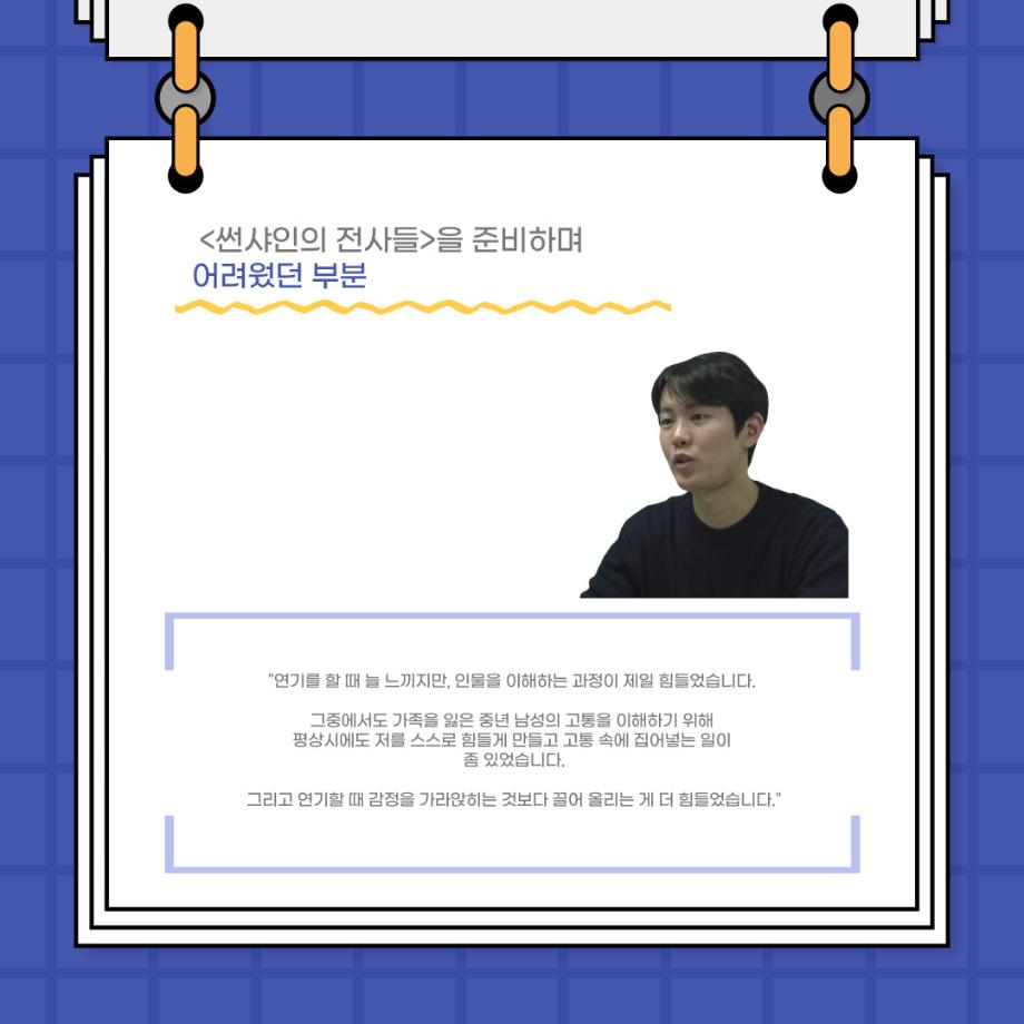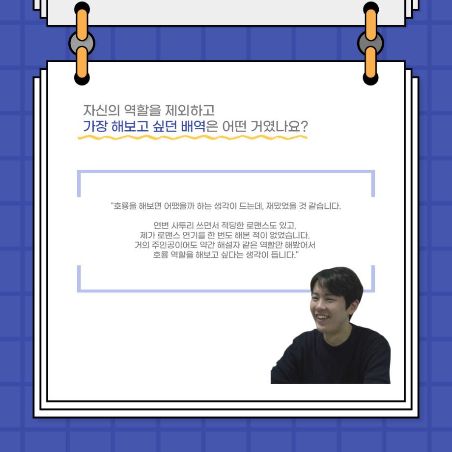 본문 시작 홈으로 커뮤니티 학과소개 입학정보 교수소개 학과과정 커뮤니티 공연예매 안내 홈페이지가이드 포토갤러리 공지사항 포토갤러리 작품DB 동아리 학사일정 학생회 포토갤러리 페이스북 트위터 프린트 사이와의 인터뷰 - 23년도 졸업작품 한승우役 ‘김덕종‘ 연기예술학과 3132 2024-02-06 안녕하십니까. 23년도 학회 ‘사이’입니다. 학회 ‘사이’의 스물한 번째 인터뷰로 연기예술학과 23년도 졸업작품 <썬샤인의 전사들>의 한승우 역인 김덕종 학생과 인터뷰하는 시간을 가졌습니다. 이번 인터뷰에서는 졸업작품 <썬샤인의 전사들>를 준비하면서 어려웠던 부분, 가장 좋아하는 장면, 가장 해보고 싶었던 배역 등에 대해 인터뷰하였습니다. 다음 인터뷰 컨텐츠 ‘사인’도 많은 사랑 부탁드립니다. 목록 이전사이와의 인터뷰 - 23년도 졸업작품 학생연출 ‘박찬우‘ 다음 사이와의 인터뷰 - 23년도 졸업작품 송시춘役 ‘홍민주‘ 담당부서 : 연기예술학과 담당자 : - 연락처 : 043-649-1733 최종수정일 : 2024-10-26 만족도조사 만족도 조사 이 페이지에서 제공하는 정보에 대하여 만족하시나요? 매우만족 만족 보통 불만족 매우불만족