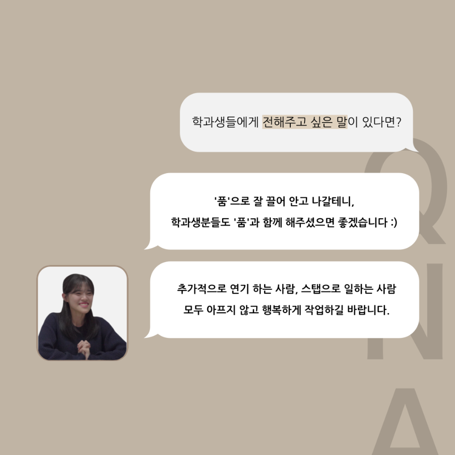본문 시작 홈으로 커뮤니티 학과소개 입학정보 교수소개 학과과정 커뮤니티 공연예매 안내 홈페이지가이드 포토갤러리 공지사항 포토갤러리 작품DB 동아리 학사일정 학생회 포토갤러리 페이스북 트위터 프린트 '품'위있는 인'터뷰' - 24년도 부학회장 <최가람> 연기예술학과 3359 2024-07-10 안녕하십니까. 24년도 학회 ‘품‘ 입니다. 학회 ‘품’의 두 번째 인터뷰로 세명대학교 연기예술학과 24학년도 부학회장인 최가람 학우와 인터뷰 하는 시간을 가졌습니다. 부학회장으로서의 각오, 방향성 그리고 학과생에게 전하고 싶은 말과 학회에게 남기는 메세지 등을 질문하는 시간을 가졌습니다. 앞으로 있을 인터뷰 컨텐츠인 ‘품터뷰’ 많은 사랑 부탁드립니다. 목록 이전2024학년도 하계방학 진로, 취업 LMS 특강 다음 '품'위있는 인'터뷰' - 24년도 극장장 <이종화> 담당부서 : 연기예술학과 담당자 : - 연락처 : 043-649-1733 최종수정일 : 2024-10-26 만족도조사 만족도 조사 이 페이지에서 제공하는 정보에 대하여 만족하시나요? 매우만족 만족 보통 불만족 매우불만족