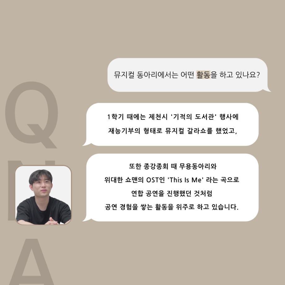 본문 시작 홈으로 커뮤니티 학과소개 입학정보 교수소개 학과과정 커뮤니티 공연예매 안내 홈페이지가이드 포토갤러리 공지사항 포토갤러리 작품DB 동아리 학사일정 학생회 포토갤러리 페이스북 트위터 프린트 '품'위있는 인'터뷰' - 24년도 뮤지컬동아리장 <정찬홍> 연기예술학과 3286 2024-07-31 안녕하십니까. 24년도 학회 ‘품‘ 입니다. 학회 ‘품’의 여덟 번째 인터뷰로 세명대학교 연기예술학과 24학년도 뮤지컬동아리장인 정찬홍 학우와 인터뷰 하는 시간을 가졌습니다. 뮤지컬 동아리장이 된 계기와 동아리에서는 어떤 활동을 하고있는지, 앞으로의 계획은 무엇으며 동아리 부원들에게 전하고 싶은 말 등을 질문하는 시간을 가졌습니다. 앞으로 있을 인터뷰 컨텐츠인 '품터뷰' 많은 사랑 부탁드립니다. 목록 다음 2024학년도 1학기 기말 수업평가 결과 조회 안내 다음 '품'위있는 인'터뷰' - 24년도 배우훈련동아리장 <정성주> 담당부서 : 연기예술학과 담당자 : - 연락처 : 043-649-1733 최종수정일 : 2024-10-26 만족도조사 만족도 조사 이 페이지에서 제공하는 정보에 대하여 만족하시나요? 매우만족 만족 보통 불만족 매우불만족
