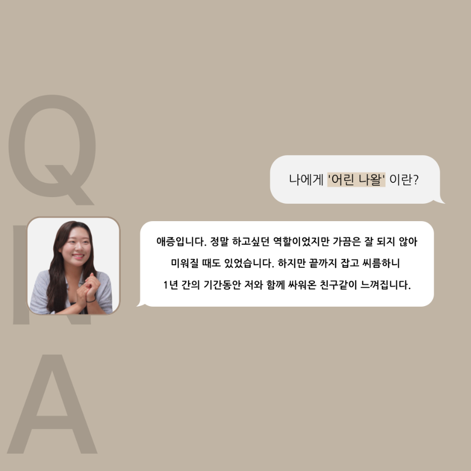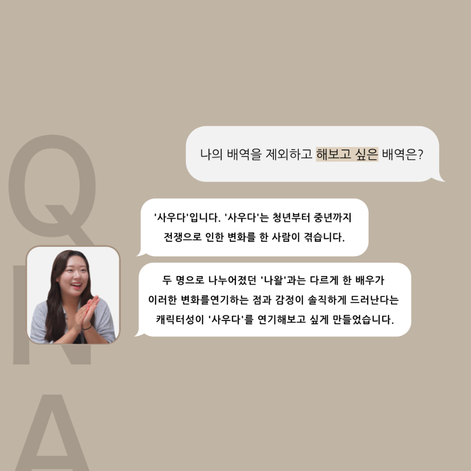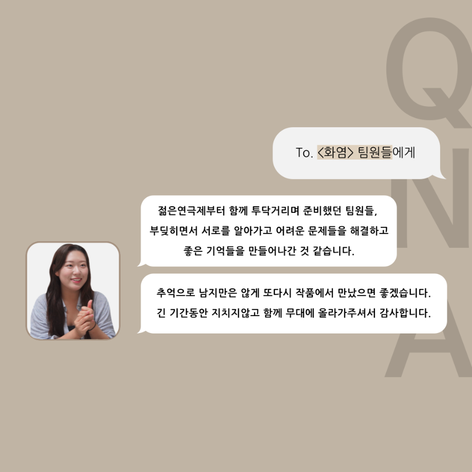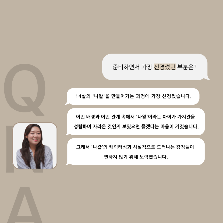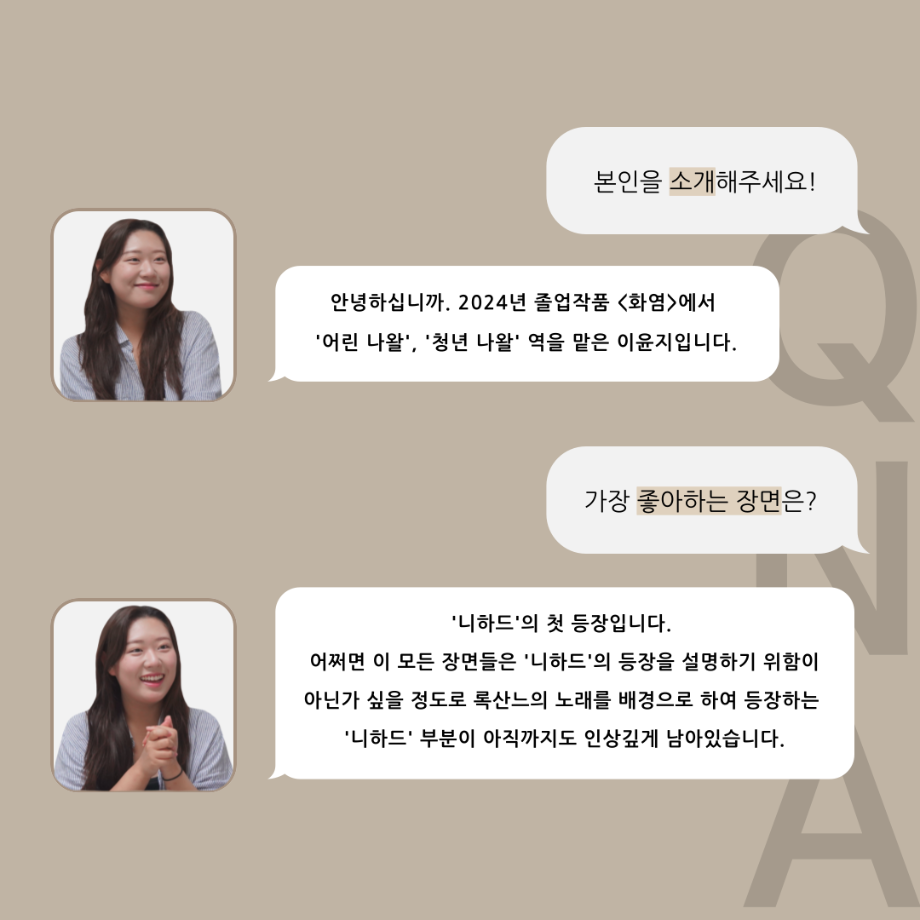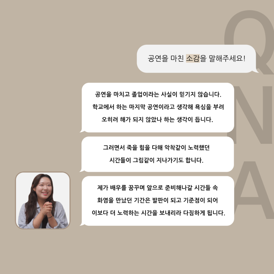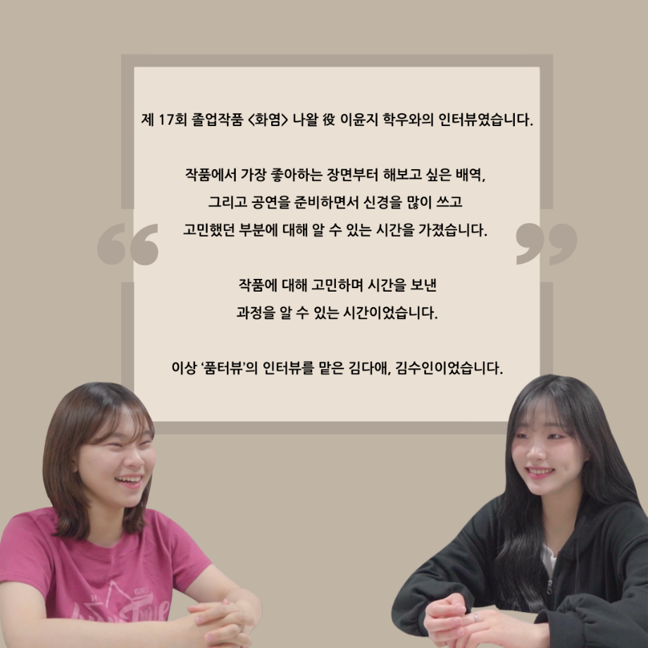 본문 시작 홈으로 커뮤니티 학과소개 입학정보 교수소개 학과과정 커뮤니티 공연예매 안내 홈페이지가이드 포토갤러리 공지사항 포토갤러리 작품DB 동아리 학사일정 학생회 포토갤러리 페이스북 트위터 프린트 ‘품’위있는 인‘터뷰’ - 24년도 졸업작품 어린나왈 役 <이윤지> 연기예술학과 3255 2024-12-19 안녕하십니까. 24년도 학회 ‘품’ 입니다. 학회 ‘품’의 열 일곱 번째 인터뷰로 세명대학교 연기예술학과 제 17회 졸업작품 <화염>의 어린 나왈 역인 이윤지 학우와 인터뷰 하는 시간을 가졌습니다. 가장 좋아하는 장면, 자신의 배역을 제외하고 해보고 싶은 배역 그리고 준비하면서 어려웠던 부분과 공연을 마친 소감 등에 대해 인터뷰 하는 시간을 가졌습니다. 앞으로 있을 인터뷰 컨텐츠인 ‘품터뷰’ 많은 사랑 부탁드립니다. 목록 이전세명대학교 연기예술학과 종강총회 다음 ‘품’위있는 인‘터뷰’ - 24년도 졸업작품 르벨 役 <정성주> 담당부서 : 연기예술학과 담당자 : - 연락처 : 043-649-1733 최종수정일 : 2024-10-26 만족도조사 만족도 조사 이 페이지에서 제공하는 정보에 대하여 만족하시나요? 매우만족 만족 보통 불만족 매우불만족