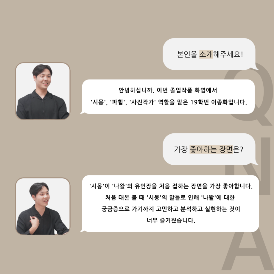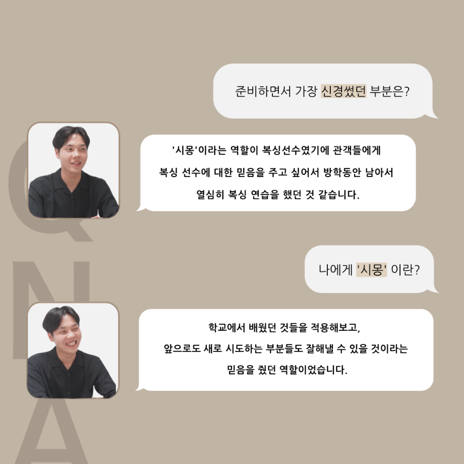 본문 시작 홈으로 커뮤니티 학과소개 입학정보 교수소개 학과과정 커뮤니티 공연예매 안내 홈페이지가이드 포토갤러리 공지사항 포토갤러리 작품DB 동아리 학사일정 학생회 포토갤러리 페이스북 트위터 프린트 ‘품’위있는 인‘터뷰’ - 24년도 졸업작품 시몽 役 <이종화> 연기예술학과 3454 2024-12-24 안녕하십니까. 24년도 학회 ‘품’ 입니다. 학회 ‘품’의 스무 번째 인터뷰로 세명대학교 연기예술학과 제 17회 졸업작품 <화염>의 시몽 역인 이종화 학우와 인터뷰 하는 시간을 가졌습니다. 가장 좋아하는 장면, 자신의 배역을 제외하고 해보고 싶은 배역 그리고 준비하면서 어려웠던 부분과 공연을 마친 소감 등에 대해 인터뷰 하는 시간을 가졌습니다. 앞으로 있을 인터뷰 컨텐츠인 ‘품터뷰’ 많은 사랑 부탁드립니다. 목록 이전‘품’위있는 인‘터뷰’ - 24년도 졸업작품 잔느 役 <최희진> 다음 세명대학교 연기예술학과 정시모집 담당부서 : 연기예술학과 담당자 : - 연락처 : 043-649-1733 최종수정일 : 2024-10-26 만족도조사 만족도 조사 이 페이지에서 제공하는 정보에 대하여 만족하시나요? 매우만족 만족 보통 불만족 매우불만족