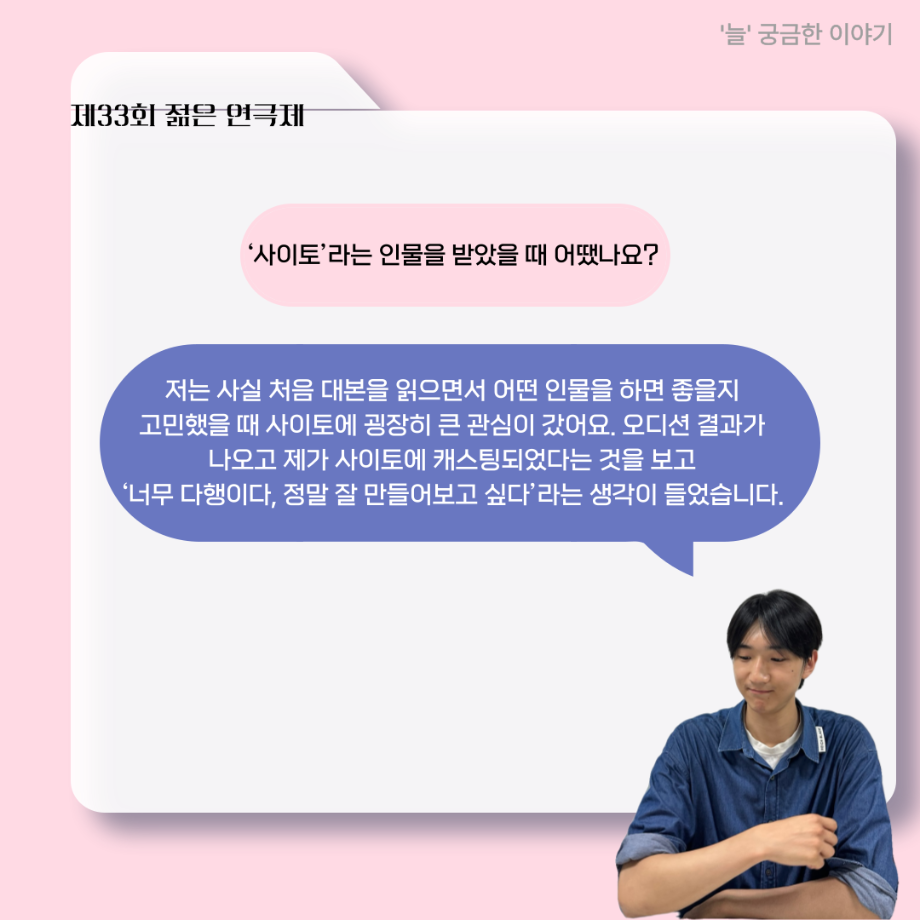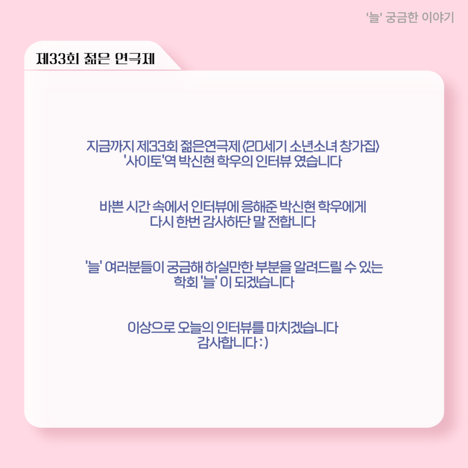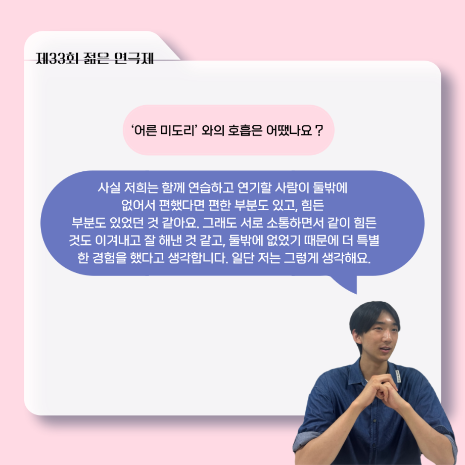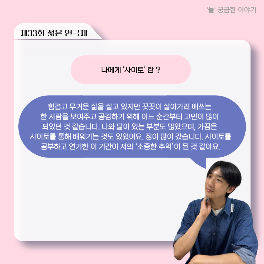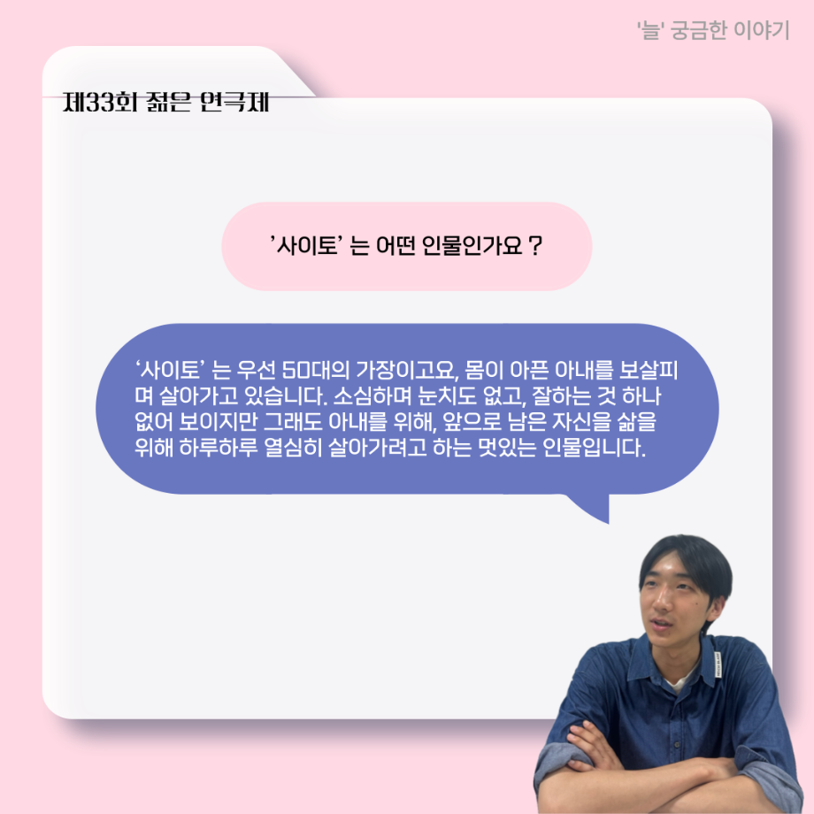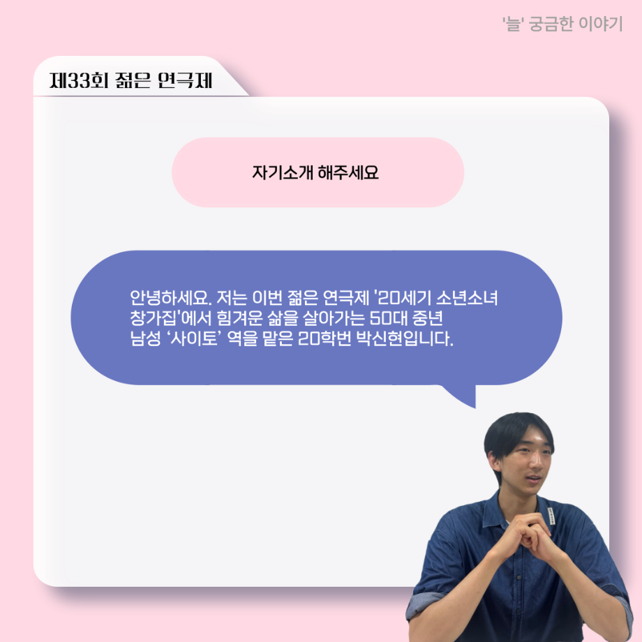 본문 시작 홈으로 커뮤니티 학과소개 입학정보 교수소개 학과과정 커뮤니티 공연예매 안내 홈페이지가이드 포토갤러리 공지사항 포토갤러리 작품DB 동아리 학사일정 학생회 포토갤러리 페이스북 트위터 프린트 ‘늘‘ 궁금한 이야기 - 젊은연극제 ‘20세기 소년소녀 창가집’ 사이토 役 < 박신현 > 연기예술학과 1038 2025-08-15 . 목록 다음 2025년 세명대학교 연기예술학과 2학기 개강총회 다음 ‘늘‘ 궁금한 이야기 - 젊은연극제 ‘20세기 소년소녀 창가집’ 종이연극 아저씨 役 < 윤준호 > 담당부서 : 연기예술학과 담당자 : - 연락처 : 043-649-1733 최종수정일 : 2024-10-26 만족도조사 만족도 조사 이 페이지에서 제공하는 정보에 대하여 만족하시나요? 매우만족 만족 보통 불만족 매우불만족