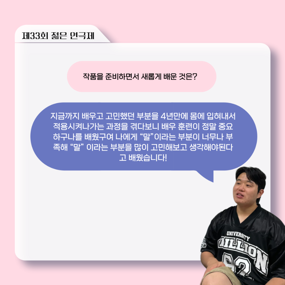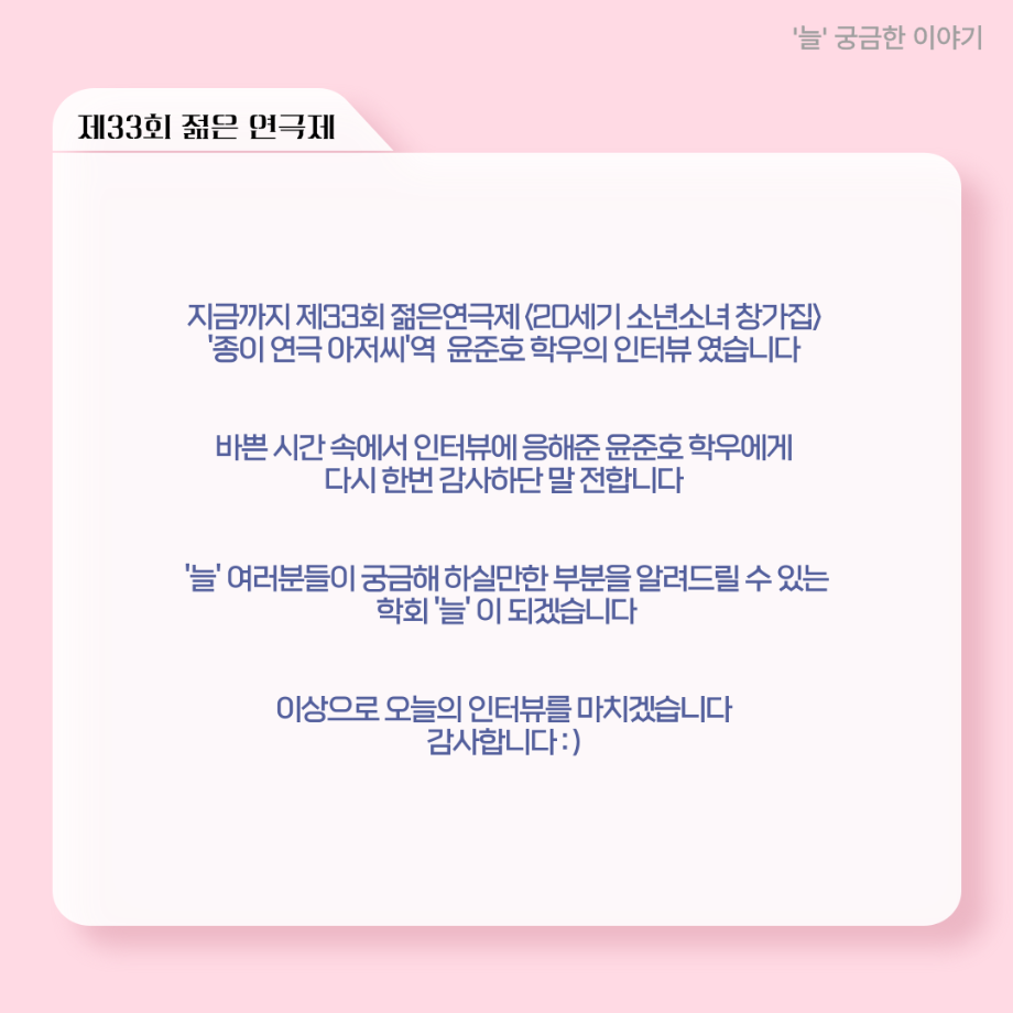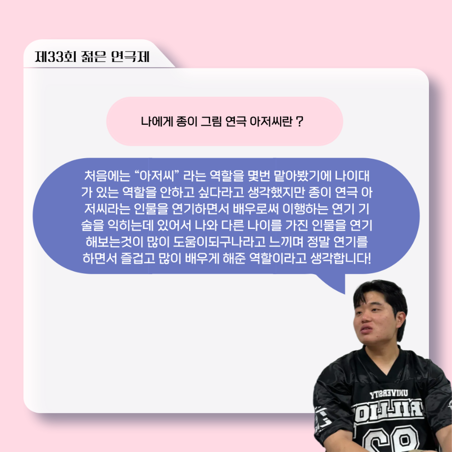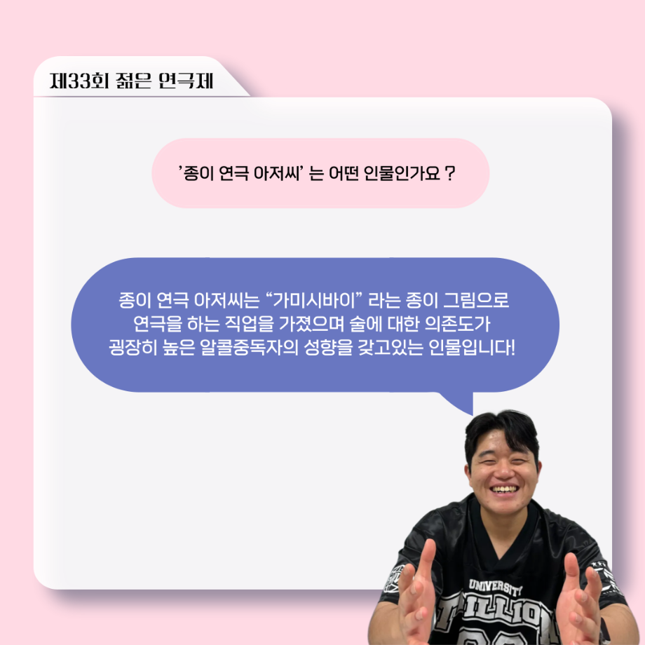 본문 시작 홈으로 커뮤니티 학과소개 입학정보 교수소개 학과과정 커뮤니티 공연예매 안내 홈페이지가이드 포토갤러리 공지사항 포토갤러리 작품DB 동아리 학사일정 학생회 포토갤러리 페이스북 트위터 프린트 ‘늘‘ 궁금한 이야기 - 젊은연극제 ‘20세기 소년소녀 창가집’ 종이연극 아저씨 役 < 윤준호 > 연기예술학과 1427 2025-08-28 . 목록 이전‘늘‘ 궁금한 이야기 - 젊은연극제 ‘20세기 소년소녀 창가집’ 사이토 役 < 박신현 > 다음 ‘늘‘ 궁금한 이야기 - 젊은연극제 ‘20세기 소년소녀 창가집’ 다큐pd 役 < 임재완 > 담당부서 : 연기예술학과 담당자 : - 연락처 : 043-649-1733 최종수정일 : 2024-10-26 만족도조사 만족도 조사 이 페이지에서 제공하는 정보에 대하여 만족하시나요? 매우만족 만족 보통 불만족 매우불만족