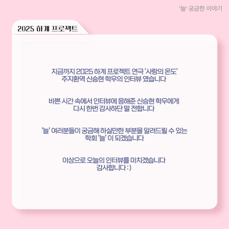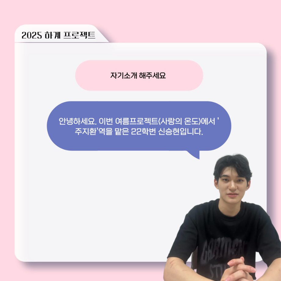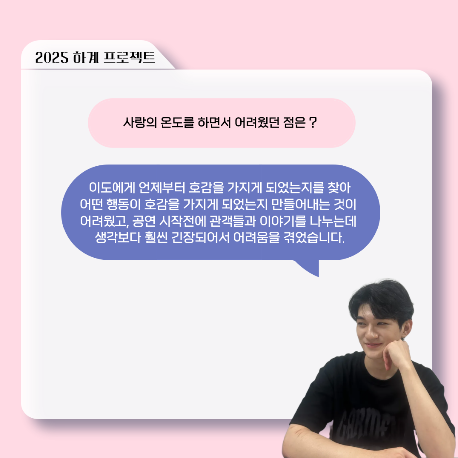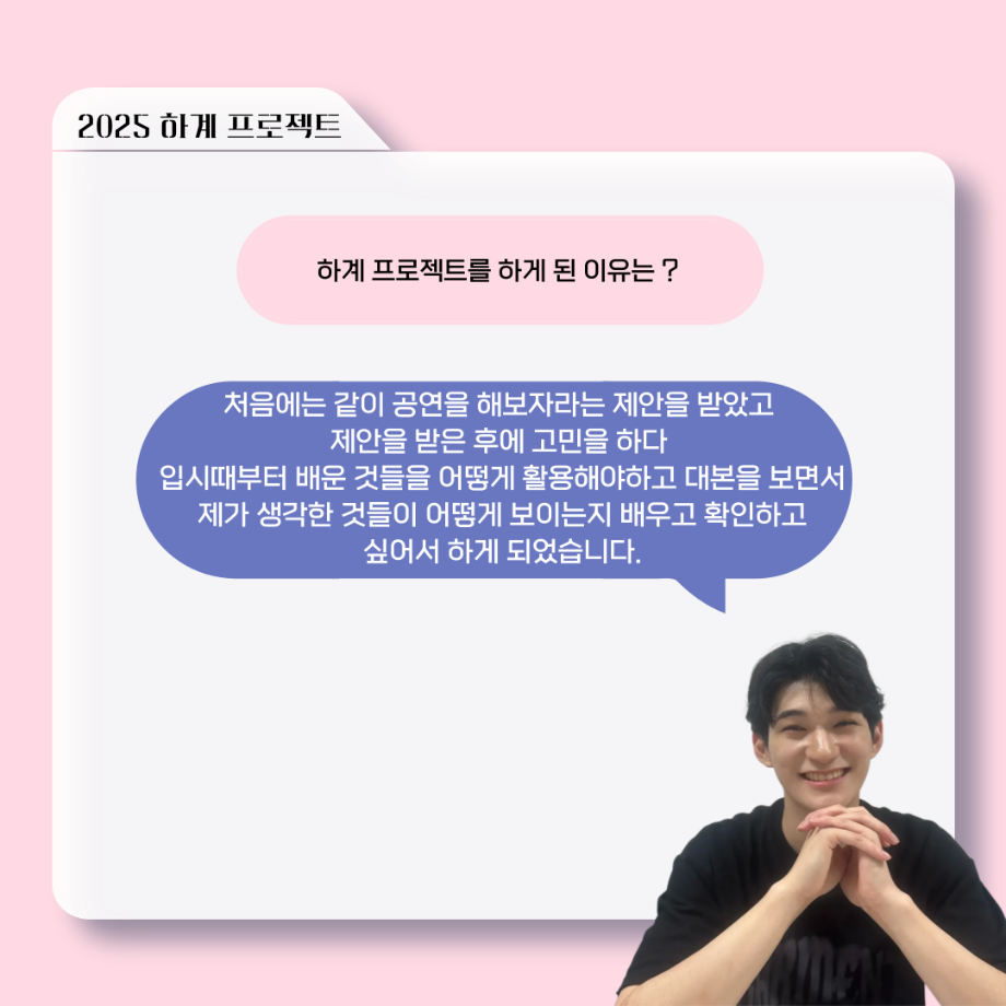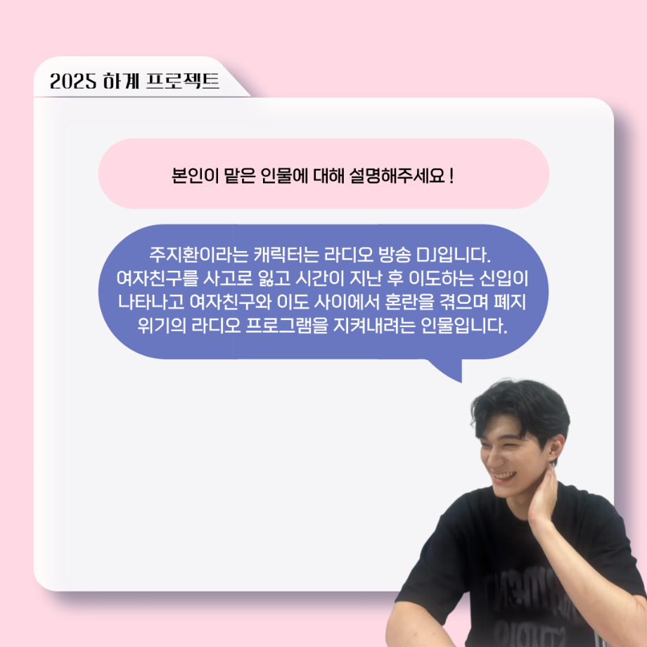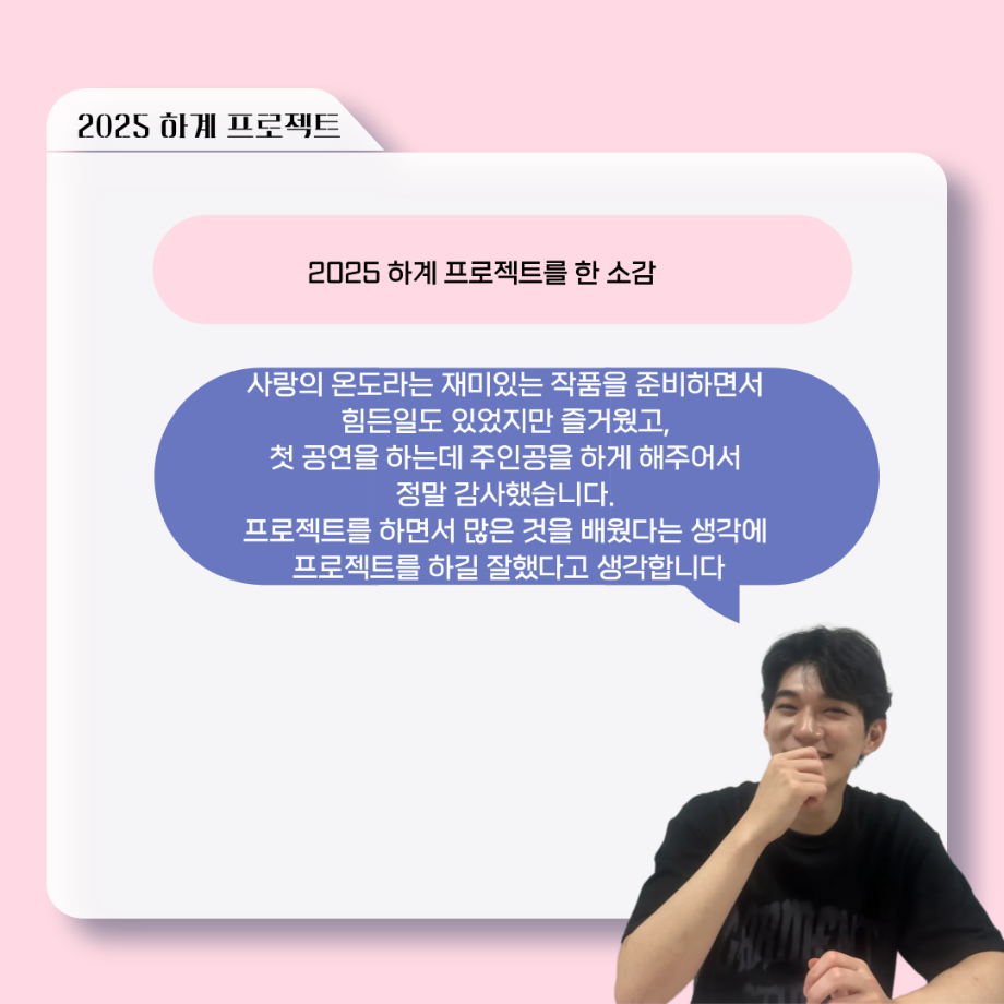 본문 시작 홈으로 커뮤니티 학과소개 입학정보 교수소개 학과과정 커뮤니티 공연예매 안내 홈페이지가이드 포토갤러리 공지사항 포토갤러리 작품DB 동아리 학사일정 학생회 포토갤러리 페이스북 트위터 프린트 ‘늘‘ 궁금한 이야기 - 하계 프로젝트 ‘사랑의 온도’팀 주지환役 < 신승현 > 연기예술학과 1155 2025-11-11 . 목록 이전‘늘‘ 궁금한 이야기 - 하계 프로젝트 ‘사랑의 온도’팀 서이도役 < 함유진 > 다음 ‘늘‘ 궁금한 이야기 - 2025 졸업작품 ‘유랑극장’ 노풍찬役 < 김은혁 > 담당부서 : 연기예술학과 담당자 : - 연락처 : 043-649-1733 최종수정일 : 2024-10-26 만족도조사 만족도 조사 이 페이지에서 제공하는 정보에 대하여 만족하시나요? 매우만족 만족 보통 불만족 매우불만족