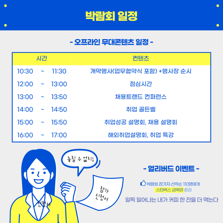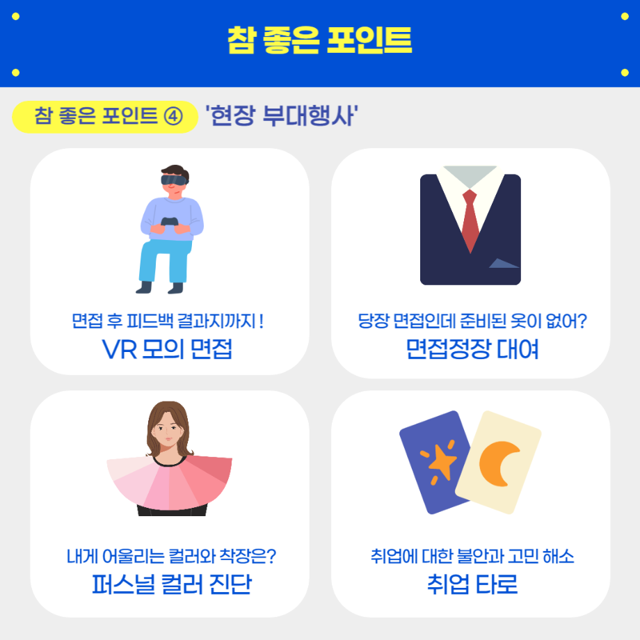 - (부대 행사) VR 모의 면접, 퍼스널 컬러진단, 캘리그라피, 취업 타로, 면접 정장 대여 등 다양한 부대 행사