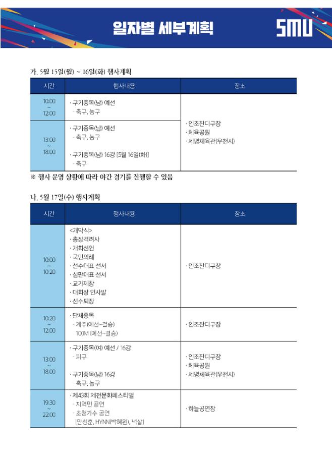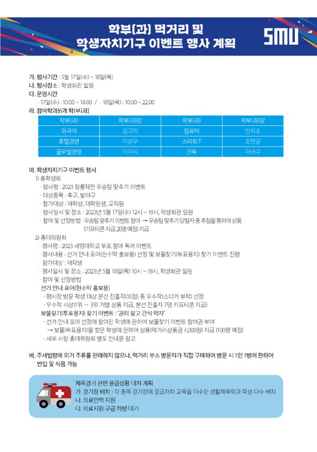 본문 시작 홈으로 학과소식 학과소개 취업정보 교육과정 학과소식 홈페이지가이드 포토갤러리 공지사항 포토갤러리 학과이야기 학과행사 포토갤러리 페이스북 트위터 프린트 세명대학교 제30회 청룡체전 회계세무학과 9177 2023-05-15 세명대학교 제30회 청룡축전!🎉 2023.05.17.(수)~19.(금) 체육대회와 더불어 먹거리 행사 및 다양한 이벤트도 함께 진행된다고 합니다😍 많은 관심과 참여 부탁드립니다!!! 목록 이전세명대학교 <등록금 책임환불제> 다음 2023학년도 세명대학교 하계방학 체류형 프로그램 개방 안내 담당부서 : 회계세무학과 담당자 : - 연락처 : 043-649-1244 최종수정일 : 2024-10-26 만족도조사 만족도 조사 이 페이지에서 제공하는 정보에 대하여 만족하시나요? 매우만족 만족 보통 불만족 매우불만족