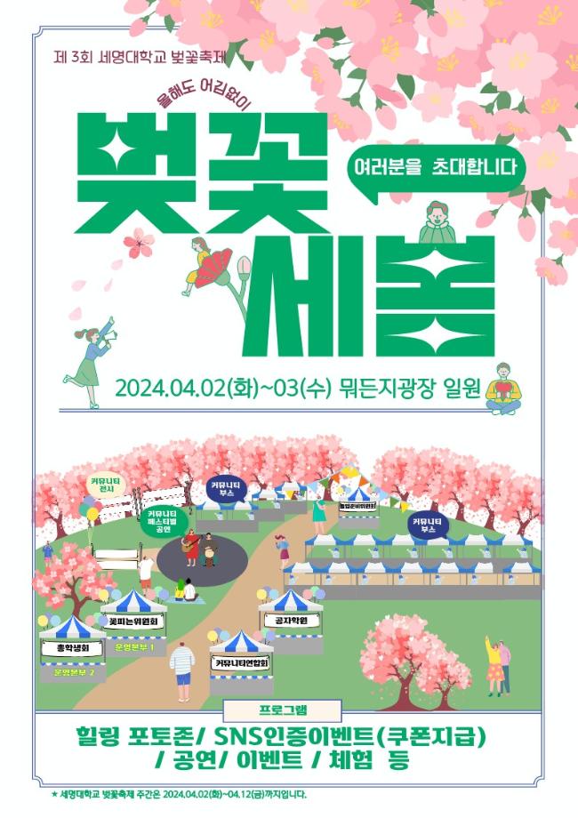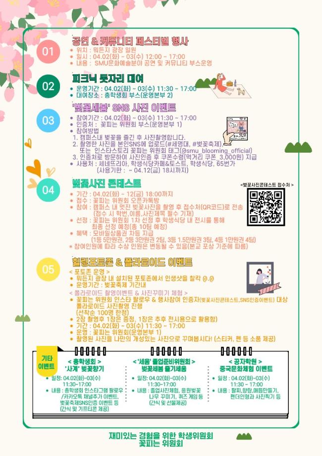 본문 시작 홈으로 학과소식 학과소개 취업정보 교육과정 학과소식 홈페이지가이드 포토갤러리 공지사항 포토갤러리 학과이야기 학과행사 포토갤러리 페이스북 트위터 프린트 🌸 제3회 벚꽃세봄 🌸 회계세무학과 1762 2024-03-29 🌸 올해도 어김없이, 제3회 벚꽃세봄 🌸 제3회 세명대학교 벚꽃축제, 벚꽃세봄에 여러분을 초대합니다! 힐링 포토존, SNS 인증 이벤트, 공연 등 다양한 프로그램과 함께 세명대학교의 벚꽃을 즐겨요🥰 💌 일자: 4월 2일(화) ~ 3일(수) 💌 장소: 뭐든지광장 일원 목록 이전제9회 커뮤니티 페스티벌 다음 [Book 콘서트] '김선태 (충TV)' Book 콘서트에 초대합니다. 담당부서 : 회계세무학과 담당자 : - 연락처 : 043-649-1244 최종수정일 : 2024-10-26 만족도조사 만족도 조사 이 페이지에서 제공하는 정보에 대하여 만족하시나요? 매우만족 만족 보통 불만족 매우불만족