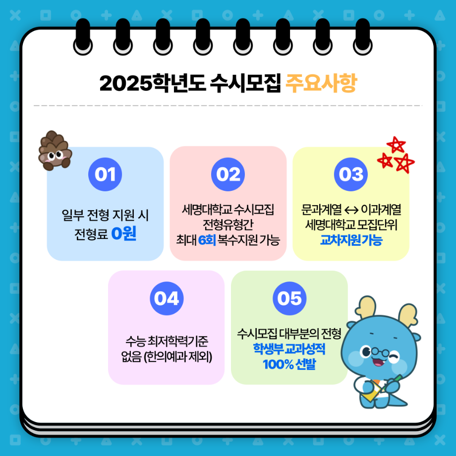 본문 시작 홈으로 학과소식 학과소개 취업정보 교육과정 학과소식 홈페이지가이드 포토갤러리 공지사항 포토갤러리 학과이야기 학과행사 포토갤러리 페이스북 트위터 프린트 세명대학교 2025학년도 수시모집 안내 회계세무학과 1454 2024-08-20 세명대학교 2025학년도 수시모집 안내 목록 이전2024 공정채용 숏폼 공모전 다음 2024학년도 세명대학교 홍보영상 담당부서 : 회계세무학과 담당자 : - 연락처 : 043-649-1244 최종수정일 : 2024-10-26 만족도조사 만족도 조사 이 페이지에서 제공하는 정보에 대하여 만족하시나요? 매우만족 만족 보통 불만족 매우불만족