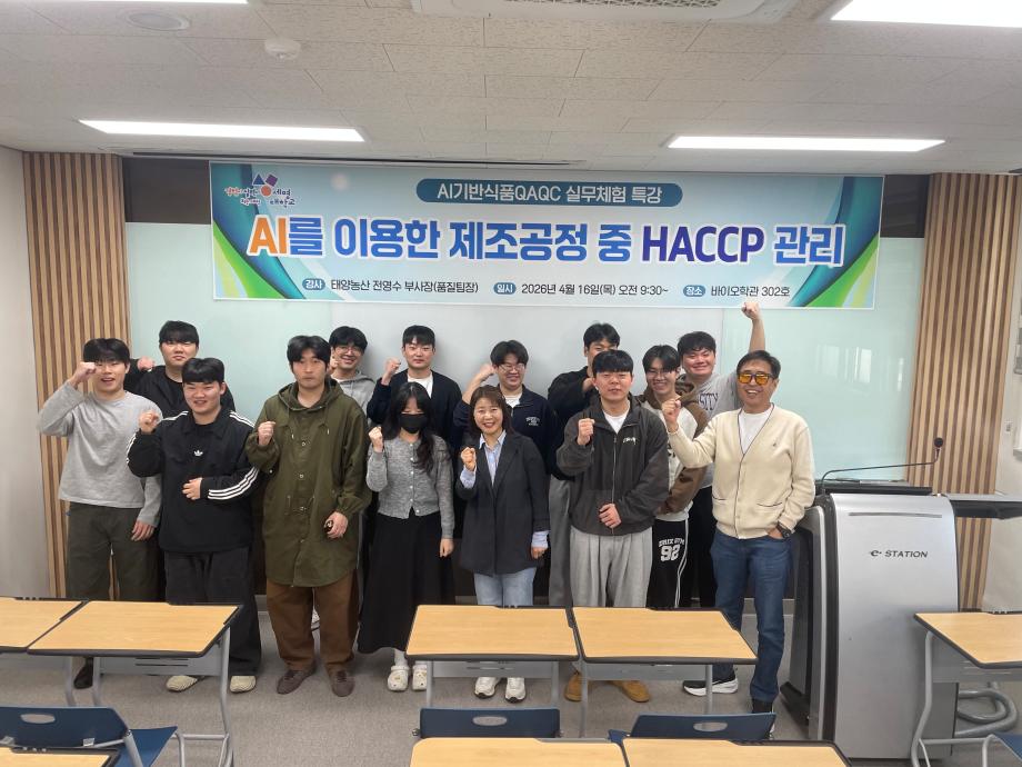 본문 시작 홈으로 커뮤니티 학부소개 진로·취업 교육과정 커뮤니티 대학원 입학상담 홈페이지가이드 갤러리 공지사항 갤러리 학생회 동문회 전공자료실 전공동아리 Youtube Instagram 갤러리 페이스북 트위터 프린트 2026학년도 1학기 실무체험 특강 (강사: 태양농산 전영수 품질팀장) 바이오식품영양학부 33 2026-04-17 목록 이전제5회 세명대학교 벚꽃축제 '벚꽃세봄' 및 제 11회 커뮤니티페스티벌 담당부서 : 바이오식품영양학부 담당자 : - 연락처 : 043-649-1430 최종수정일 : 2024-10-26 만족도조사 만족도 조사 이 페이지에서 제공하는 정보에 대하여 만족하시나요? 매우만족 만족 보통 불만족 매우불만족