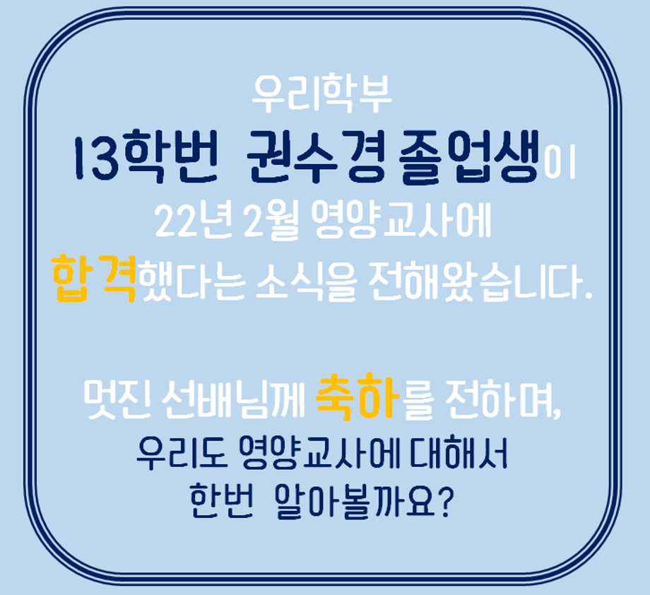 본문 시작 홈으로 커뮤니티 학부소개 진로·취업 교육과정 커뮤니티 대학원 입학상담 홈페이지가이드 갤러리 공지사항 갤러리 학생회 동문회 전공자료실 전공동아리 Youtube Instagram 갤러리 페이스북 트위터 프린트 13학번 권수경 영양교사 합격 바이오식품영양학부 2211 2022-05-23 13학번 권수경 졸업생 영양교사 합격 목록 이전2022 새내기 두드림 다음 2022 식품관련 뉴스 담당부서 : 바이오식품영양학부 담당자 : - 연락처 : 043-649-1430 최종수정일 : 2024-10-26 만족도조사 만족도 조사 이 페이지에서 제공하는 정보에 대하여 만족하시나요? 매우만족 만족 보통 불만족 매우불만족