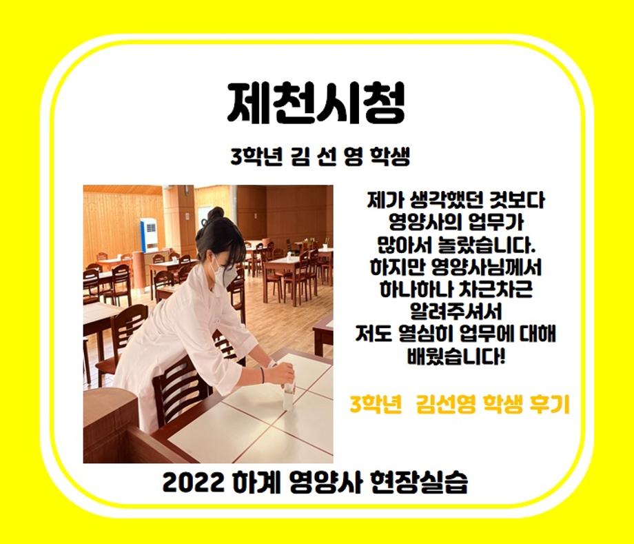 본문 시작 홈으로 커뮤니티 학부소개 진로·취업 교육과정 커뮤니티 대학원 입학상담 홈페이지가이드 갤러리 공지사항 갤러리 학생회 동문회 전공자료실 전공동아리 Youtube Instagram 갤러리 페이스북 트위터 프린트 2022 하계영양사 현장실습(제천시청) 바이오식품영양학부 2035 2022-07-13 목록 이전2022 하계영양사 현장실습(세명고등학교) 다음 2022 하계영양사 현장실습(동일여자고등학교) 담당부서 : 바이오식품영양학부 담당자 : - 연락처 : 043-649-1430 최종수정일 : 2024-10-26 만족도조사 만족도 조사 이 페이지에서 제공하는 정보에 대하여 만족하시나요? 매우만족 만족 보통 불만족 매우불만족