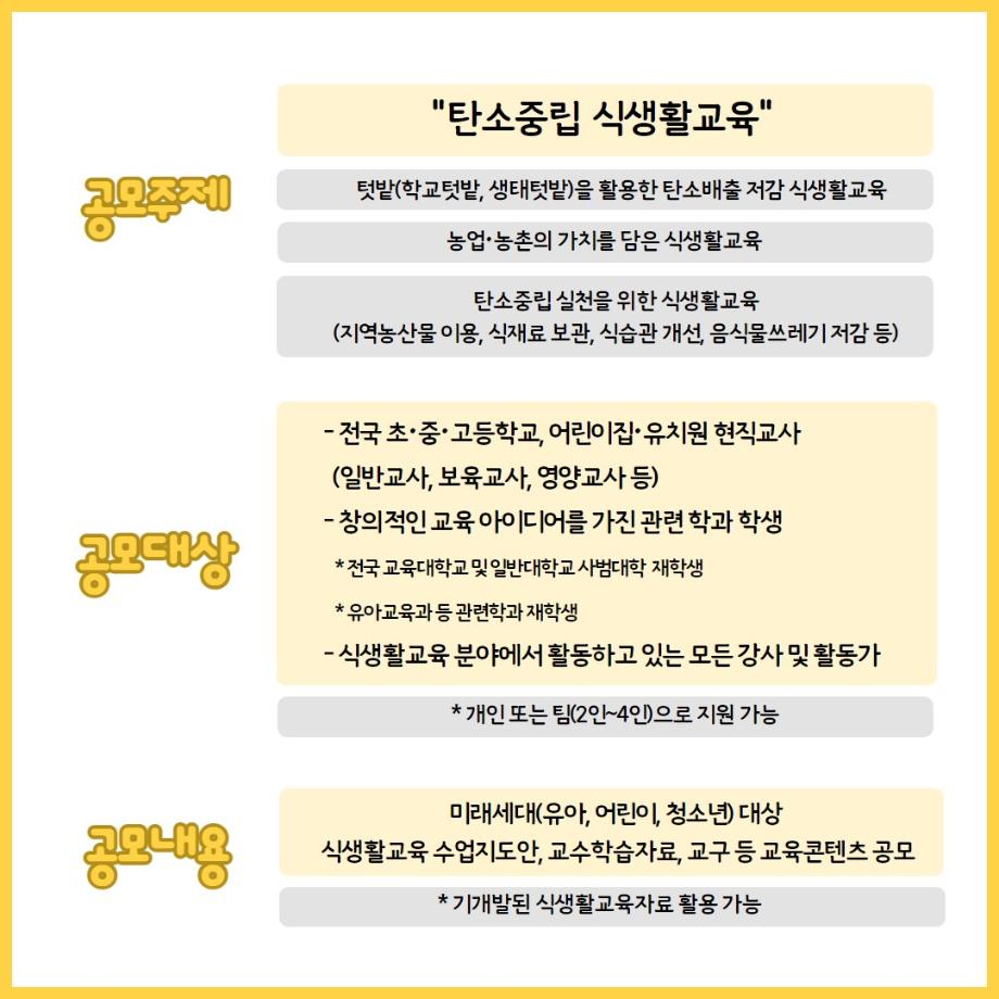 "탄소중립 식생활교육" 이라는 주제로 미래세대를 대상👧🏻👦🏻으로 하는 식생활교육 콘텐츠를 공모하는 공모전인데요~