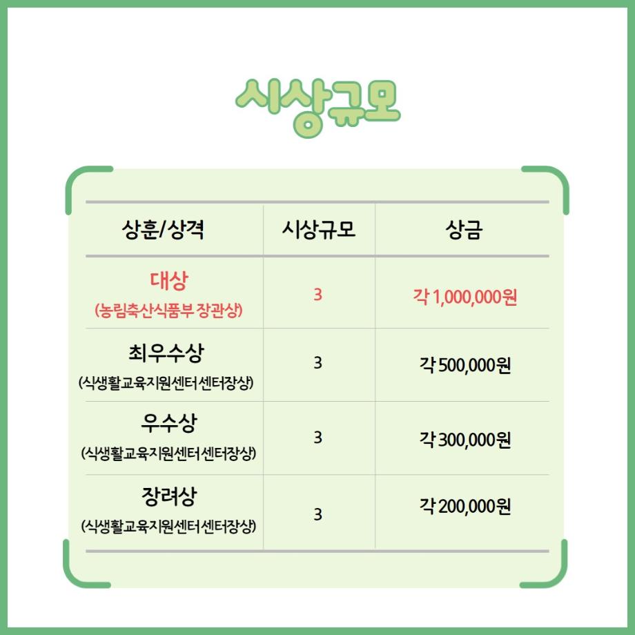 현직교사, 창의적인 교육 아이디어를 보여줄 수 있는 대학생, 식생활교육 강사를 대상으로 하며, 대상은 농림축산식품부장관상을 수여합니다!👍🏻