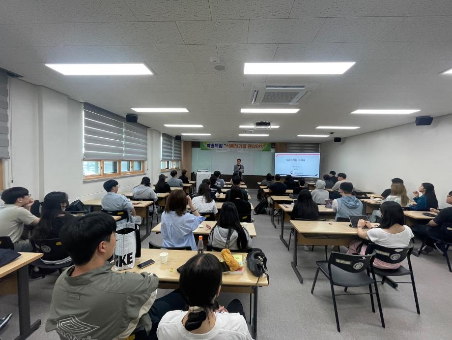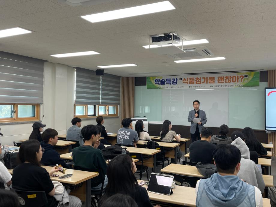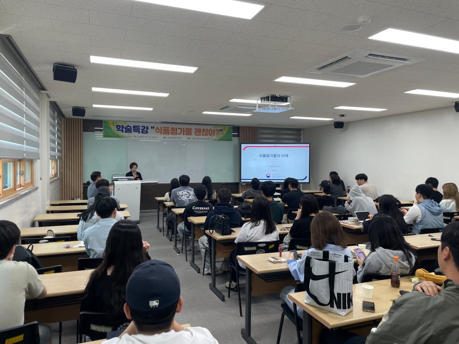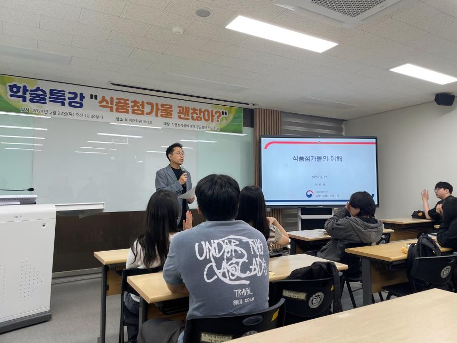 본문 시작 홈으로 커뮤니티 학부소개 진로·취업 교육과정 커뮤니티 대학원 입학상담 홈페이지가이드 갤러리 공지사항 갤러리 학생회 동문회 전공자료실 전공동아리 Youtube Instagram 갤러리 페이스북 트위터 프린트 2024학년도 1학기 학술특강(강사: 식품의약품안전평가원 남혜선 연구관님) 바이오식품영양학부 2605 2024-05-28 2024학년도 1학기 학술특강(식품첨가물학)을 진행하였습니다. 1. 일시: 5월 23일(목) 오전 10시 30분 2. 장소: 바이오학관 301호 식품의약품안전평가원 남혜선 연구관님을 강사로 모신 본 특강에는 총 49명(교원: 3명, 학생: 46명)이 참석하였고, 특강을 통해 최신화 된 식품첨가물 기준 및 현황과 미래 산업 방향 등을 알아볼 수 있었으며 질의응답 시간을 통하여 평소 가졌던 실제적인 궁금증들을 해결할 수 있었습니다. 목록 이전[수상안내]한국식품영양학회 춘계학술대회 우수포스터상 수상 다음 비교과특강 'Alot를 활용한 디지털바이오헬스케어' 담당부서 : 바이오식품영양학부 담당자 : - 연락처 : 043-649-1430 최종수정일 : 2024-10-26 만족도조사 만족도 조사 이 페이지에서 제공하는 정보에 대하여 만족하시나요? 매우만족 만족 보통 불만족 매우불만족