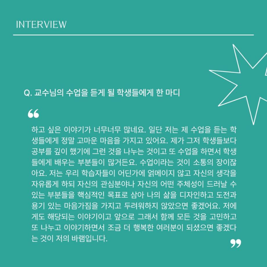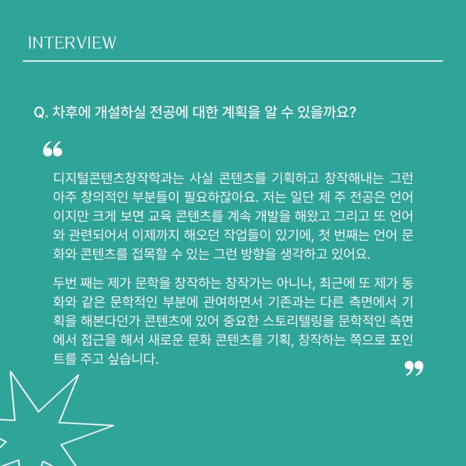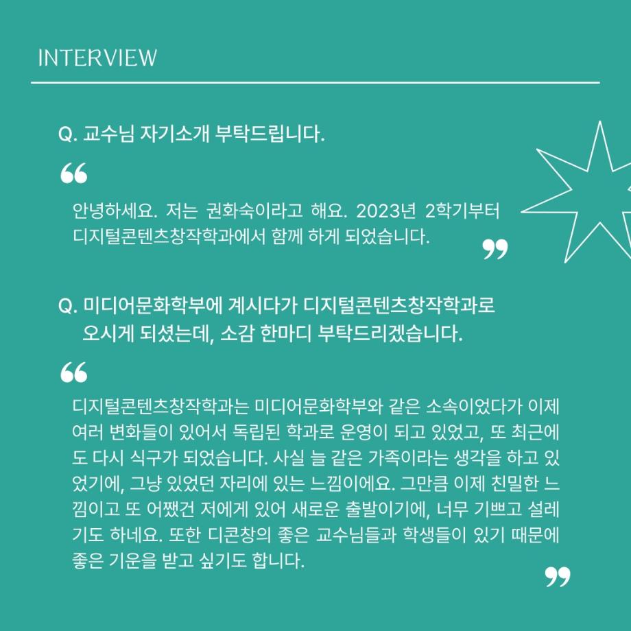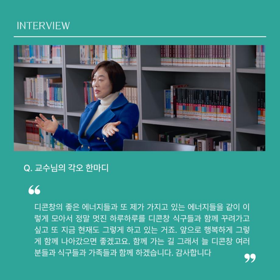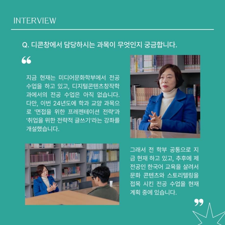 본문 시작 홈으로 MCC News 학과소개 교수소개 학과과정 MCC News MCC SNS 홈페이지가이드 교수 및 졸업생 학과 및 재학생 교수 및 졸업생 미디어 정보통 교수 및 졸업생 페이스북 트위터 프린트 디지털콘텐츠창작학과 권화숙 교수님 인터뷰 📸 디지털콘텐츠창작학과 2626 2024-04-17 작년 2023년 2학기부터 디지털콘텐츠창작학과로 오시게 된 권화숙 교수님을 모시고 인터뷰를 진행하였습니다! 권교수님의 각오와 향후 계획에 대한 이야기를 함께 들어봐요 😚 목록 이전세명대 김기태 교수와 디자인인포 박재원 대표, 9년째 장학금 기탁 다음 디지털콘텐츠창작학과 김기태 교수님 인터뷰 📸 담당부서 : 미디어콘텐츠창작학과 담당자 : - 연락처 : 043-649-1741 최종수정일 : 2024-10-26 만족도조사 만족도 조사 이 페이지에서 제공하는 정보에 대하여 만족하시나요? 매우만족 만족 보통 불만족 매우불만족