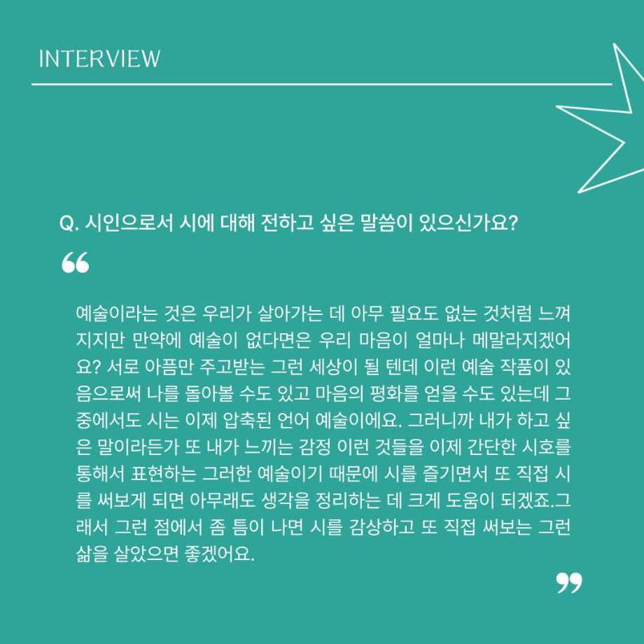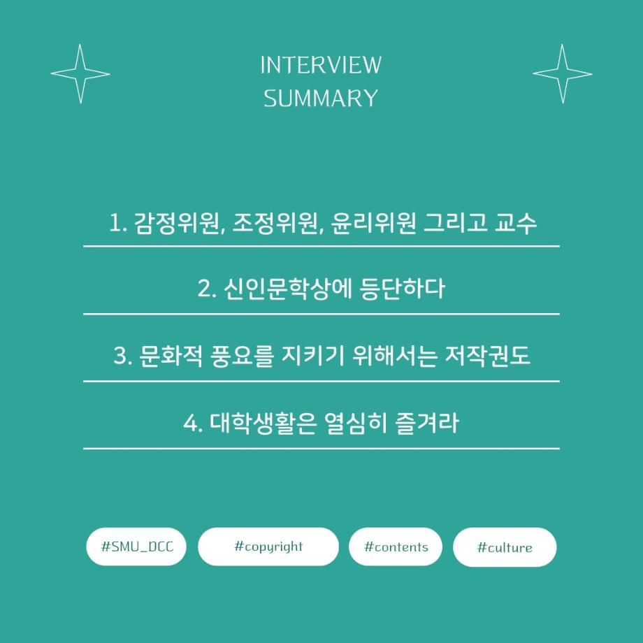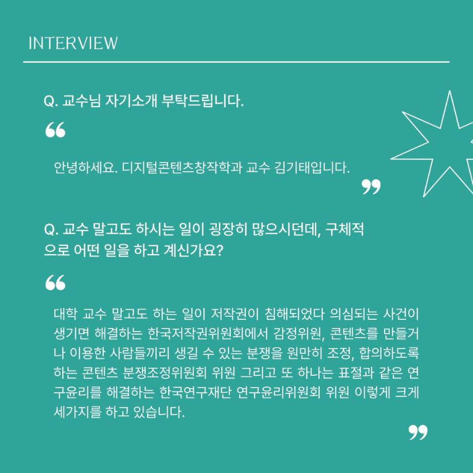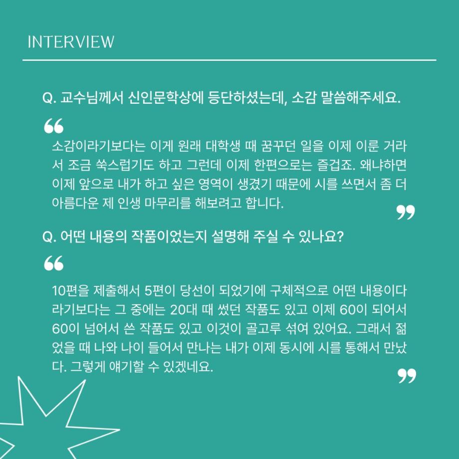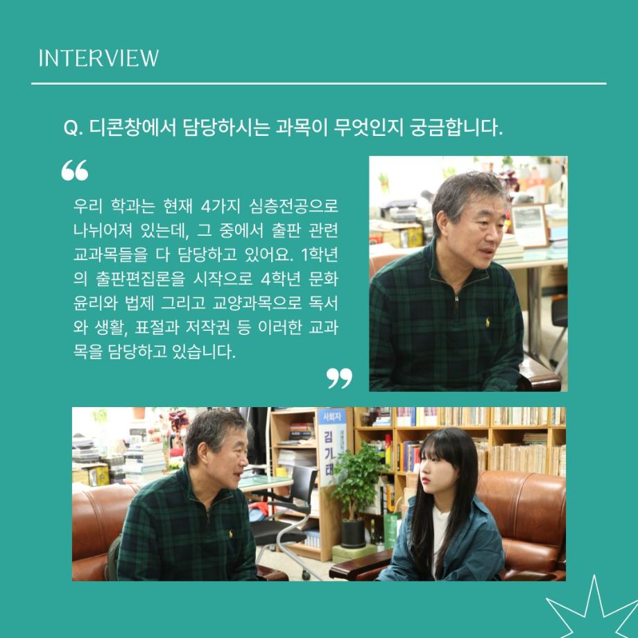 본문 시작 홈으로 MCC News 학과소개 교수소개 학과과정 MCC News MCC SNS 홈페이지가이드 교수 및 졸업생 학과 및 재학생 교수 및 졸업생 미디어 정보통 교수 및 졸업생 페이스북 트위터 프린트 디지털콘텐츠창작학과 김기태 교수님 인터뷰 📸 디지털콘텐츠창작학과 2463 2024-04-24 한국 저작권에서 빼놓을 수 없는 인물이자 중견 문예지 ‘계간 시현실’에 2024 신인문학상에 당선되어 신인 시인이 되신 김기태 교수님을 모시고 인터뷰했습니다. 다양한 활동을 해오신 김기태 교수님의 한 말씀 우리 함께 들어봐요! 목록 이전디지털콘텐츠창작학과 권화숙 교수님 인터뷰 📸 다음 📚디지털콘텐츠창작학과 권화숙 교수님 저자 동화책 소개📚 담당부서 : 미디어콘텐츠창작학과 담당자 : - 연락처 : 043-649-1741 최종수정일 : 2024-10-26 만족도조사 만족도 조사 이 페이지에서 제공하는 정보에 대하여 만족하시나요? 매우만족 만족 보통 불만족 매우불만족