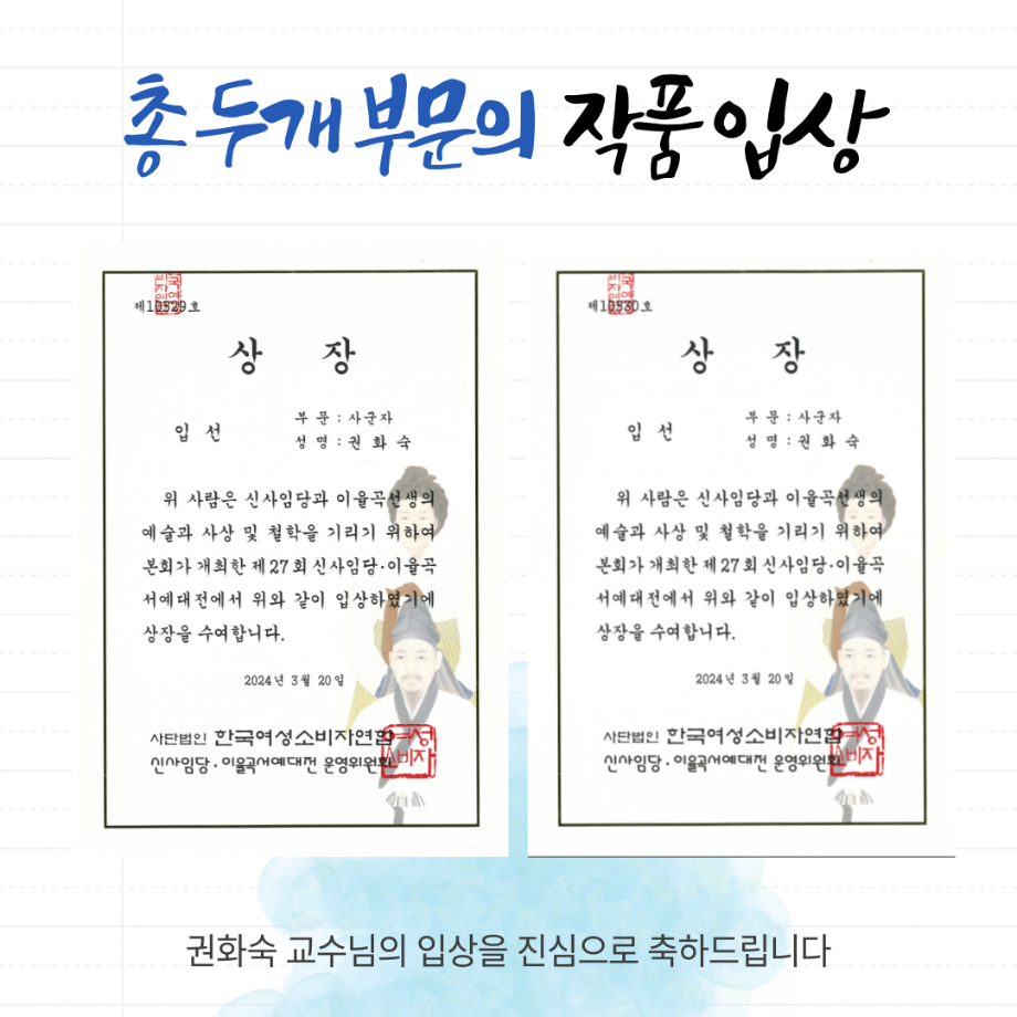 본문 시작 홈으로 MCC News 학과소개 교수소개 학과과정 MCC News MCC SNS 홈페이지가이드 교수 및 졸업생 학과 및 재학생 교수 및 졸업생 미디어 정보통 교수 및 졸업생 페이스북 트위터 프린트 🎊권화숙 교수님의 제27회 신사임당 이율곡 서예대전 입선🎊 디지털콘텐츠창작학과 2626 2024-08-19 디지털콘텐츠창작학과 권화숙 교수님께서제27회 신사임당 이율곡 서예대전에서 입상하셨습니다! 권화숙 교수님께서 지난 3월에 개최된 서예대전에서 입상하셨는데요, 총 두 개의 아름다운 솜씨가 돋보이는 작품으로 당당하게 입선하셨습니다! 진심으로 축하드립니다! 목록 이전권화숙 교수님의 5월 신간 소개 다음 권화숙 교수님의 동시집 '음식 말놀이'를 소개합니다! 담당부서 : 미디어콘텐츠창작학과 담당자 : - 연락처 : 043-649-1741 최종수정일 : 2024-10-26 만족도조사 만족도 조사 이 페이지에서 제공하는 정보에 대하여 만족하시나요? 매우만족 만족 보통 불만족 매우불만족
