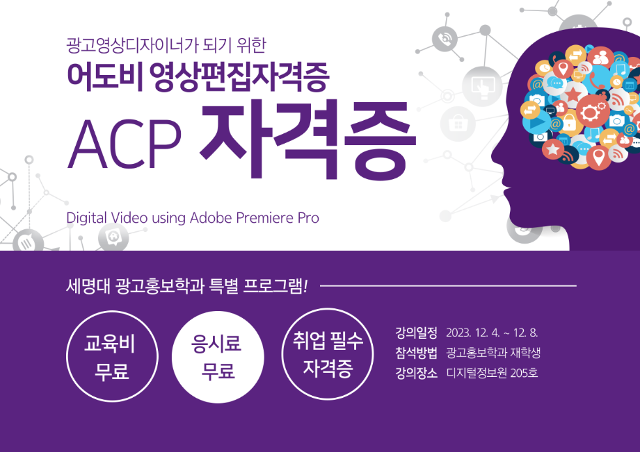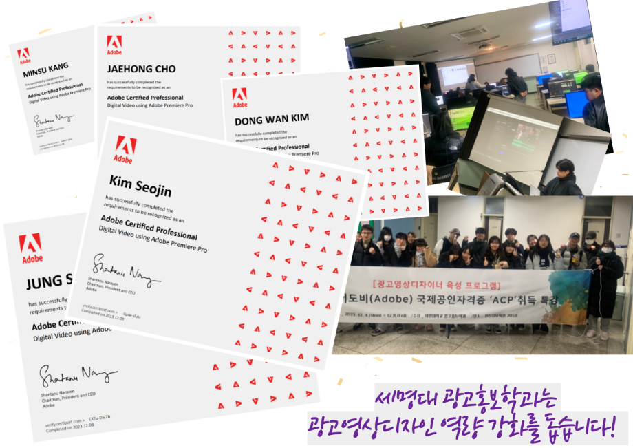 본문 시작 홈으로 특별CC프로그램 매력적인 학과소개 흥미로운 교육과정 특별CC프로그램 We can 취업 따뜻한 커뮤니티 홈페이지가이드 광고디자인 자격증취득 광고영상 제작실습 광고디자인 자격증취득 C&E(도전!경험!) 광고디자인 자격증취득 페이스북 트위터 프린트 [경축]광고영상제작편집 자격증 전원 취득 광고홍보학과 1911 2024-01-04 광고홍보학과에서 지원하는 광고영상디자인 역량 강화 프로그램 어도비( Adobe) 국제 공인 자격증 ACP 전원 취득을 축하합니다! 목록 이전Adobe Premier Pro 자격증 취득 다음 Adobe 포토샵 자격증 전원 합격